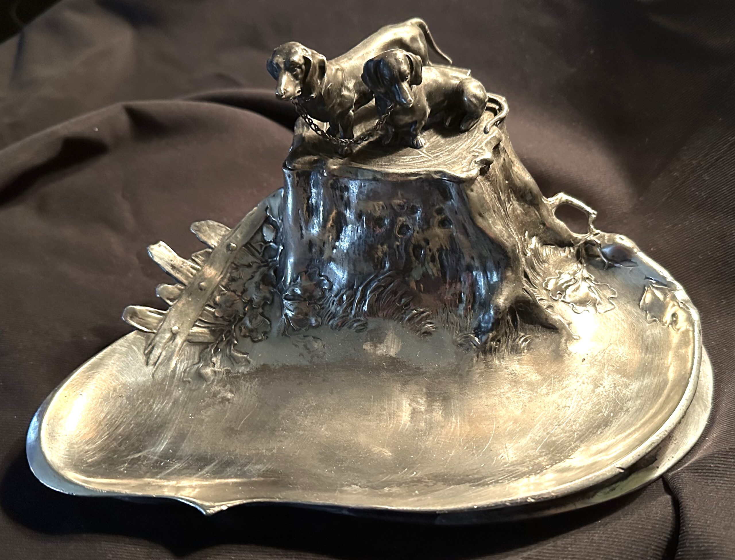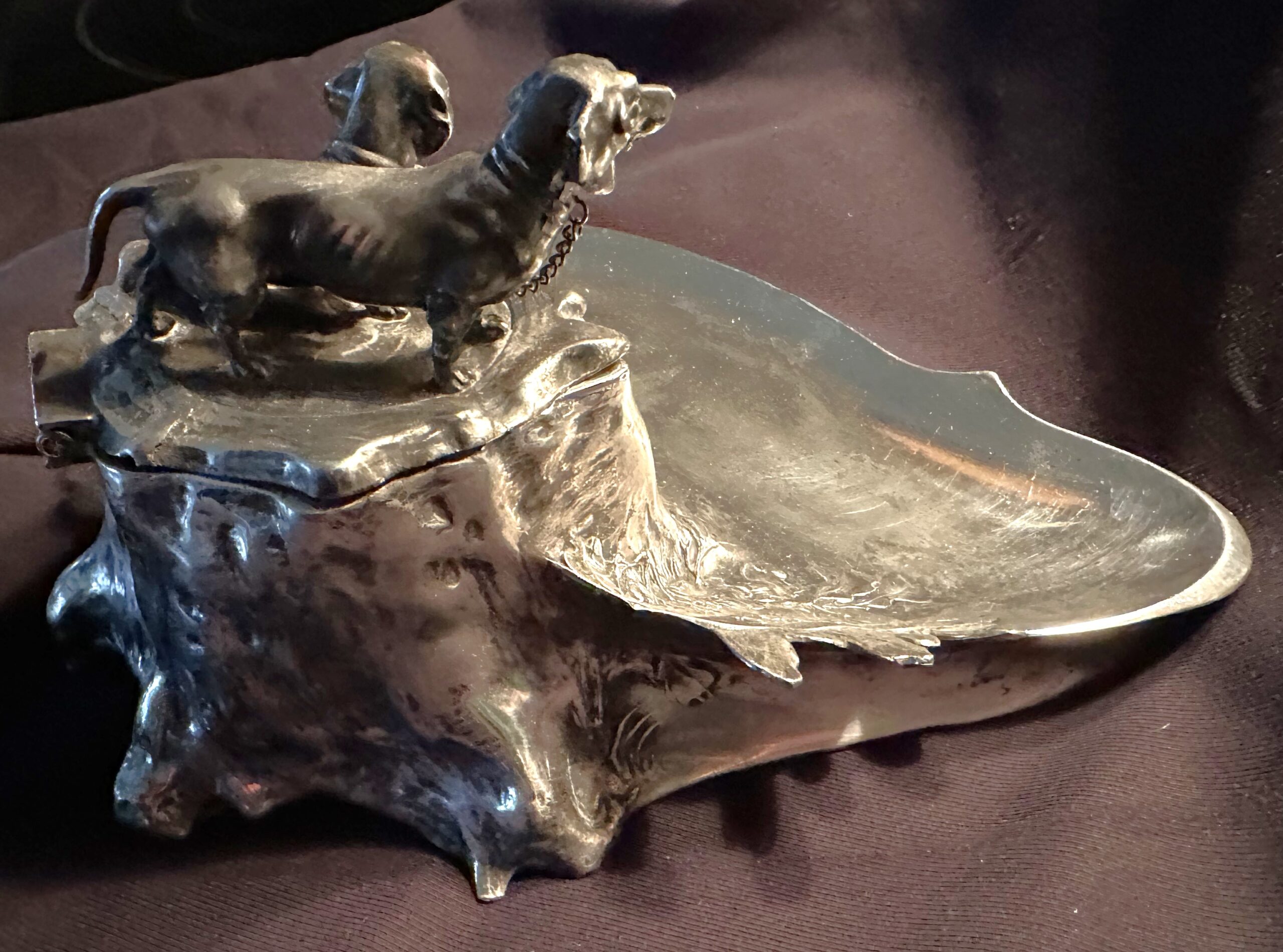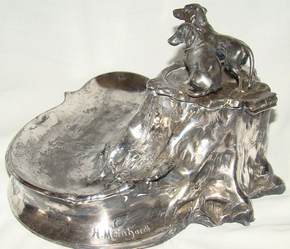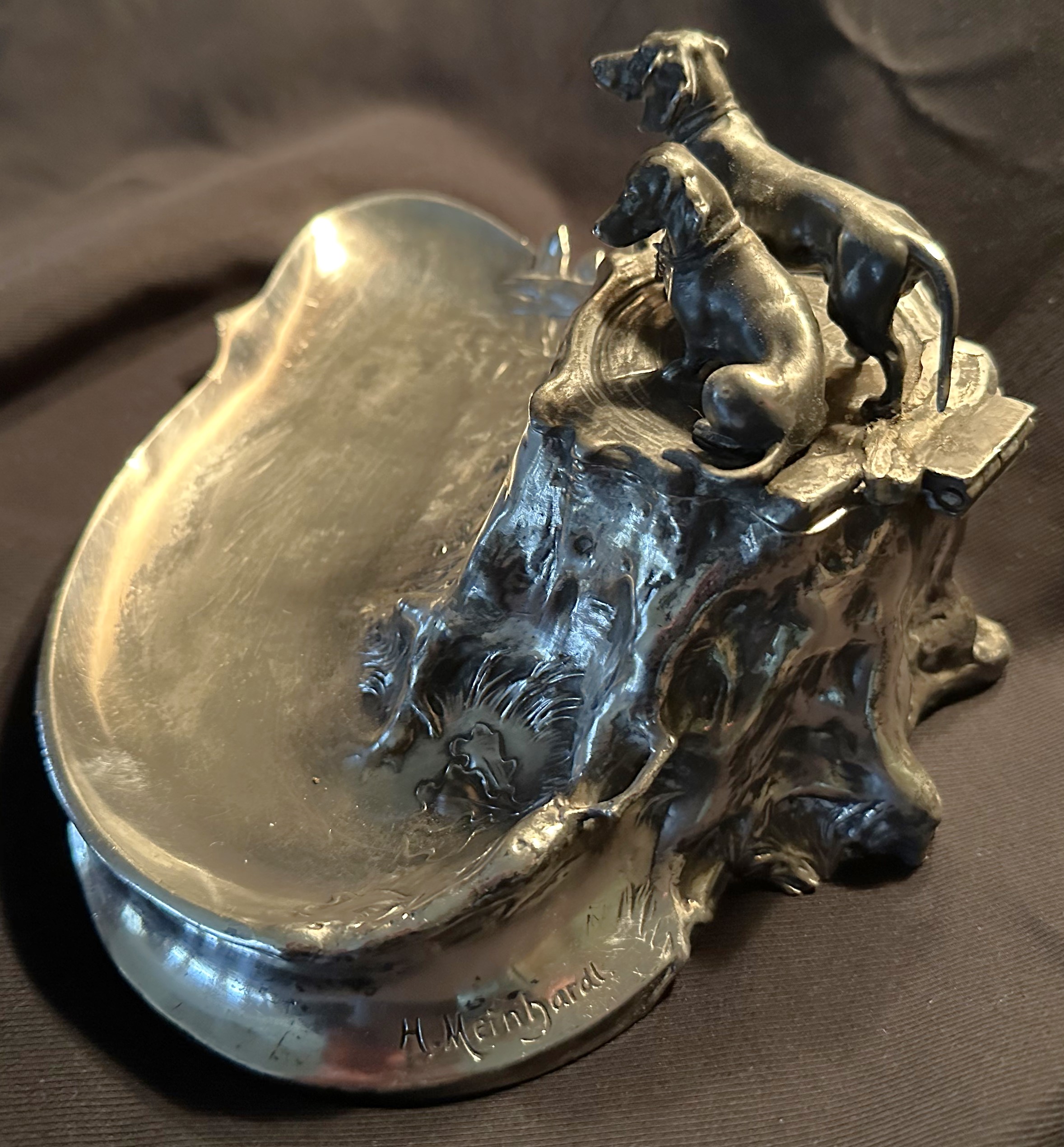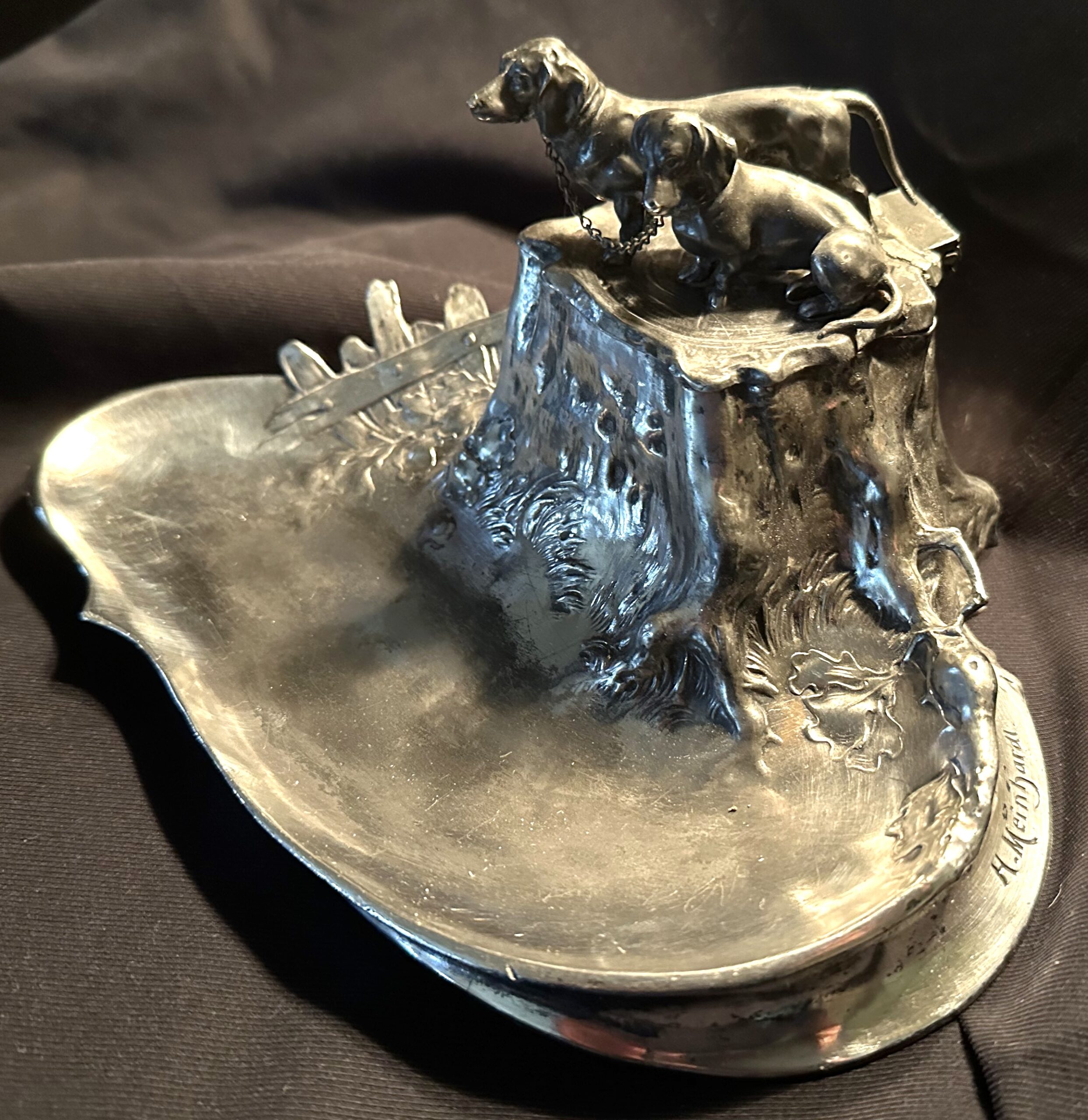 This naturalistic work features two dachshunds resting on a stump covered with foliage and vines. The form of the piece is flowing, creating an area to hold pens and other desk paraphernalia that looks like a body of water (silver plating worn). The base is signed along the lower edge “H. Meinhardt”.