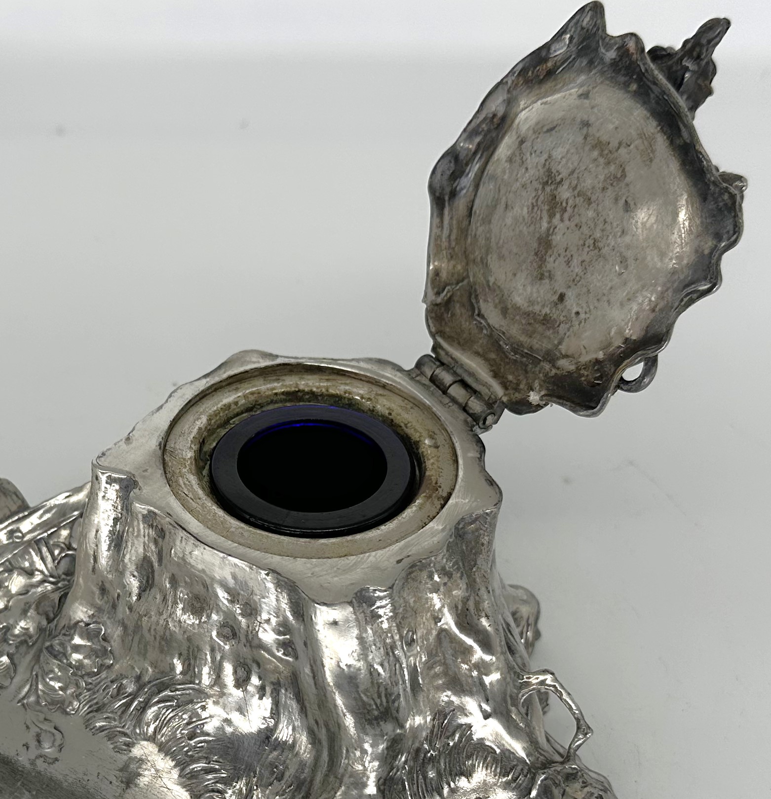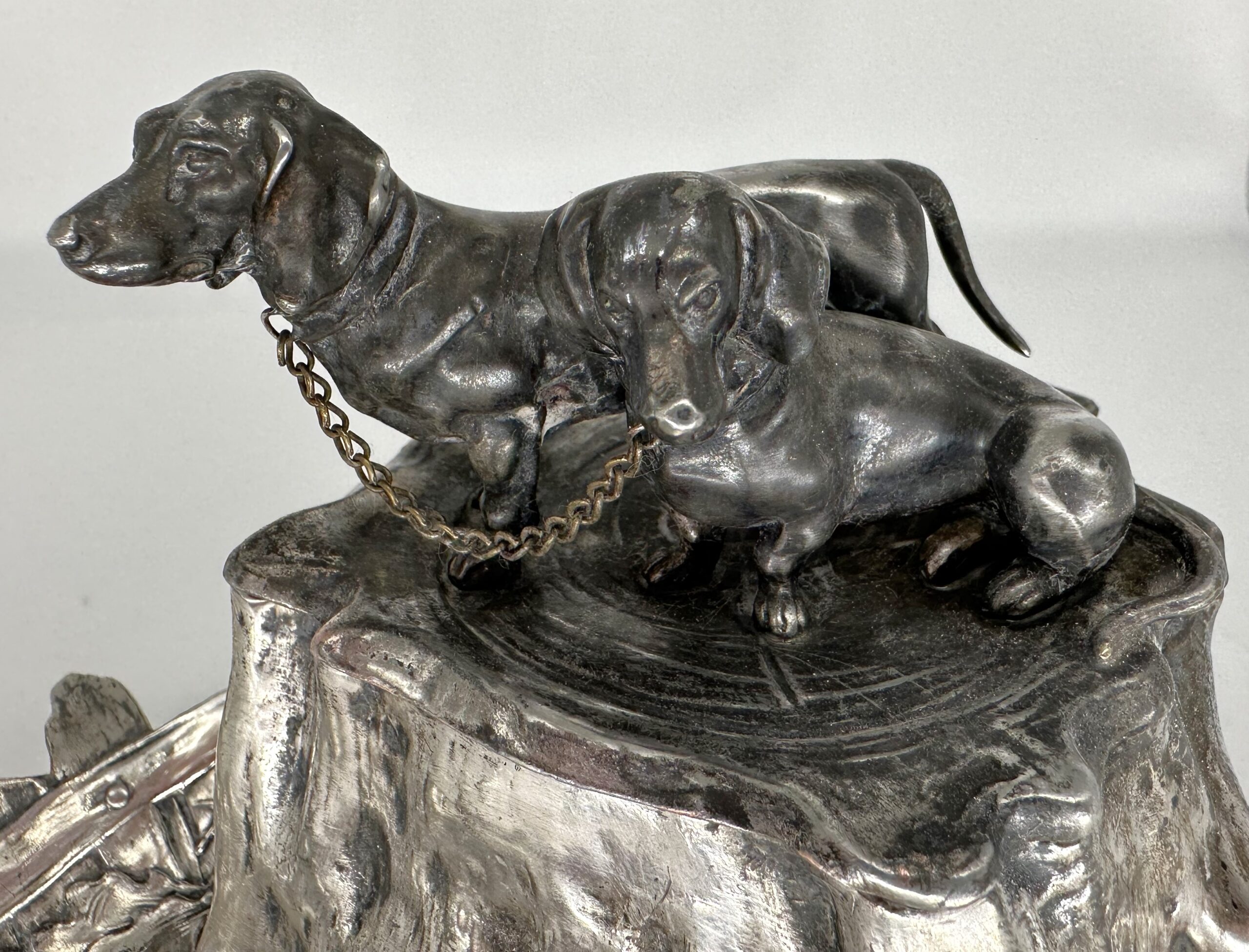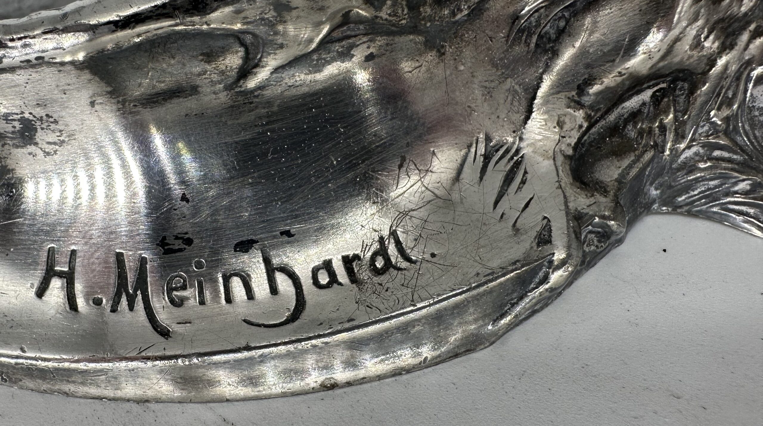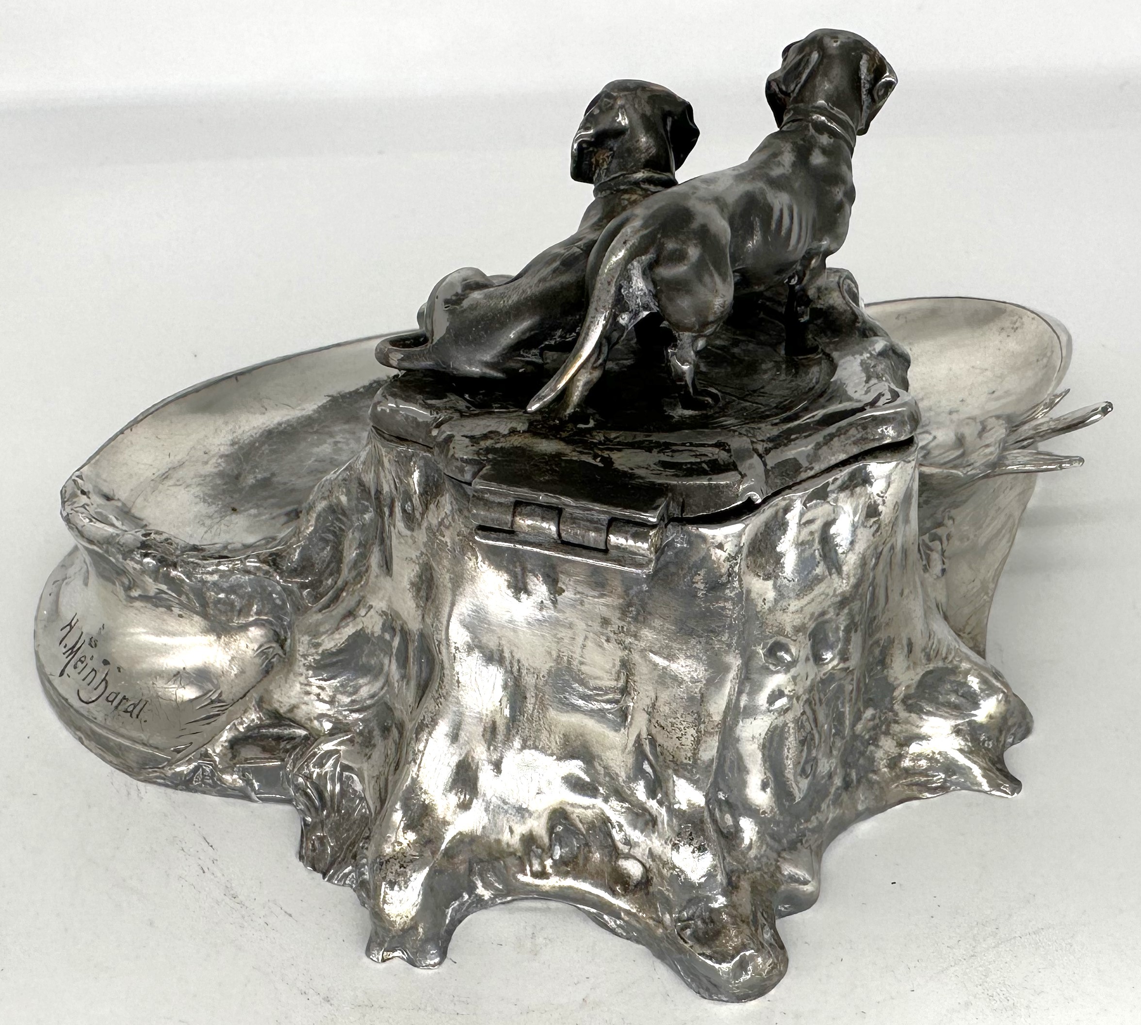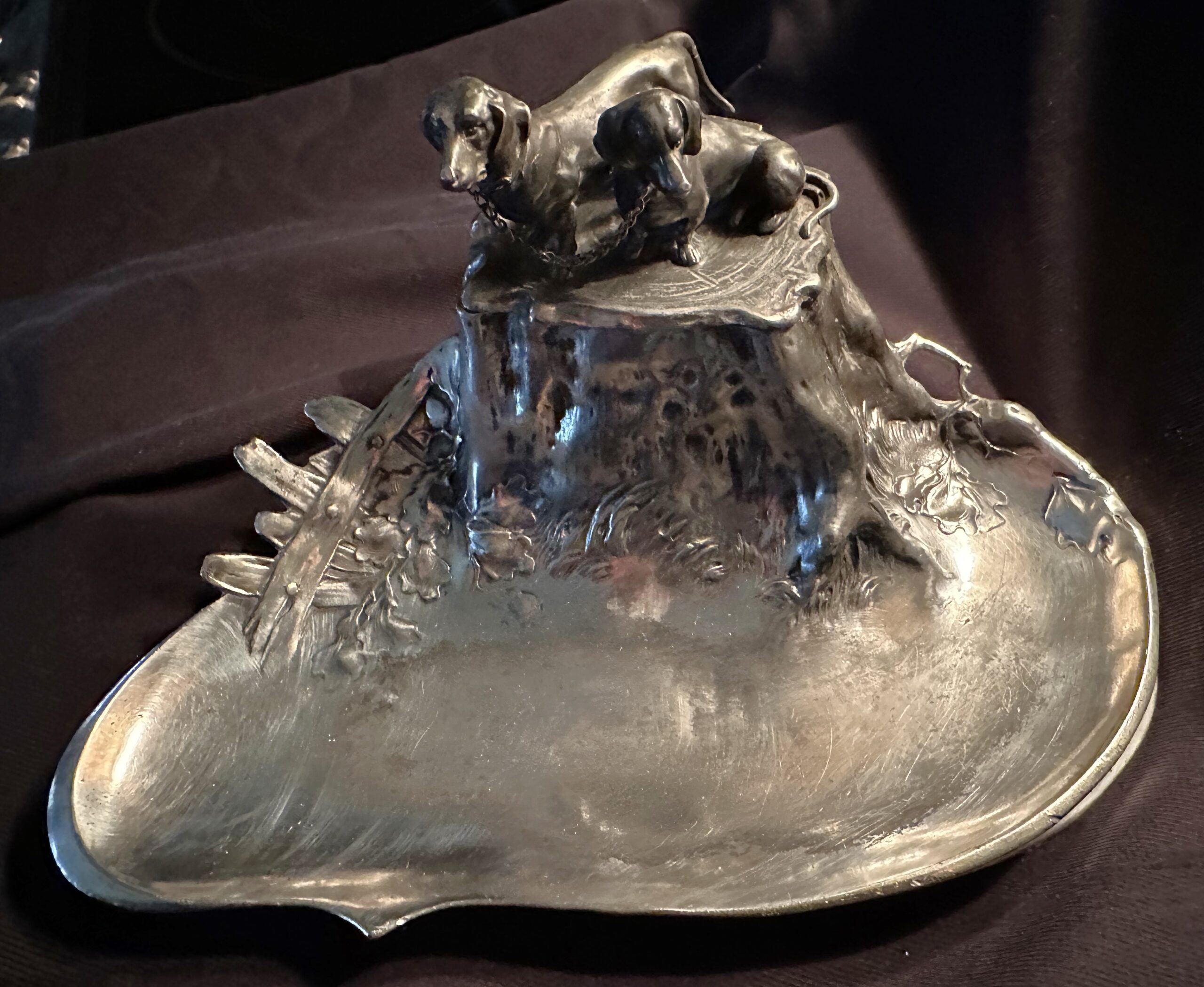 This naturalistic work features two dachshunds resting on a stump covered with foliage and vines. The form of the piece is flowing, creating an area to hold pens and other desk paraphernalia that looks like a body of water (silver plating worn). The base is signed along the lower edge “H. Meinhardt”.