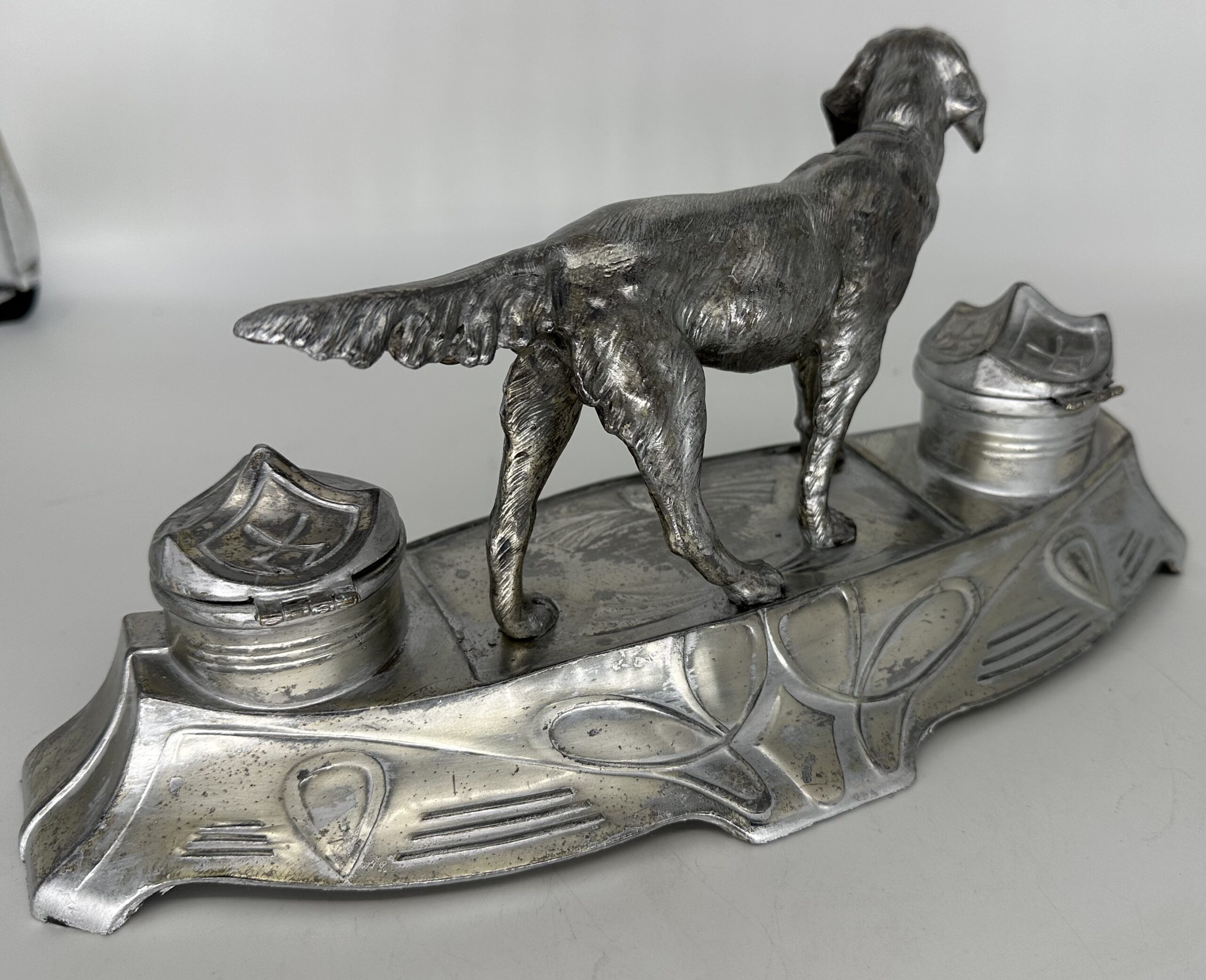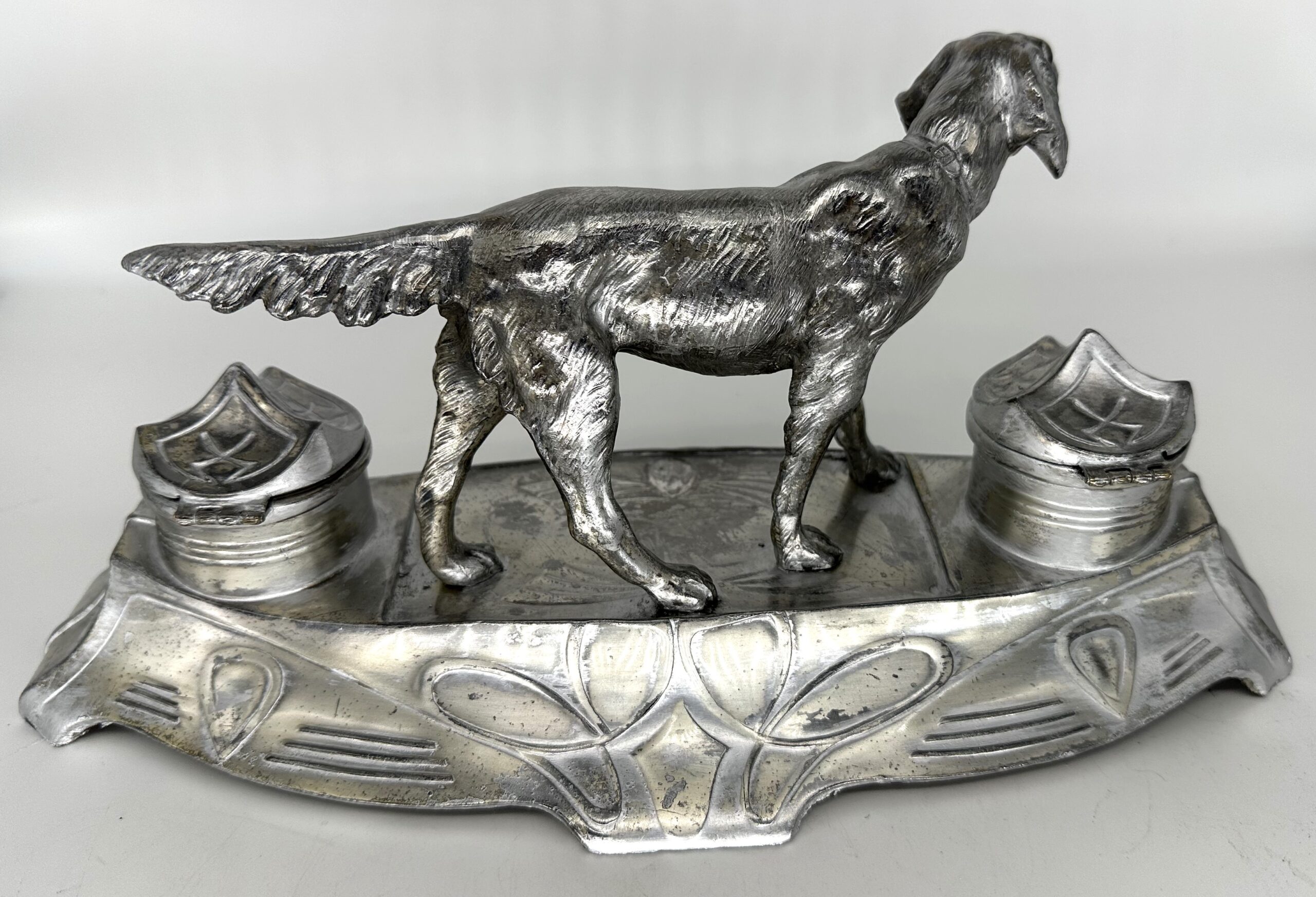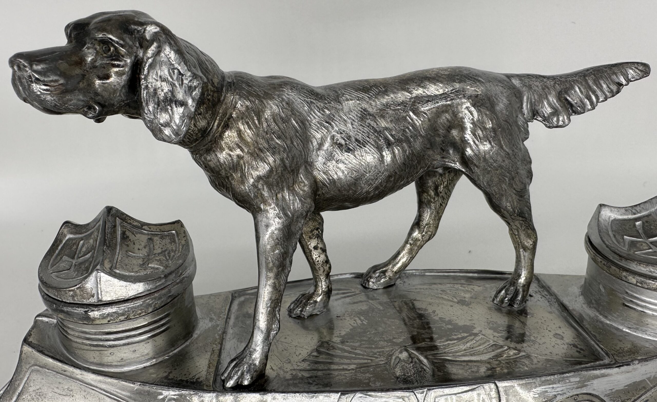 Silverplated inkstand features a retriever standing between two hinged-covered inkwells and above a pen tray.