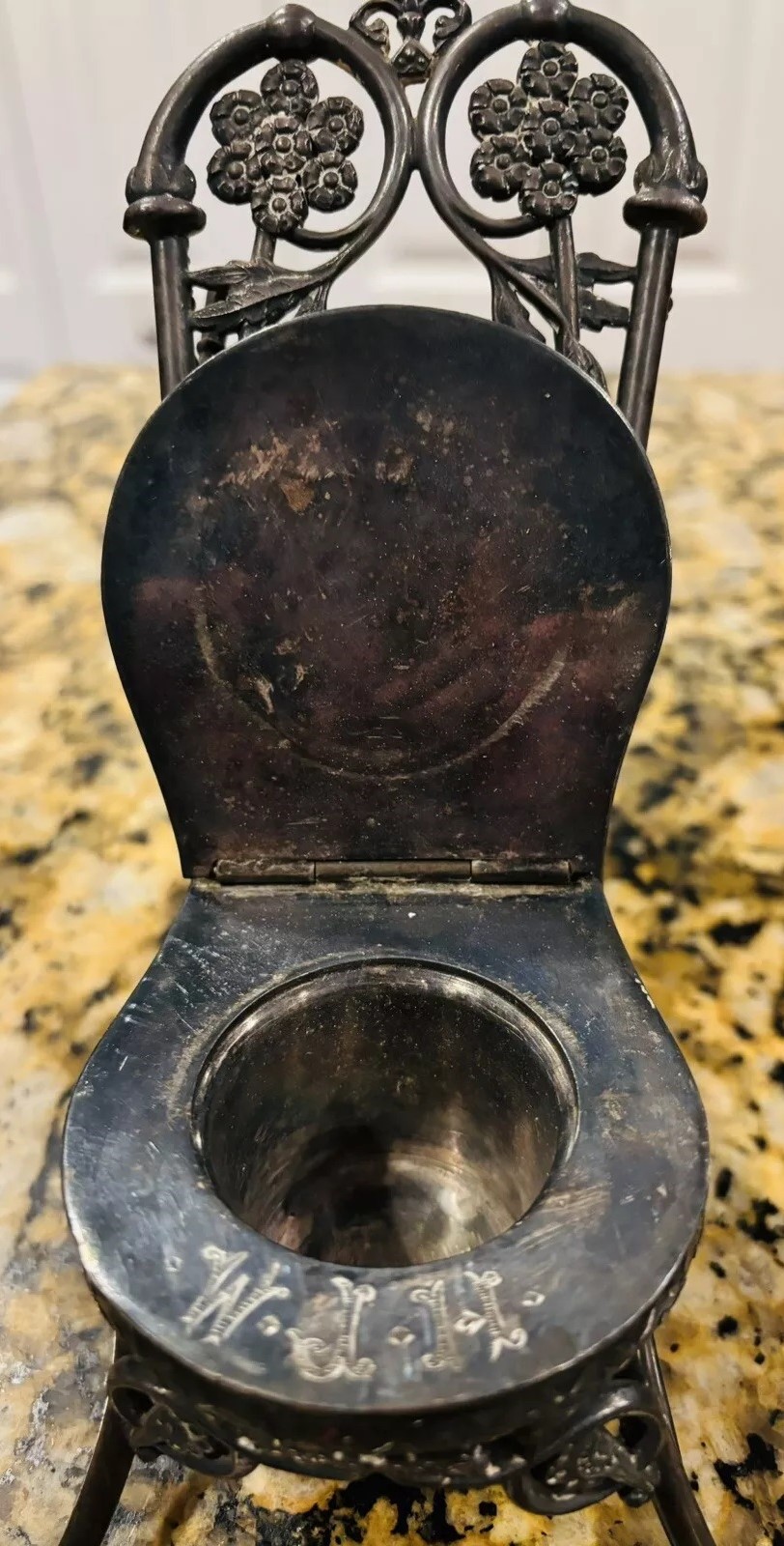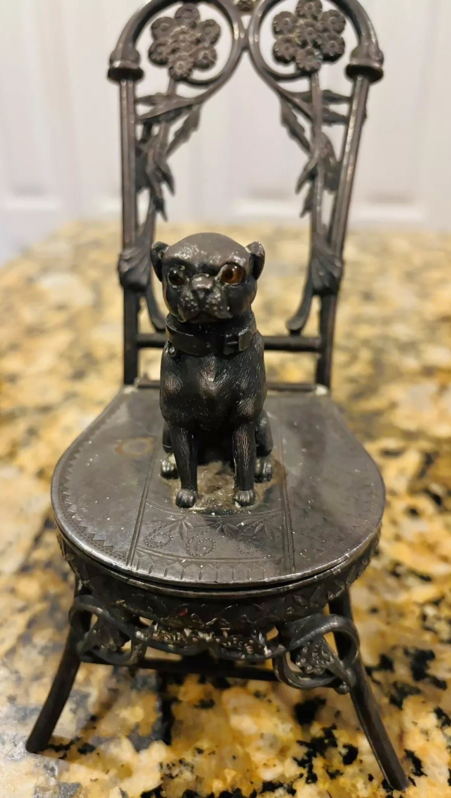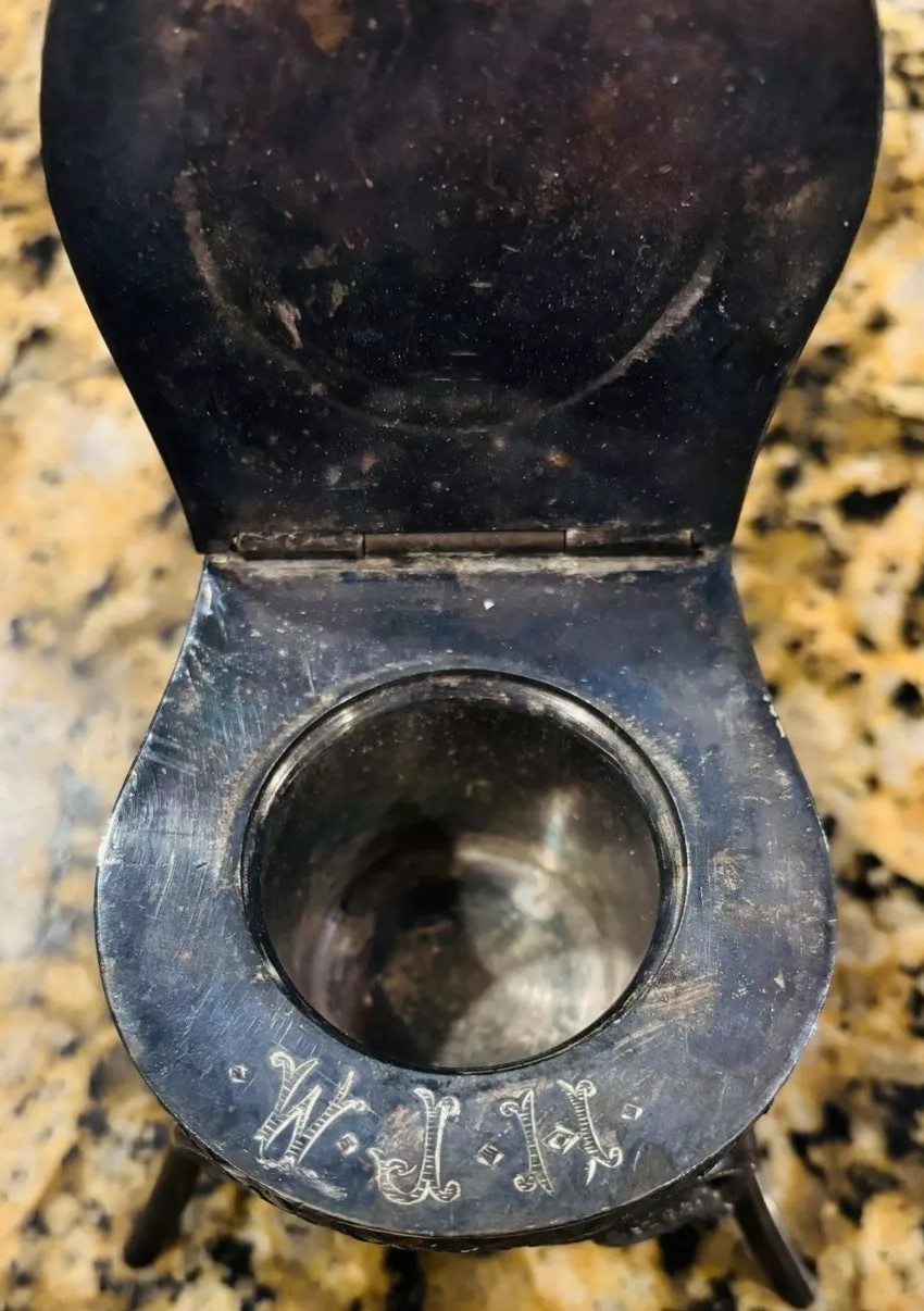 This silver-plated inkwell features a dog, likely a pug, with expressive glass eyes. The dog is seated on a chair with a wrought iron frame, reminiscent of a chair in an ice cream parlor. This chair is part of the inkwell structure, crafted by the Meriden Silver Plate Co. The seat of the chair is hinged – the dog serves as the finial to push open the lid to access the inkwell. The piece is marked “Meriden Silver Plate Co.” along with a lion symbol and numbered 2511. Monogrammed under the lid, the insert is missing from this piece.