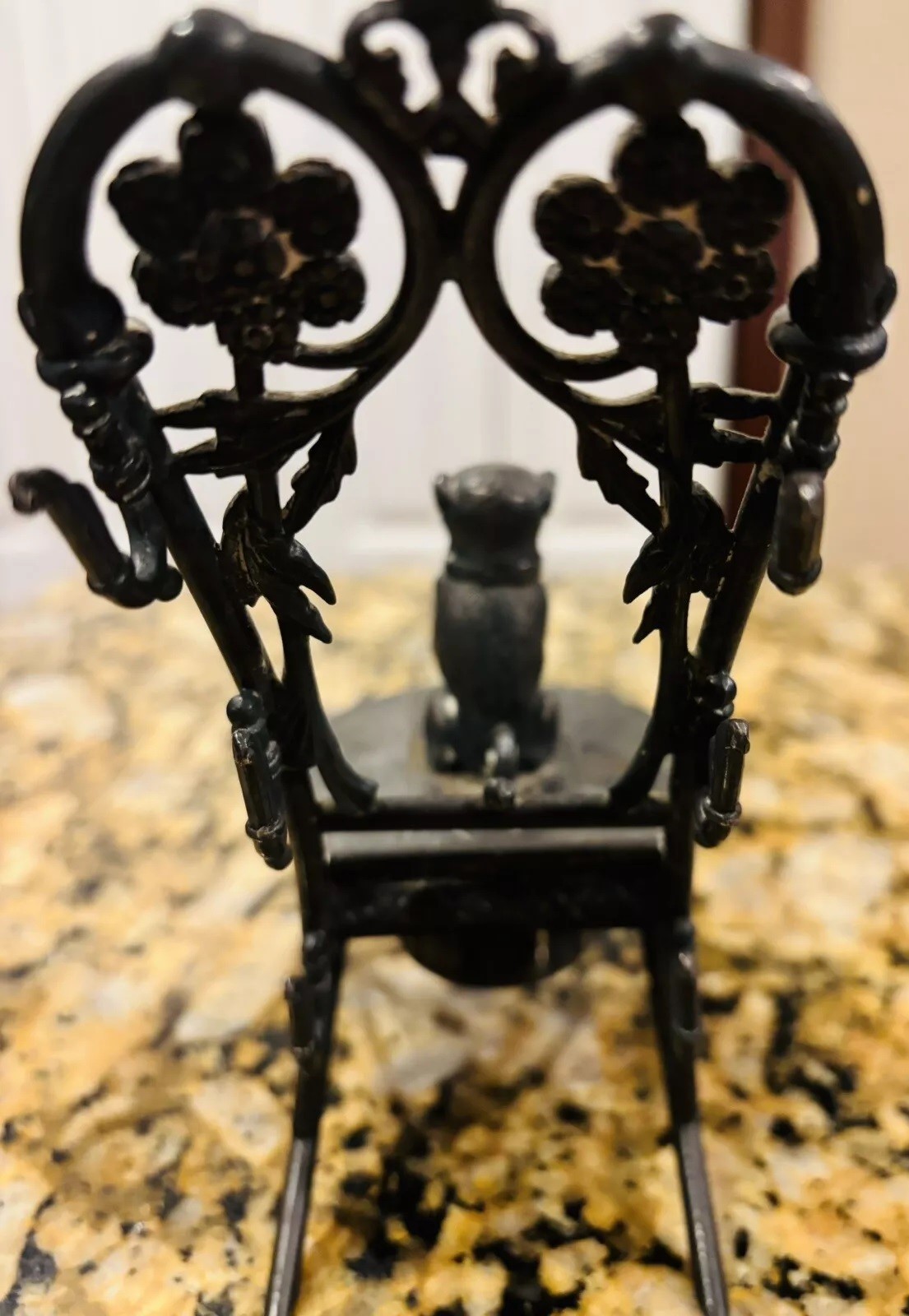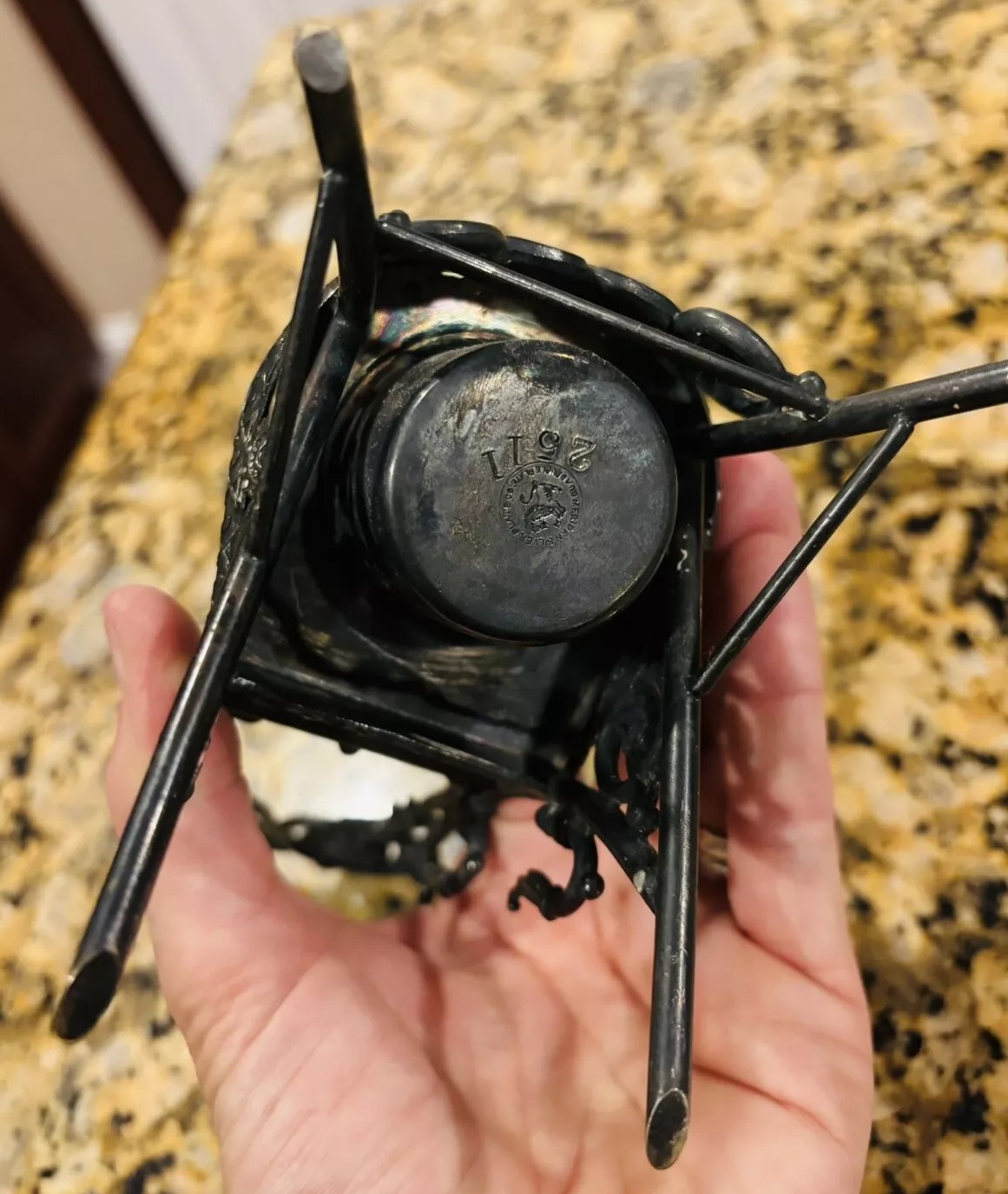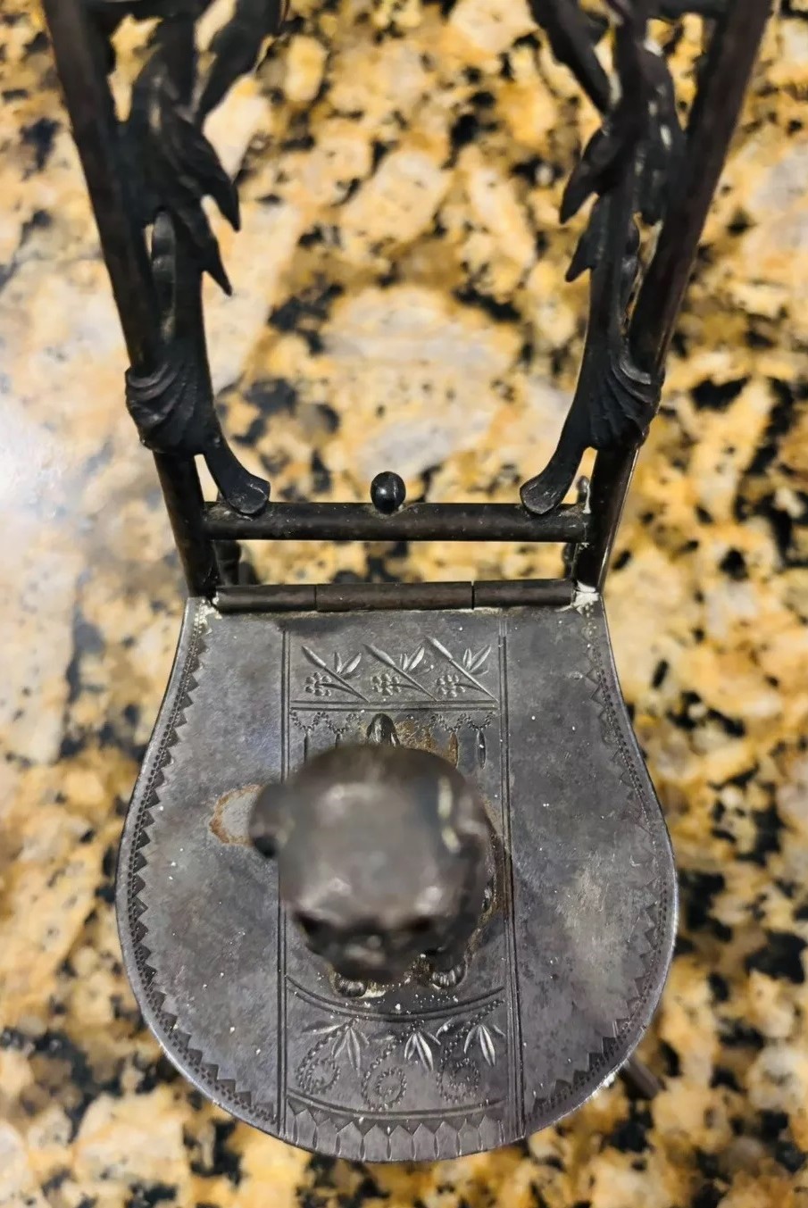 This silver-plated inkwell features a dog, likely a pug, with expressive glass eyes. The dog is seated on a chair with a wrought iron frame, reminiscent of a chair in an ice cream parlor. This chair is part of the inkwell structure, crafted by the Meriden Silver Plate Co. The seat of the chair is hinged – the dog serves as the finial to push open the lid to access the inkwell. The piece is marked “Meriden Silver Plate Co.” along with a lion symbol and numbered 2511. Monogrammed under the lid, the insert is missing from this piece.