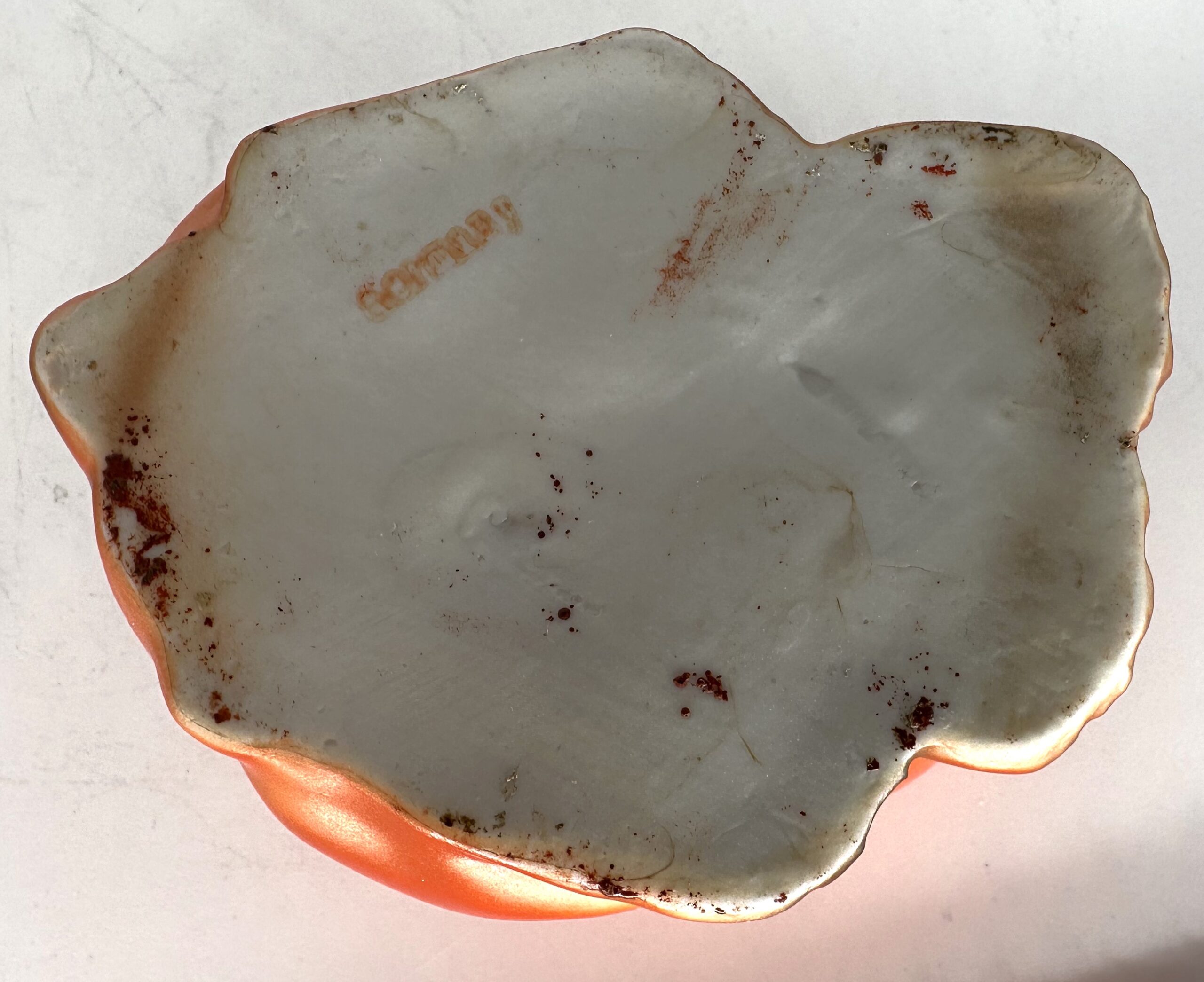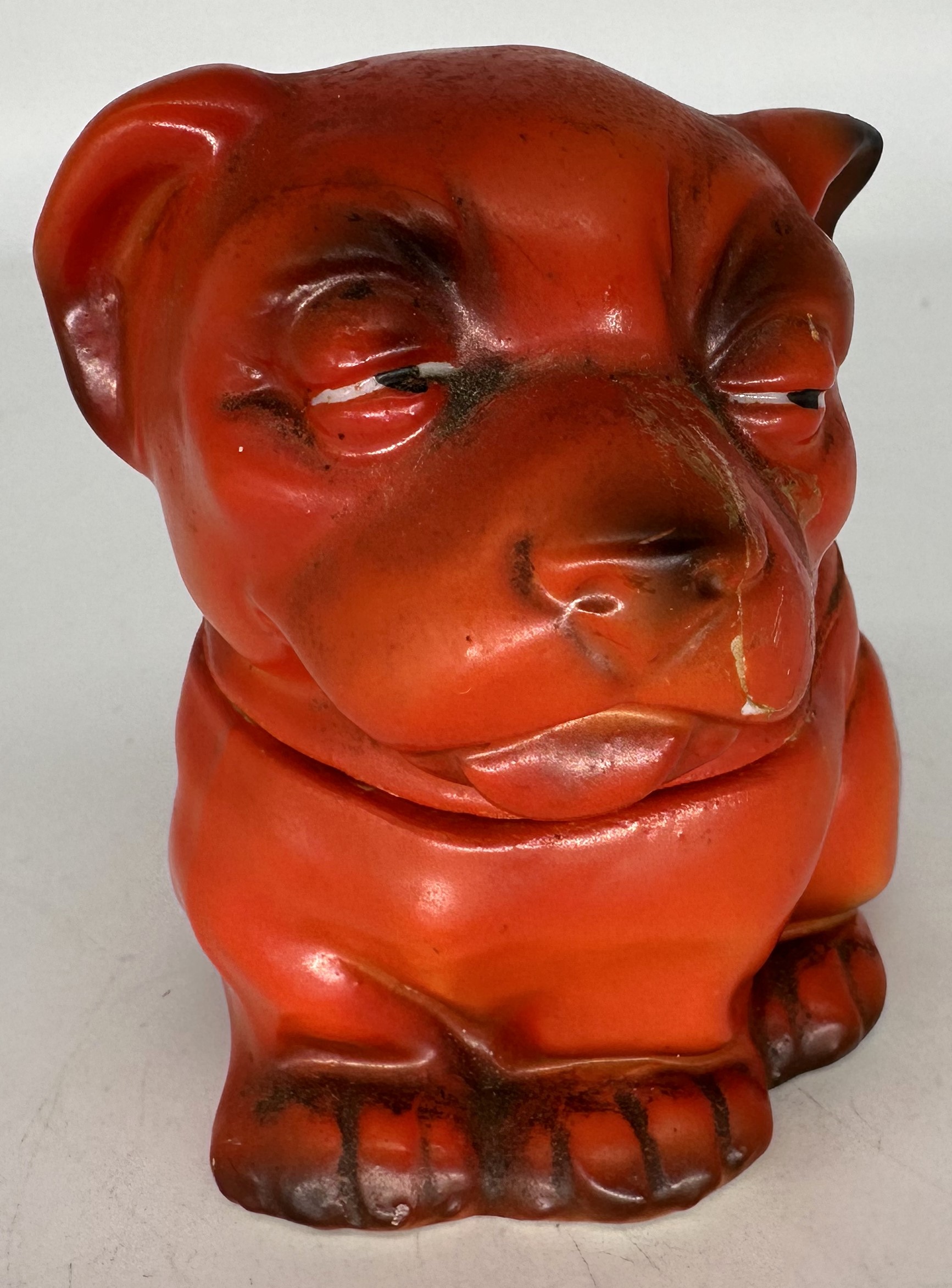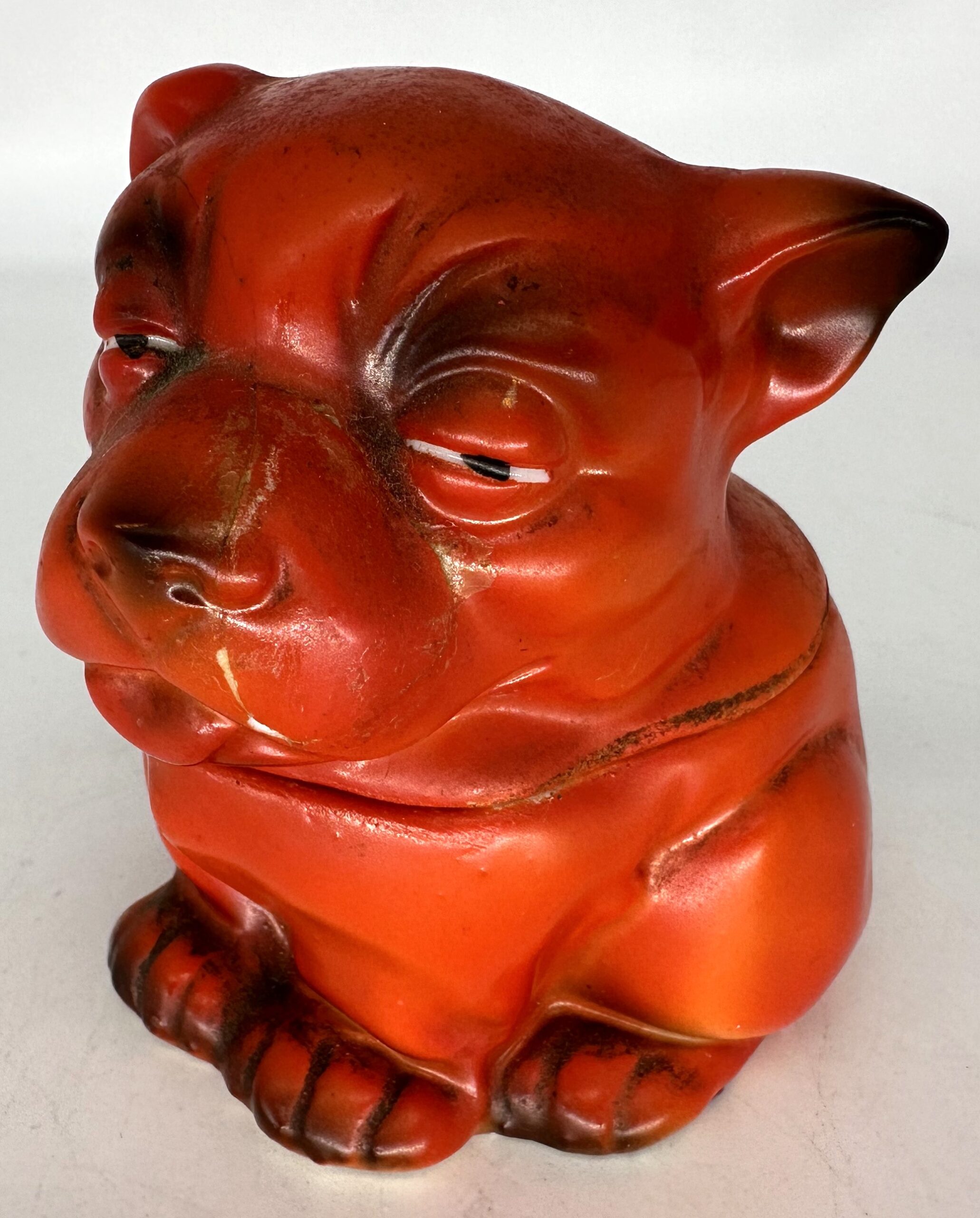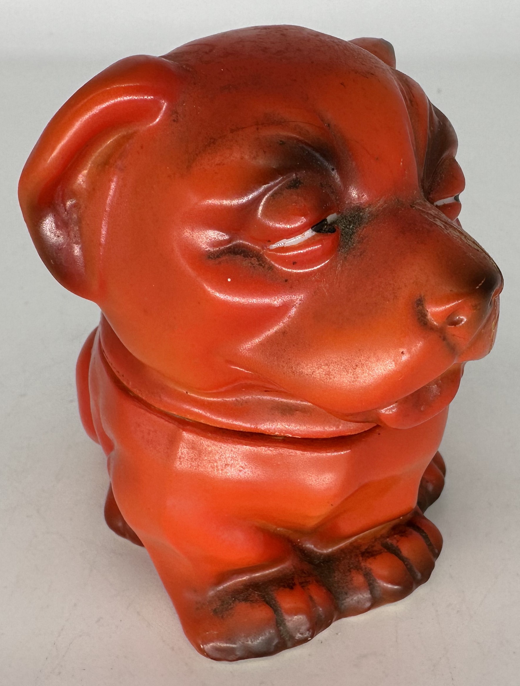 Some online postings label this piece “Bonzo”, based on the character created by British cartoonist George Studdy in 1922. Studdy’s “Bonzo” was white with black spots and has little resemblance to this red-orange dog. Other internet listings attribute this piece to Schafer & Vater or to Goebel. Further verification of the origin of this piece would be helpful.