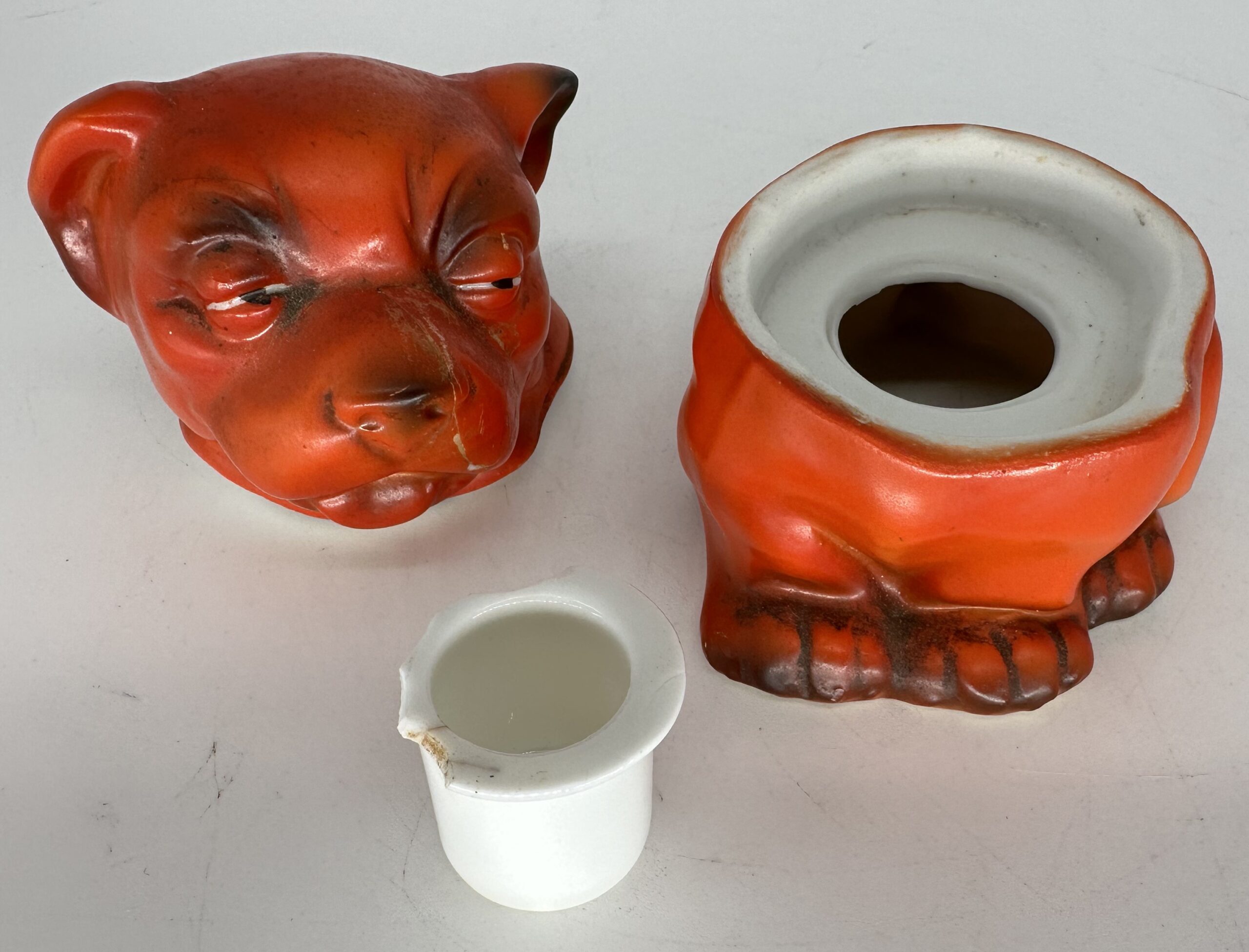 This  sleepy-eyed porcelain pooch, colored Art Deco orange-red with black accents, has his tongue hanging out, looking like he had a rough night. The piece is marked “Germany” on the bottom. There is a pen hole in the back of his head. The top half lifts to access the inkwell.