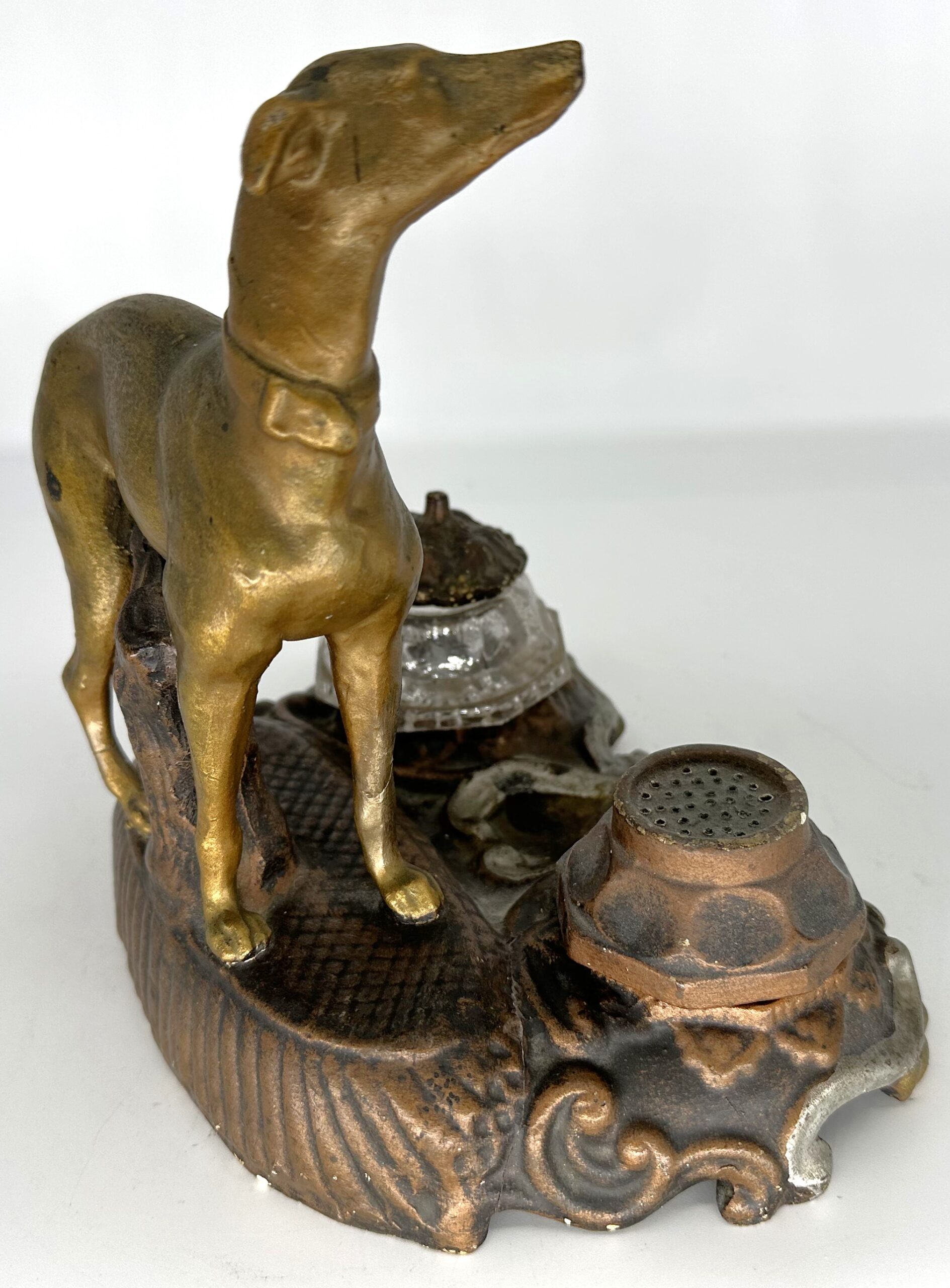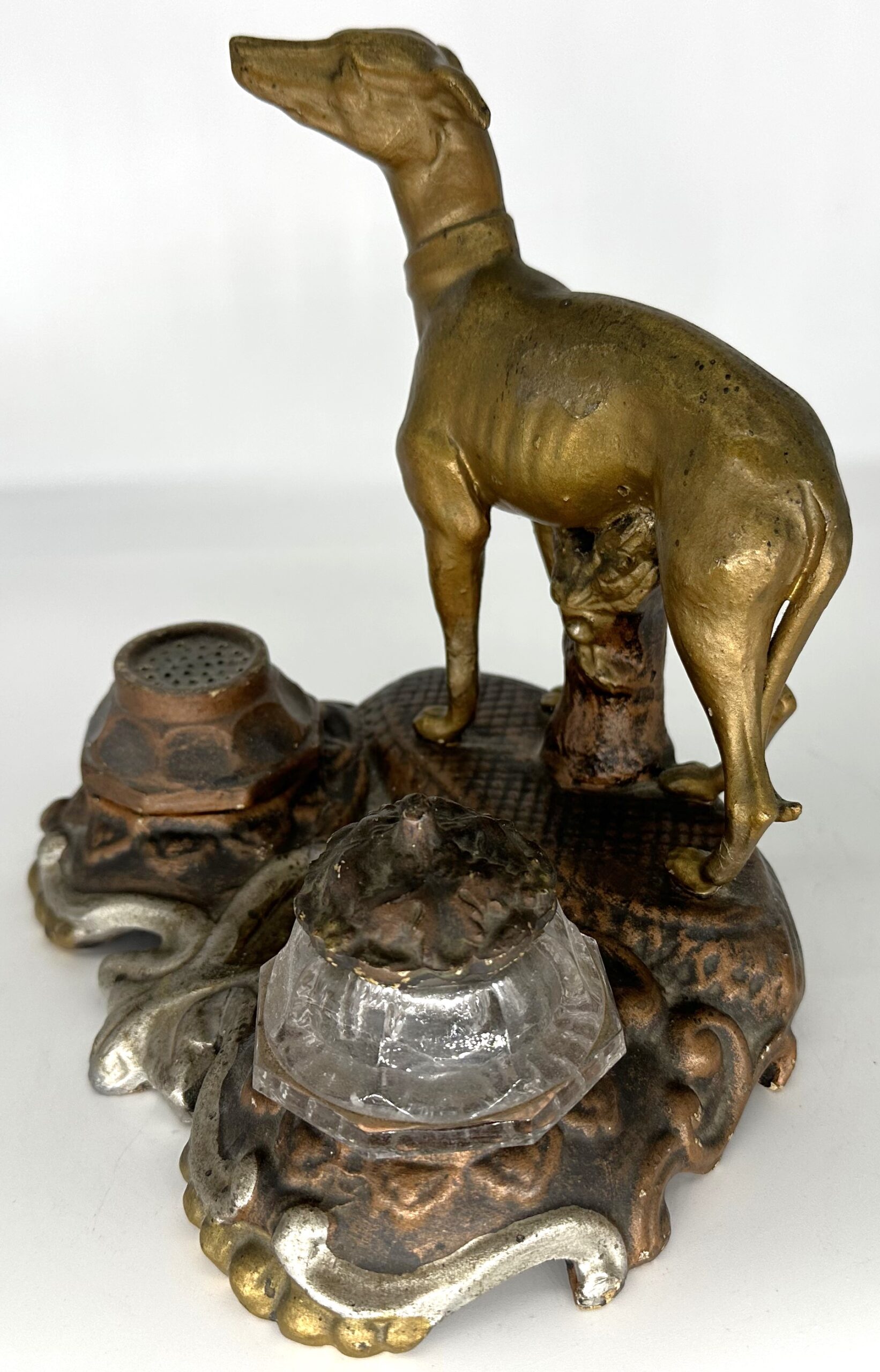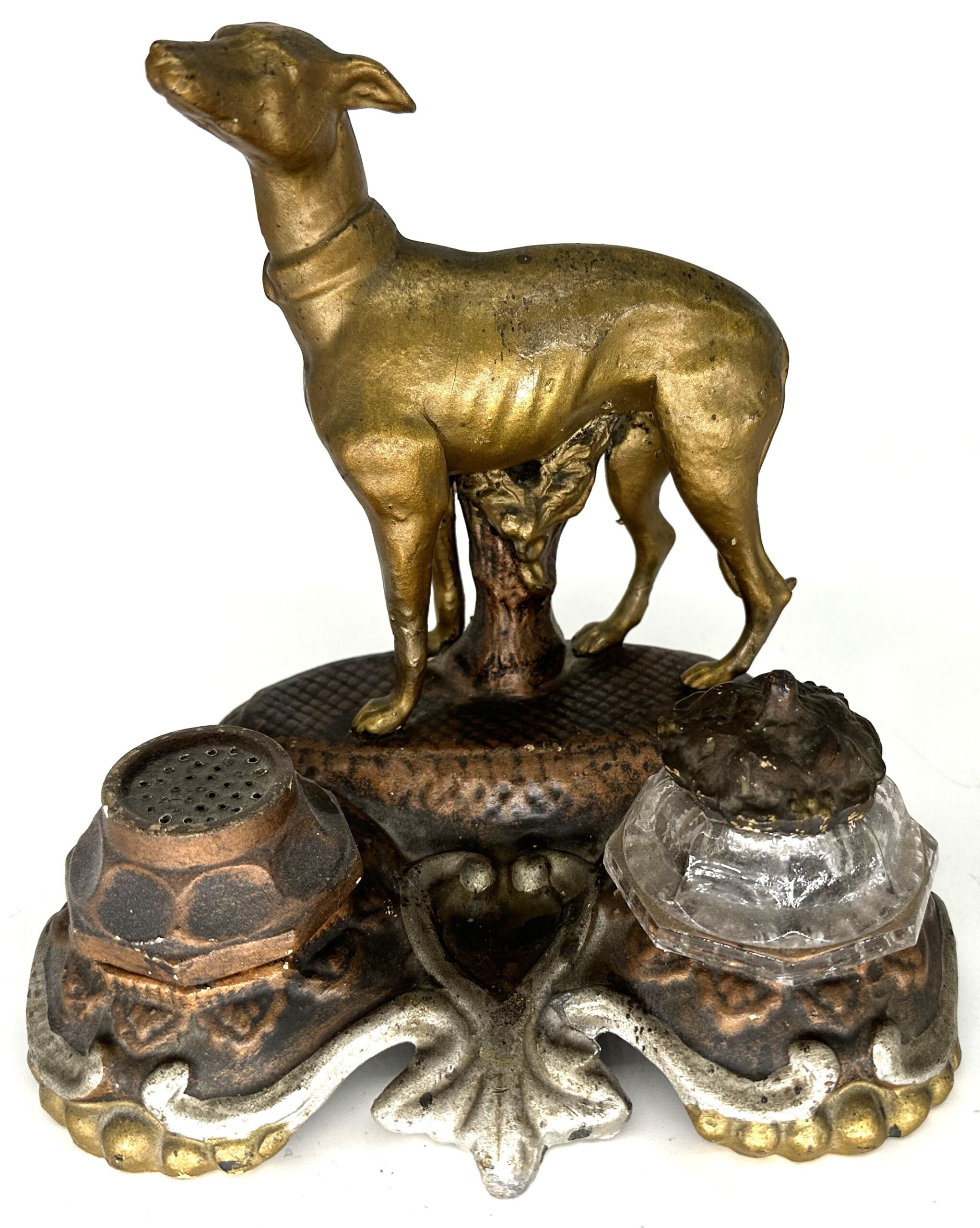 Old pottery inkstand with inkwell and sander, featuring a standing greyhound. Numbered on the bottom 1309.