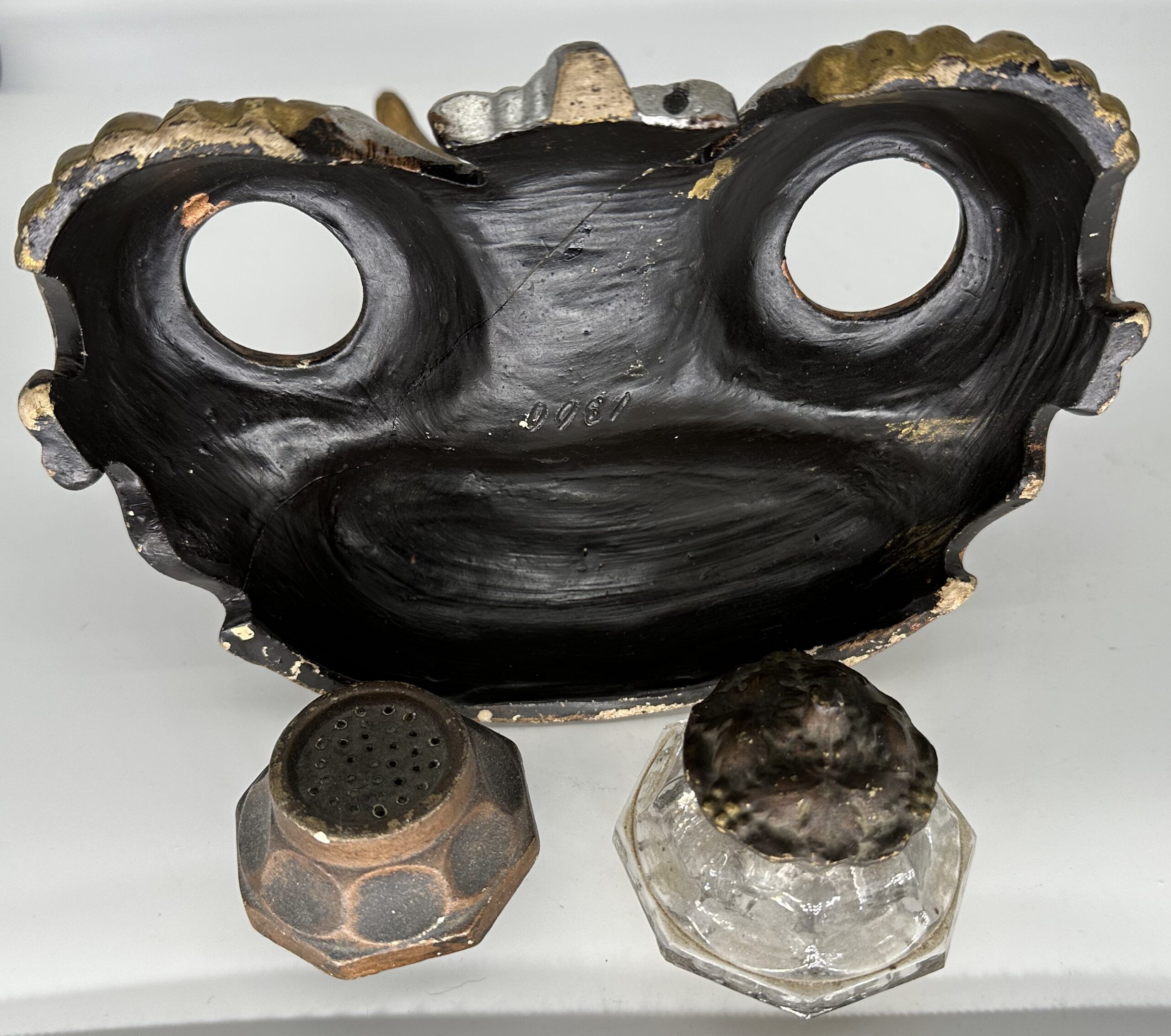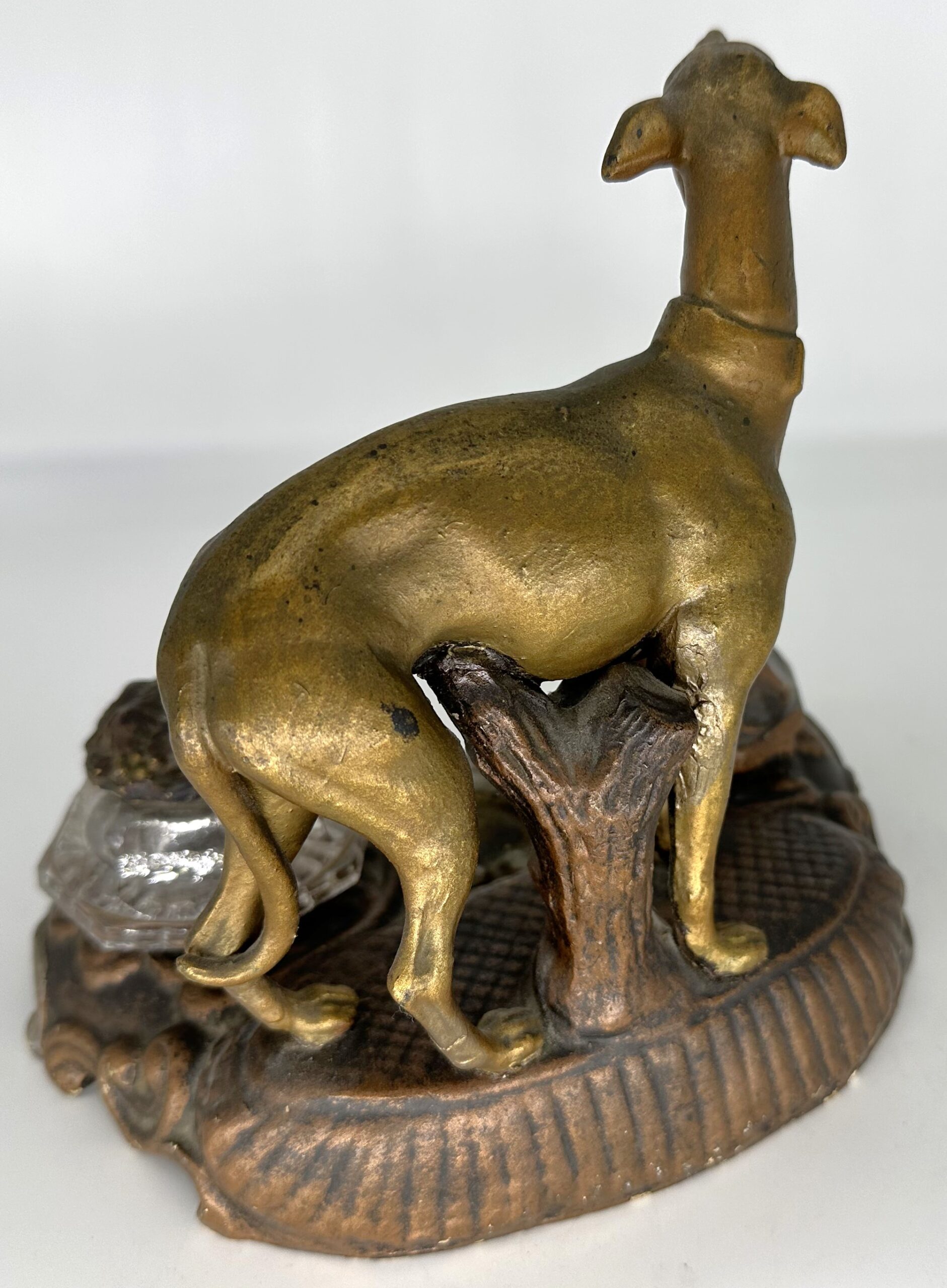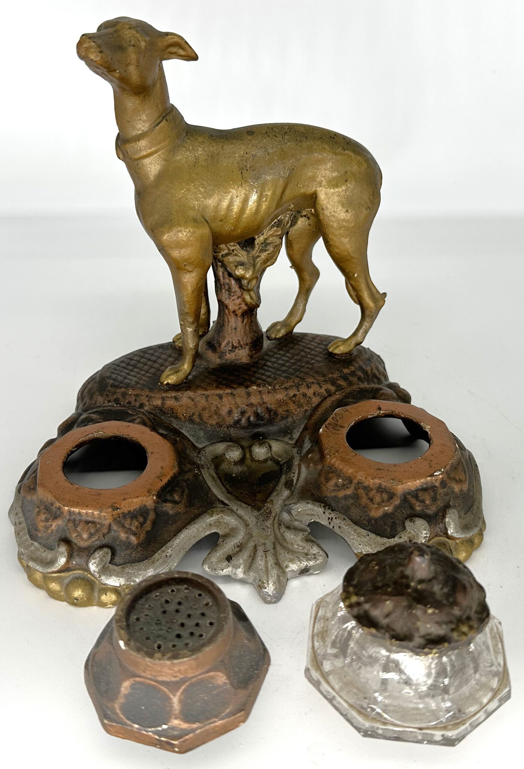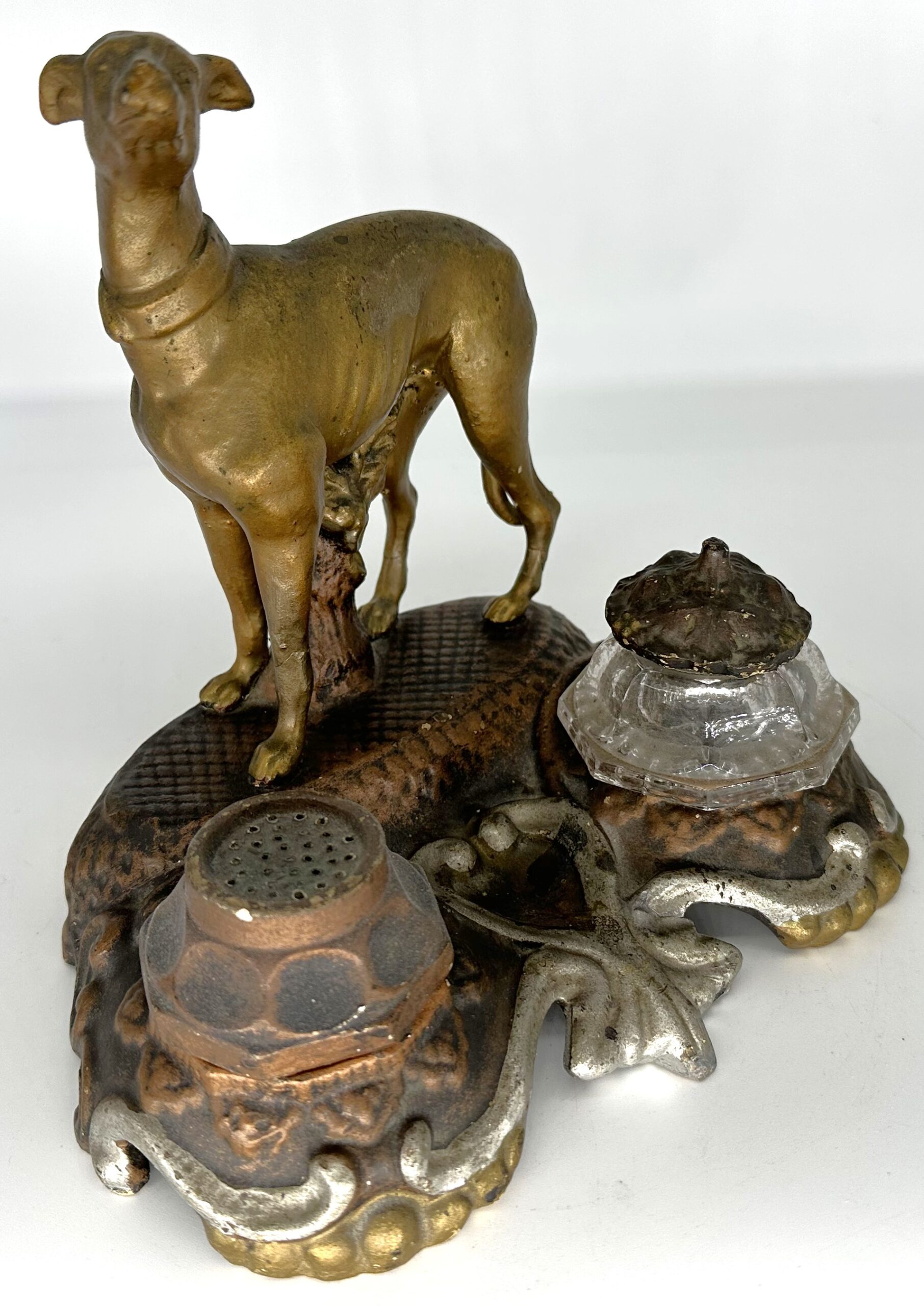 Old pottery inkstand with inkwell and sander, featuring a standing greyhound. Numbered on the bottom 1309.