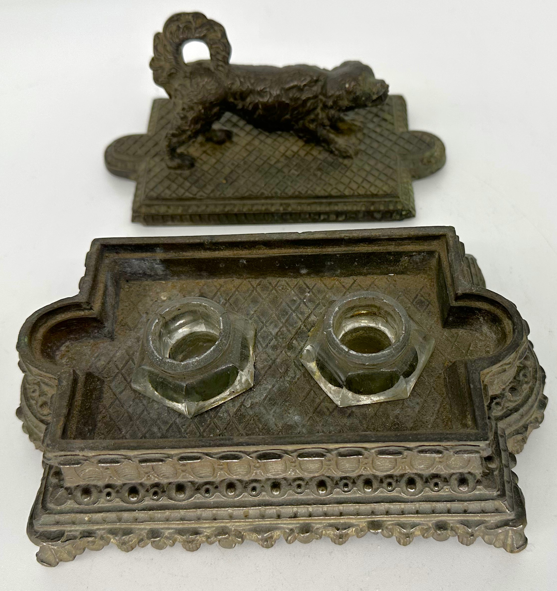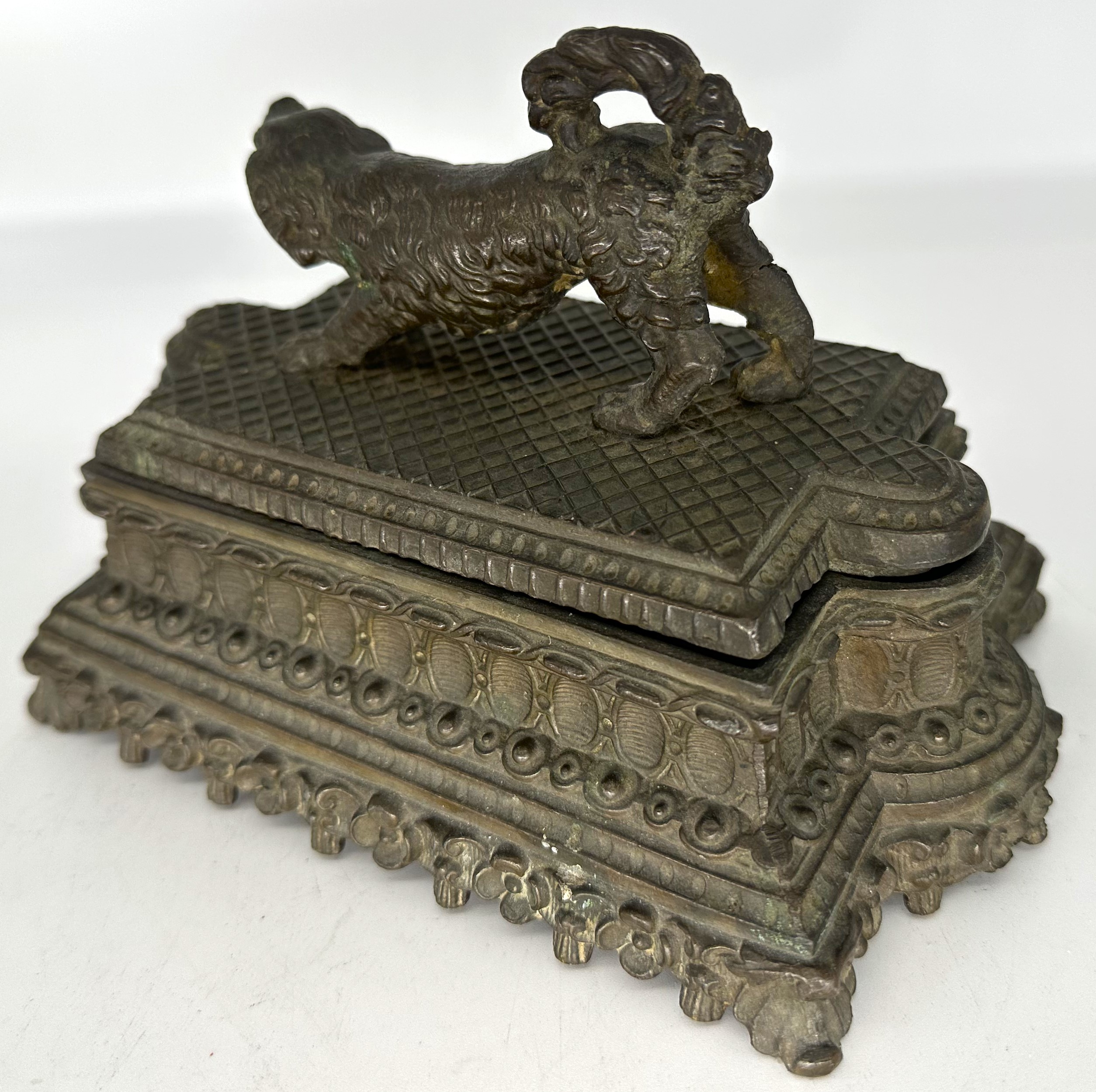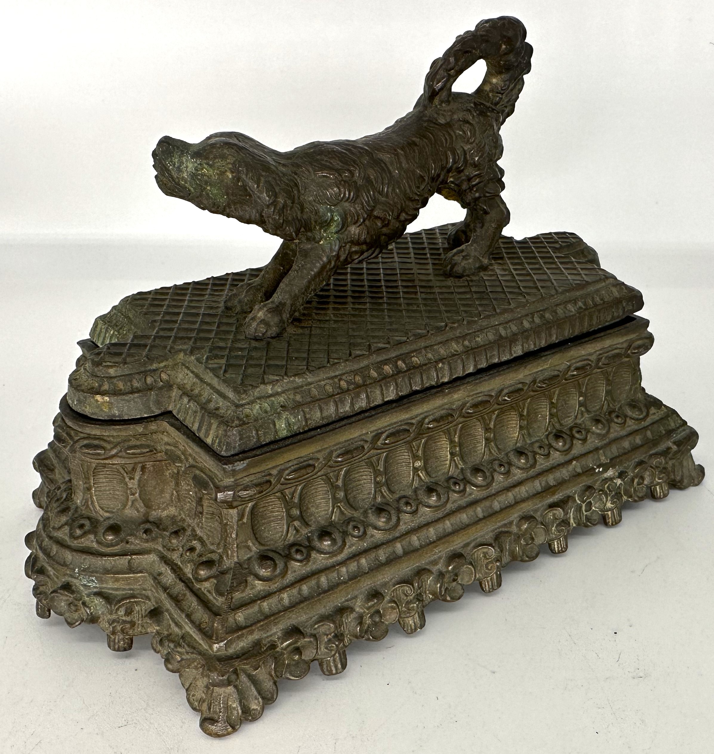 A playful spaniel stands atop an ornate bronze plinth base. Lift the spaniel lid to access the inkwells.