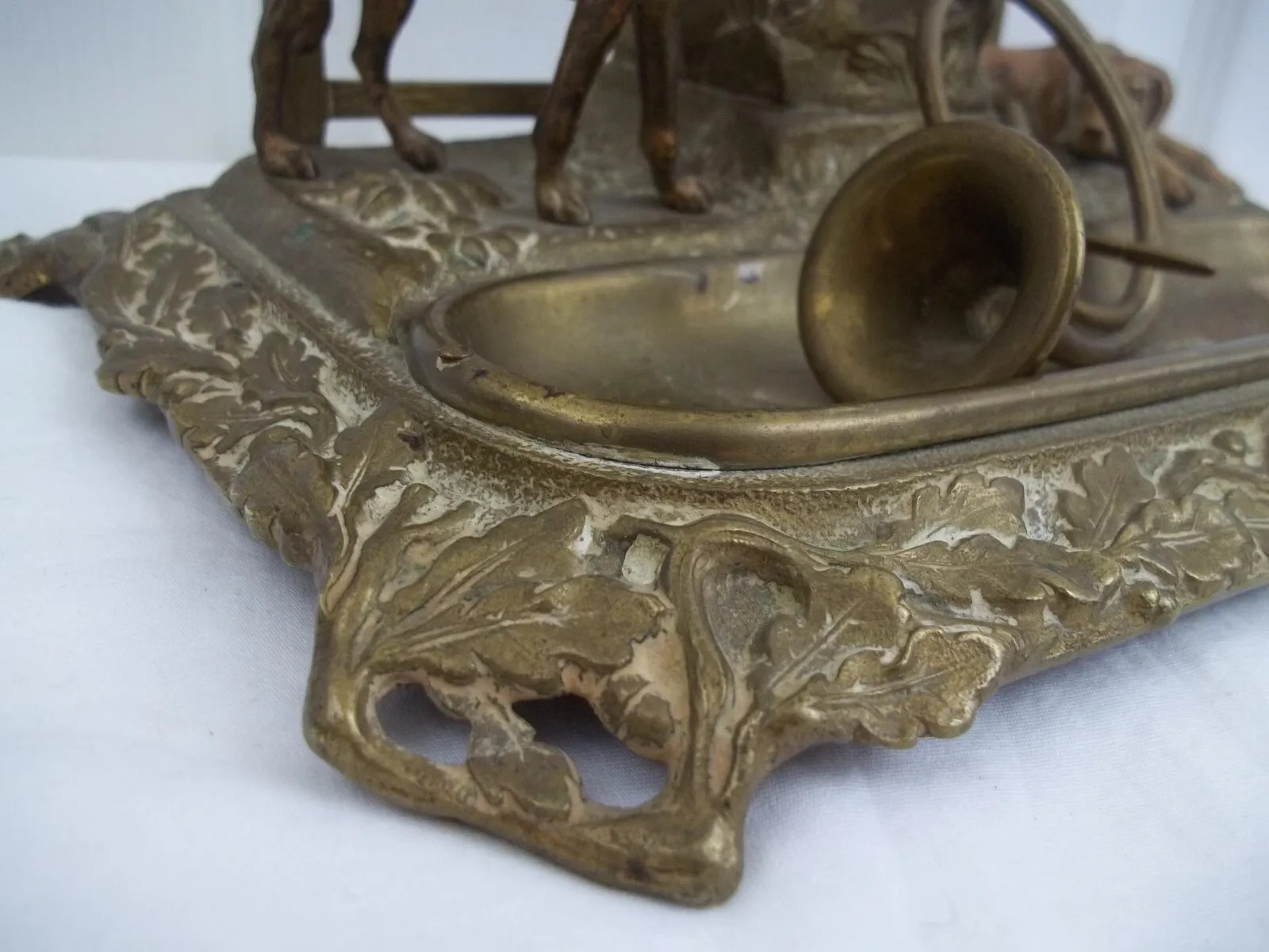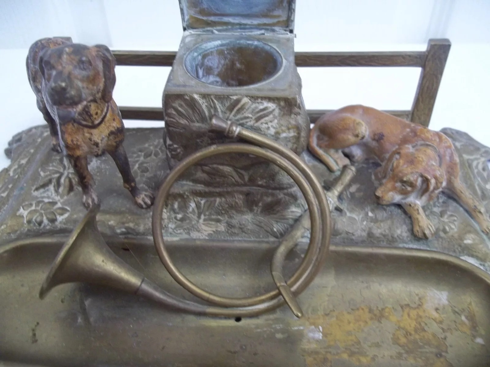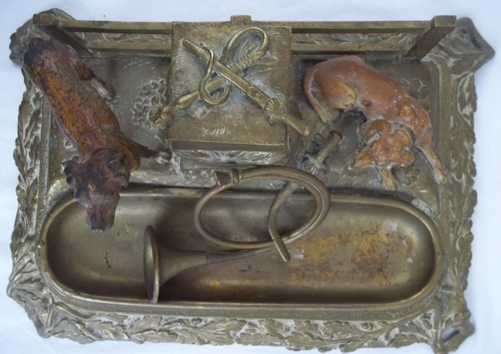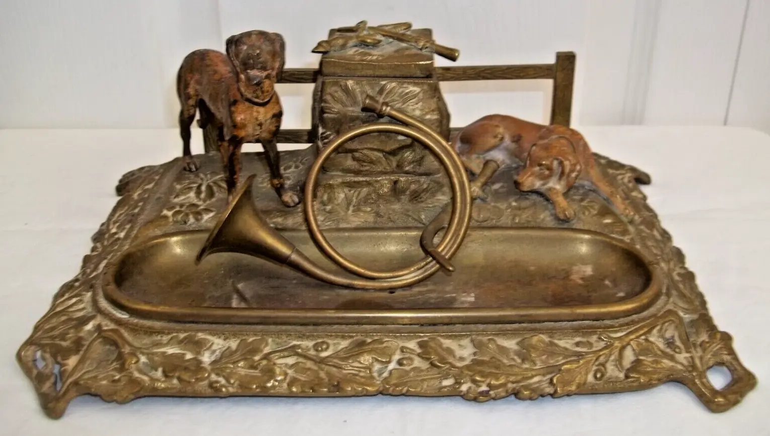This brass inkstand finish features two bronze dogs in front of a fence. One dog is standing, the other one is prone. Between them is a stone pillar which houses the inkwell (missing insert).  On top of the pillar are a braid whip and a sword, crossed over each other. In front is a fox hunt horn atop a removeable pen tray. The border of the base has an oak leaf design.