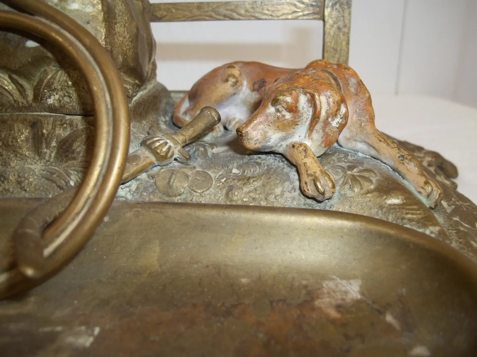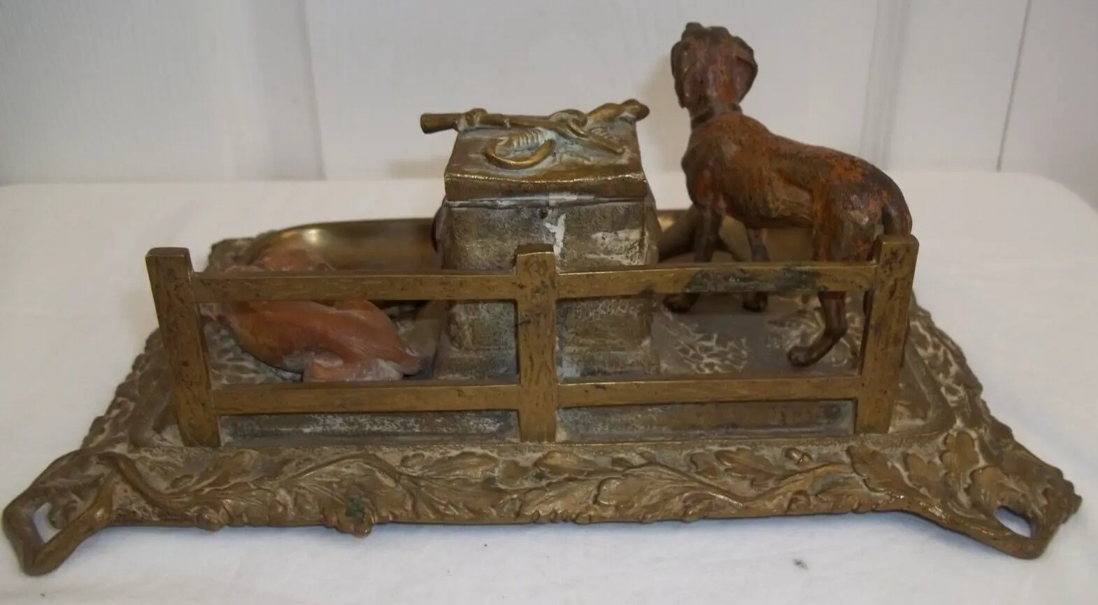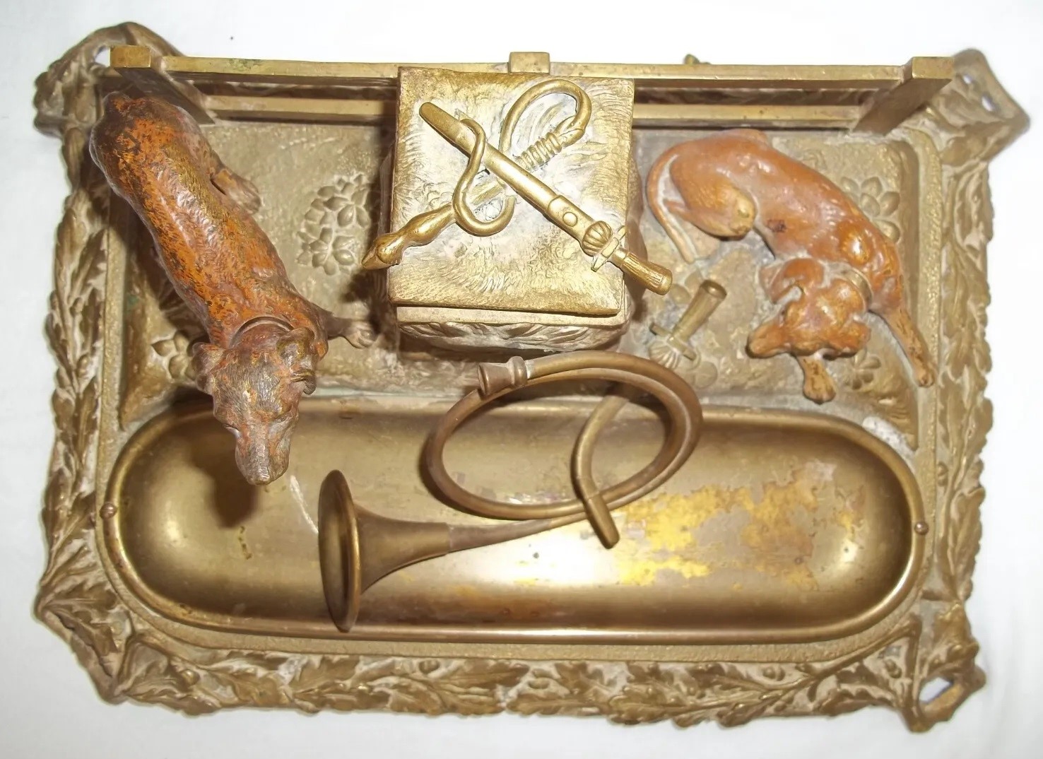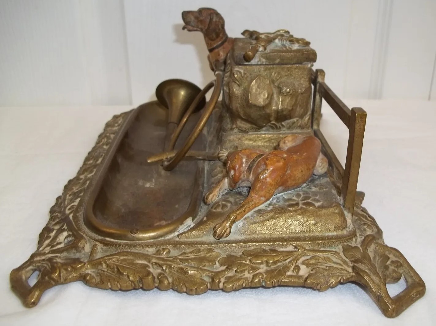 This brass inkstand finish features two bronze dogs in front of a fence. One dog is standing, the other one is prone. Between them is a stone pillar which houses the inkwell (missing insert).  On top of the pillar are a braid whip and a sword, crossed over each other. In front is a fox hunt horn atop a removeable pen tray. The border of the base has an oak leaf design.