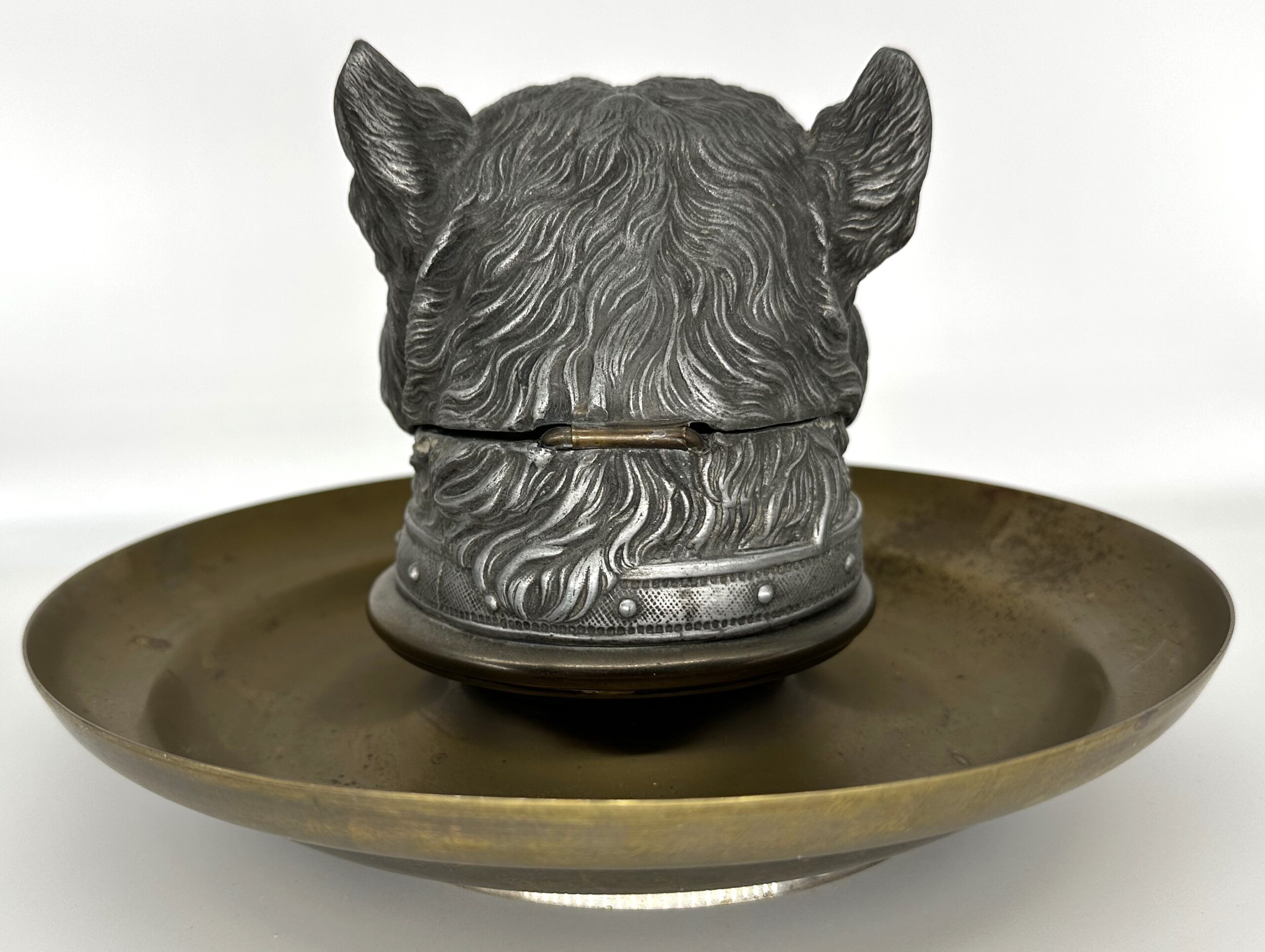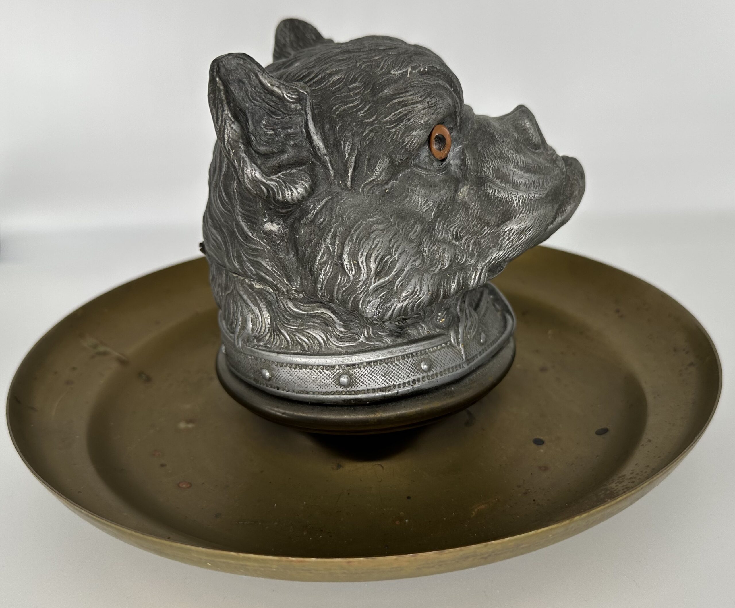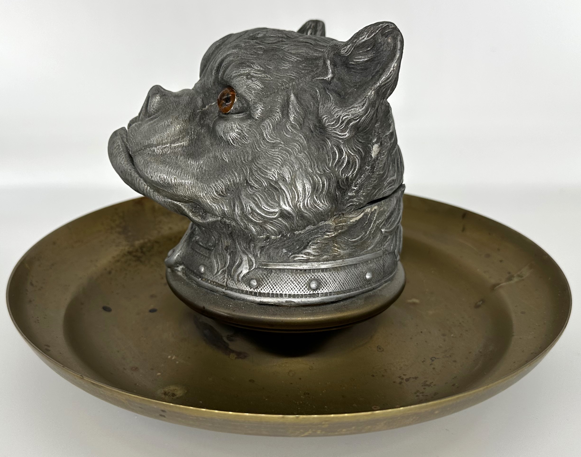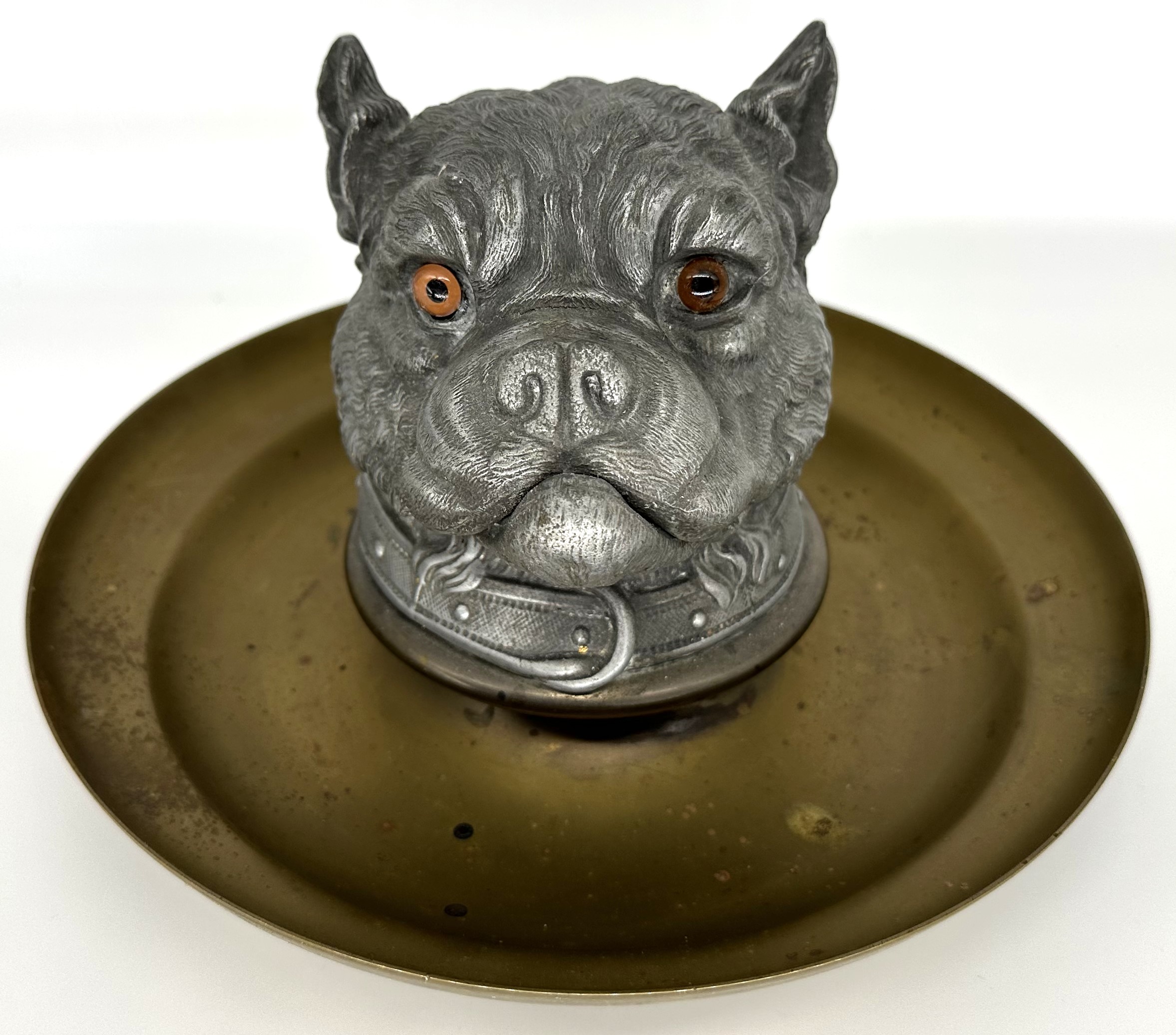 Metal head of a bulldog with glass eyes rests on a brass saucer base. Beautifully detailed casting of fur, collar, and ears.