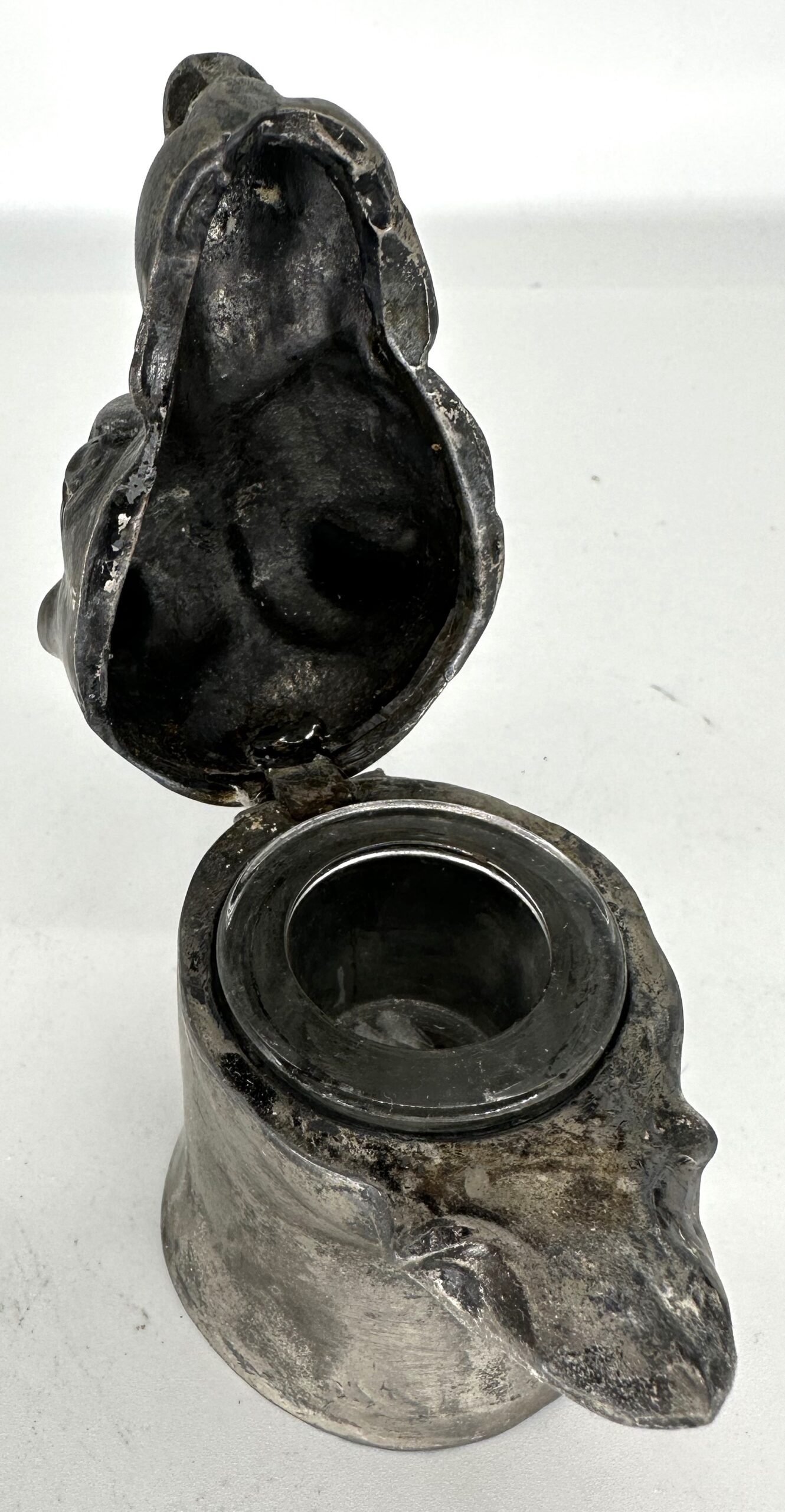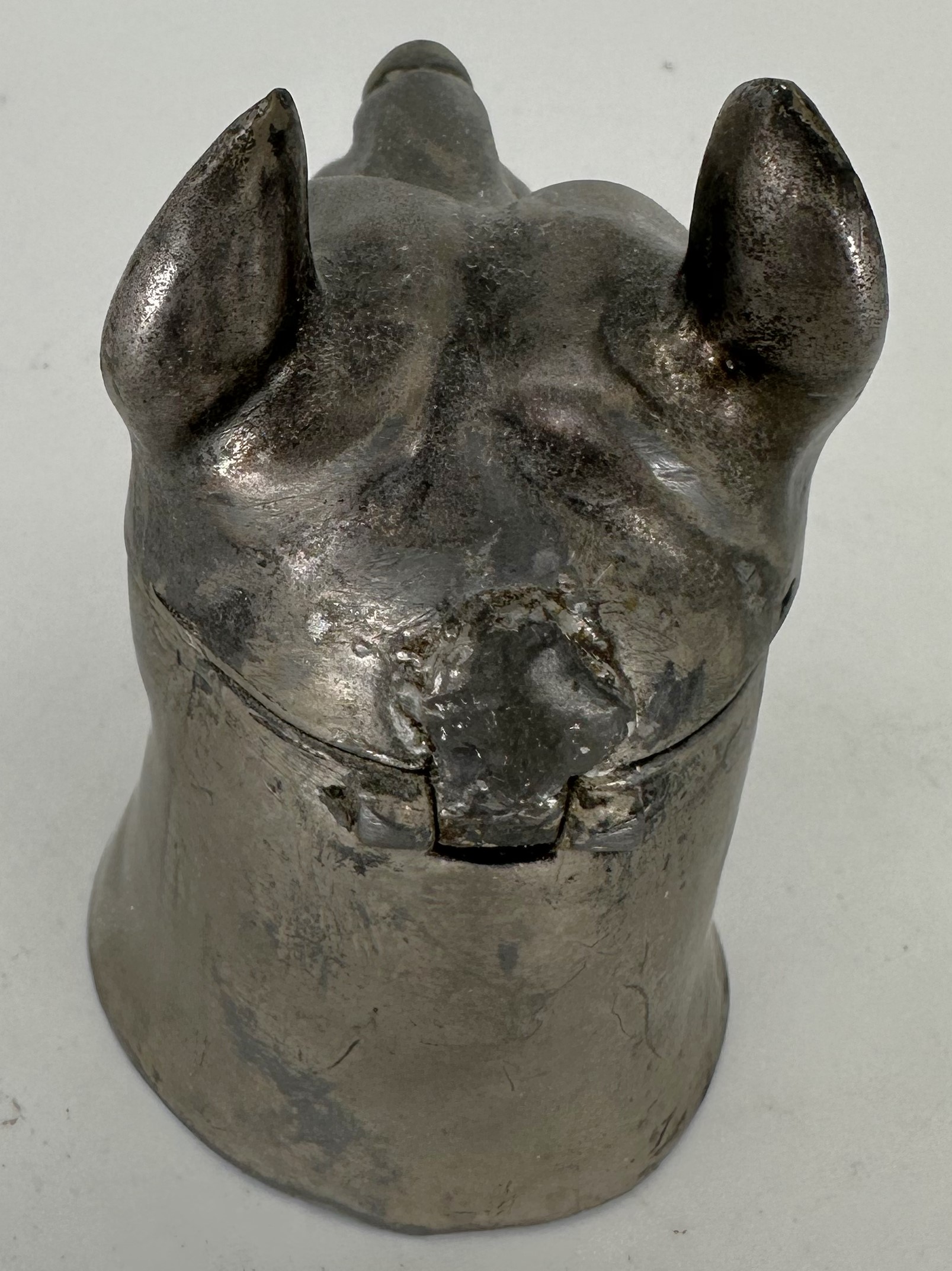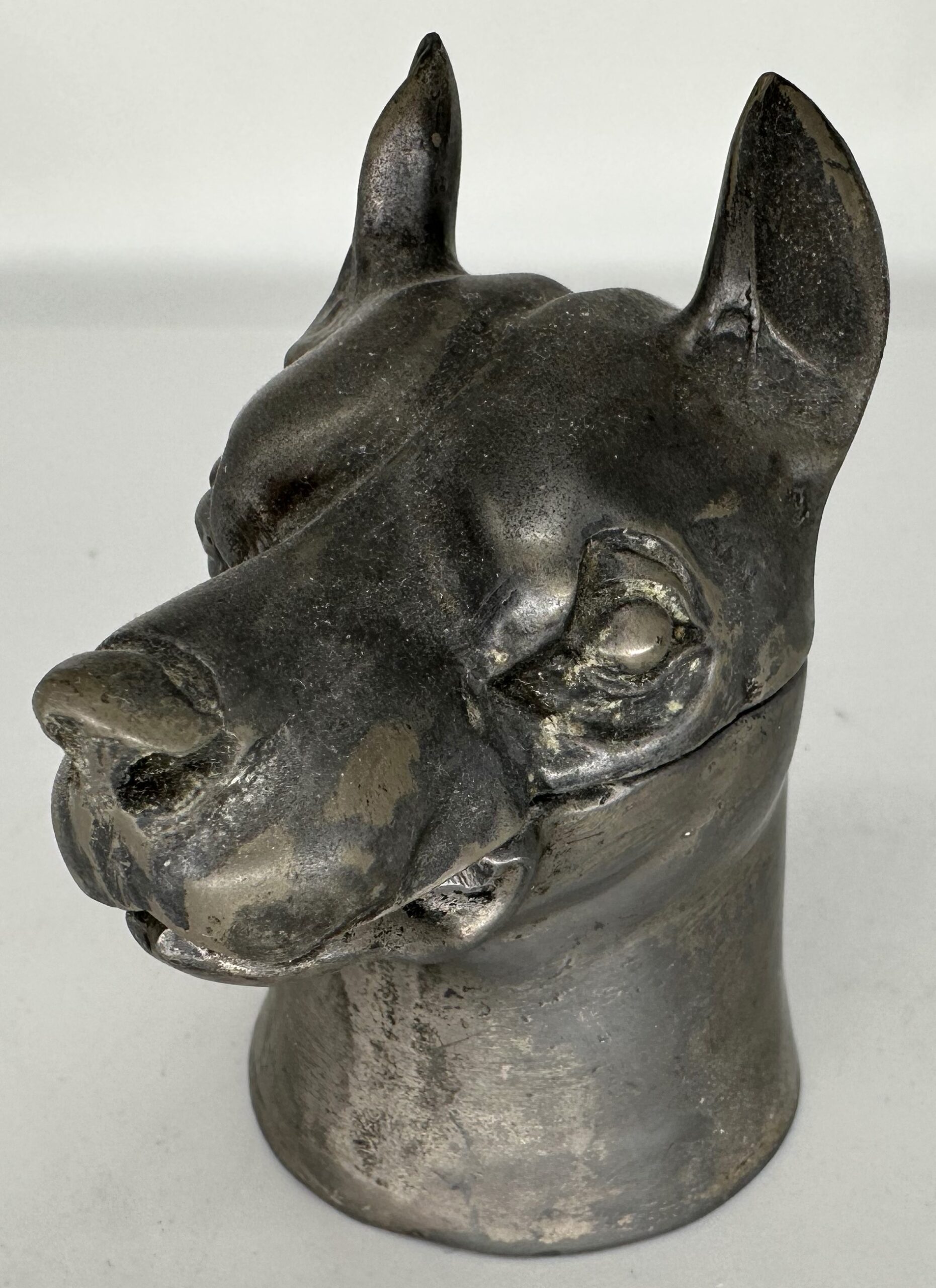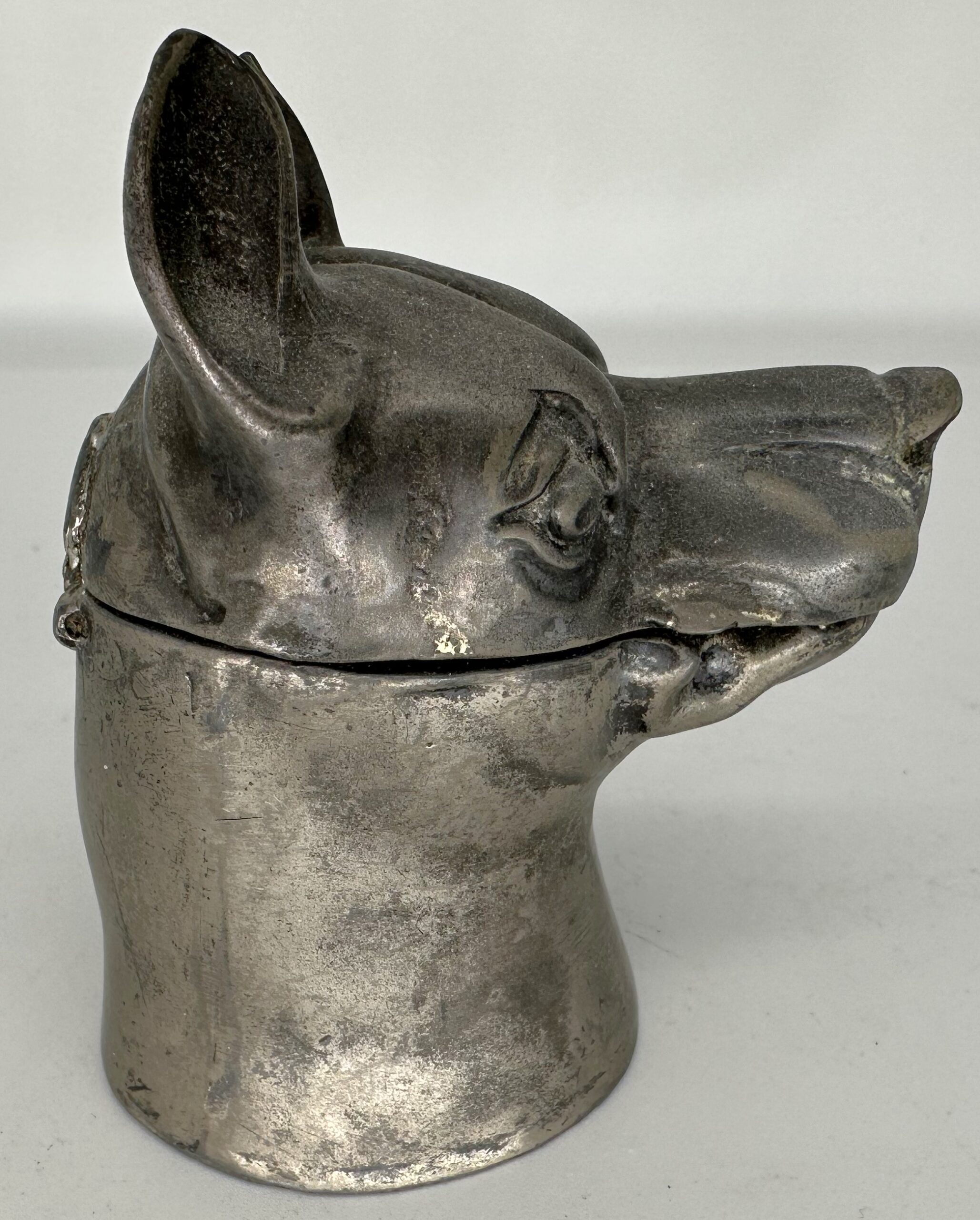 This dog has a keen stare with pointed ears erect. His mouth opens wide to show us the original insert hidden inside to hold the ink.