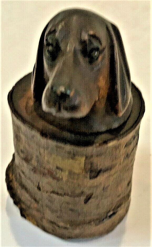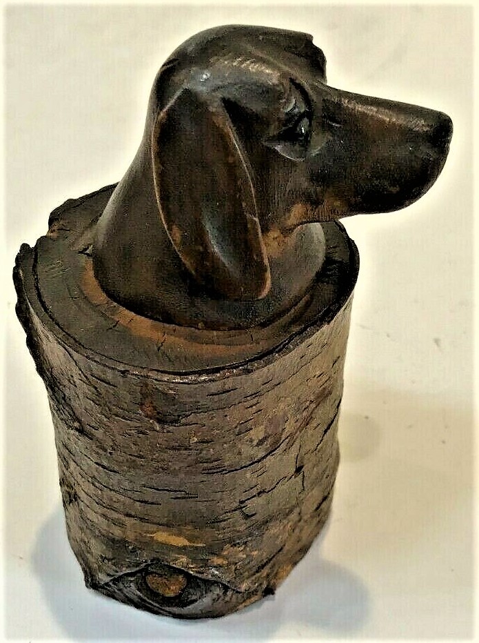 Hand-carved Dog’s Head on a Stump. Nicely detailed, with glass eyes.