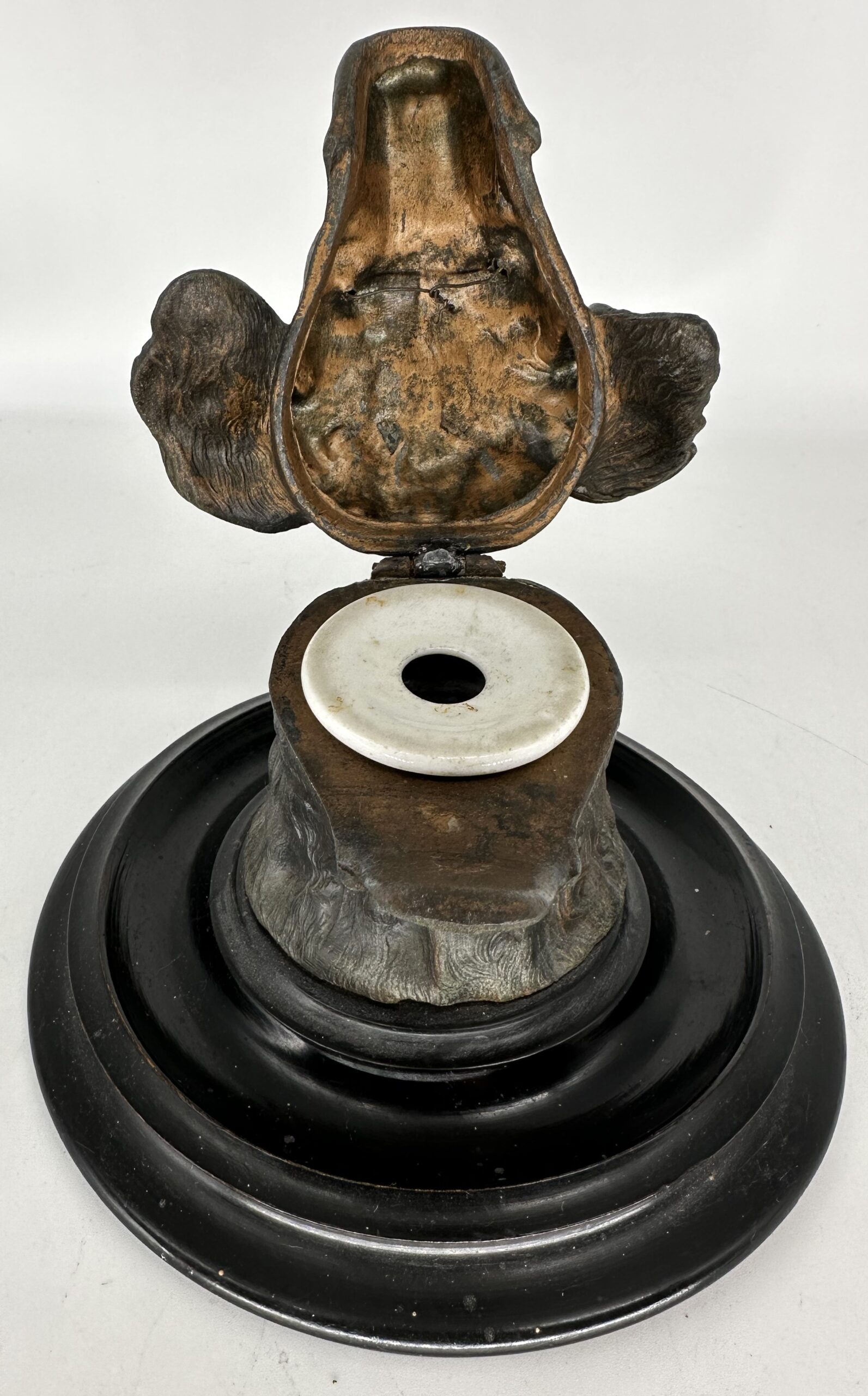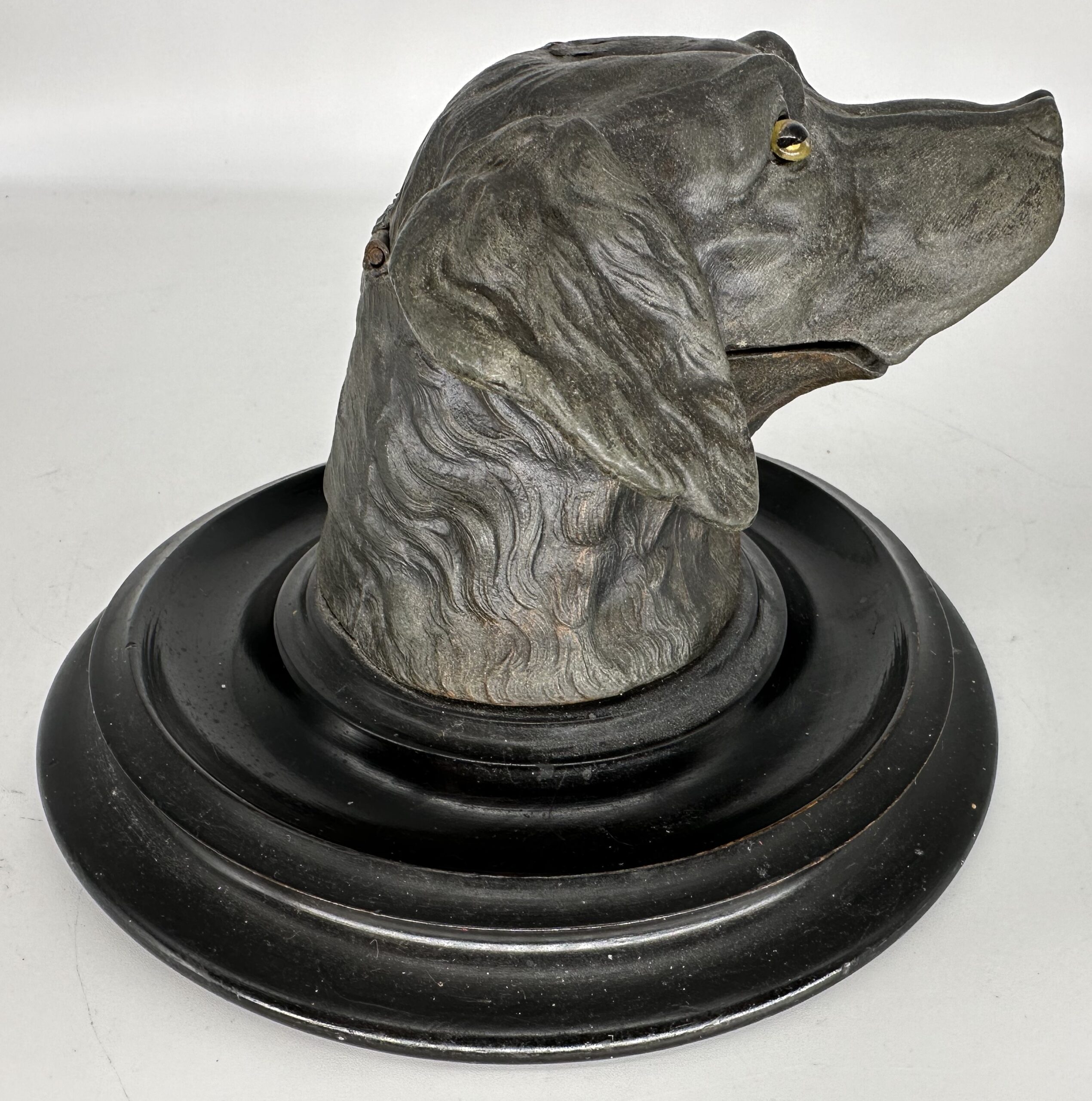 Metal figure of a dog’s head with glass eyes (wired inside to the head). The head is hinged and opens to reveal a porcelain insert. The piece is screwed onto a wooden circular black lacquered base.