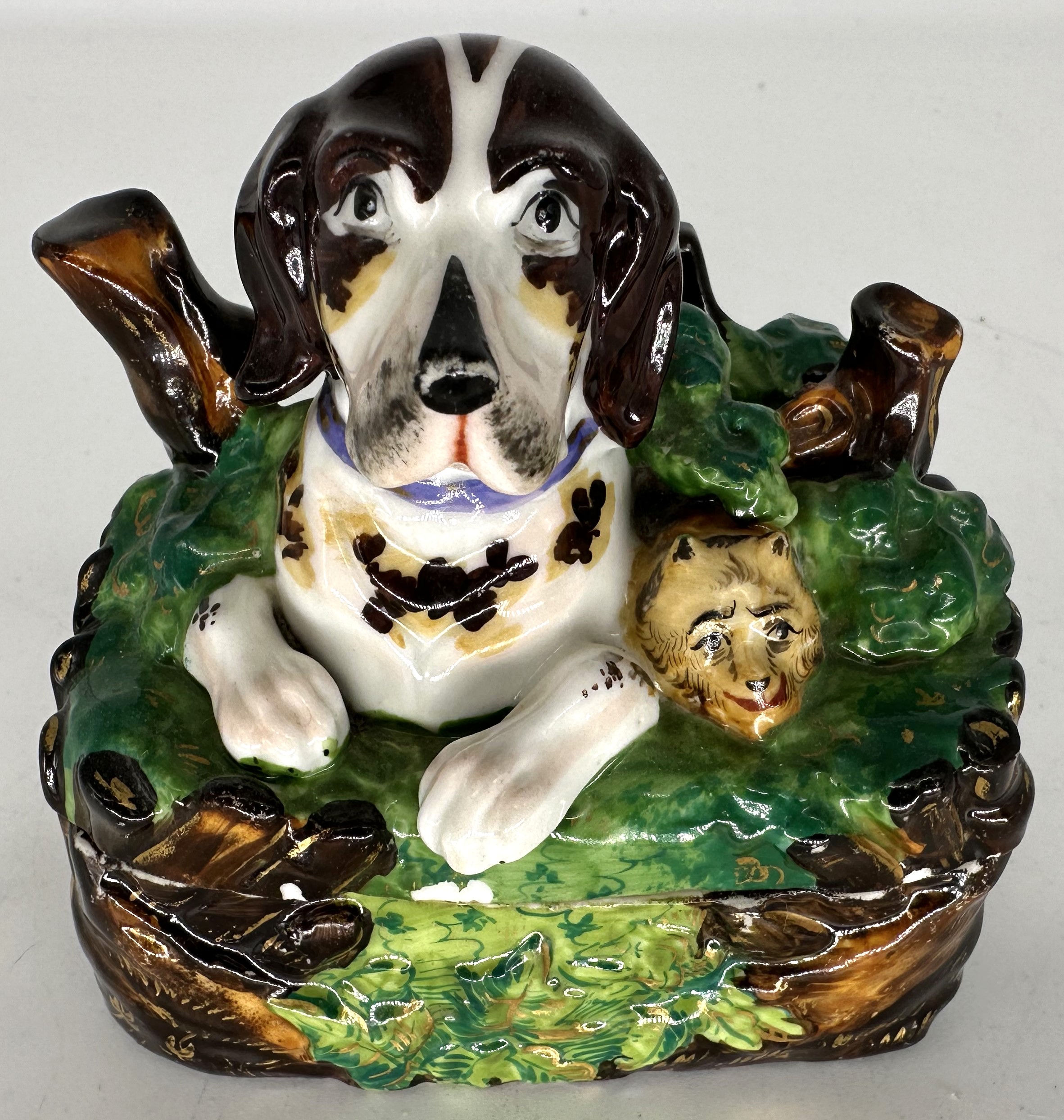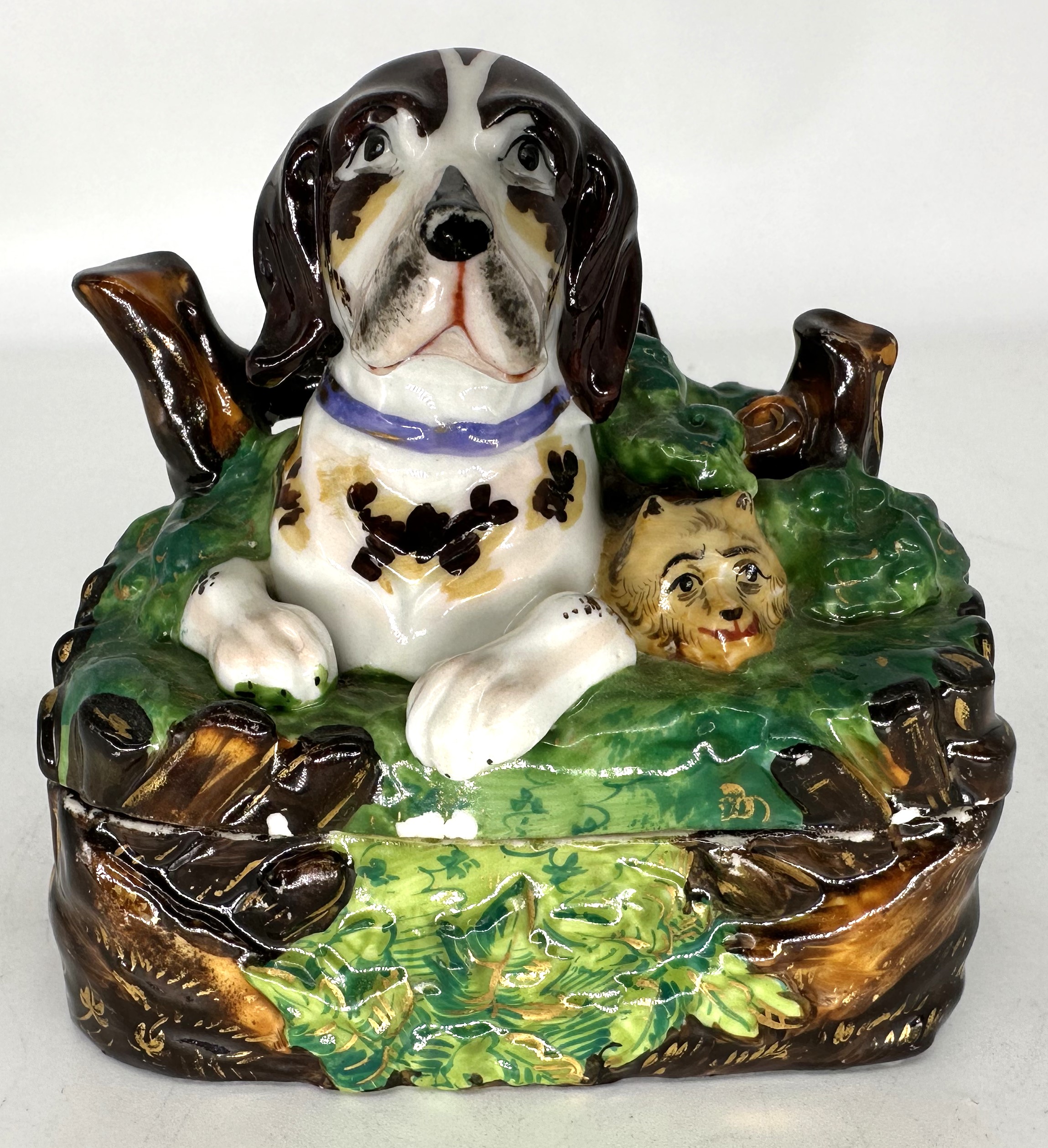 Hand-painted Staffordshire porcelain inkwell features two dogs (a hound dog and a small terrier) poking their heads through the foliage. Under the lid are an inkwell and a sander.
