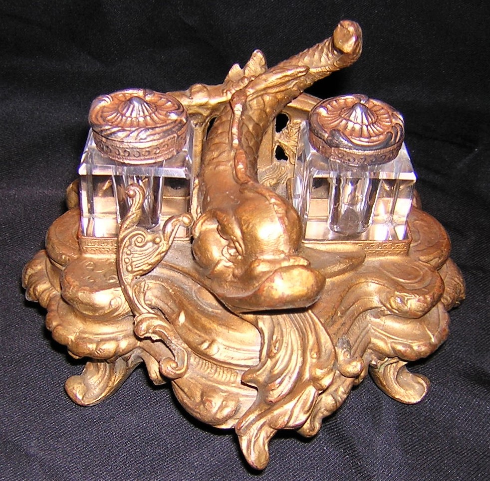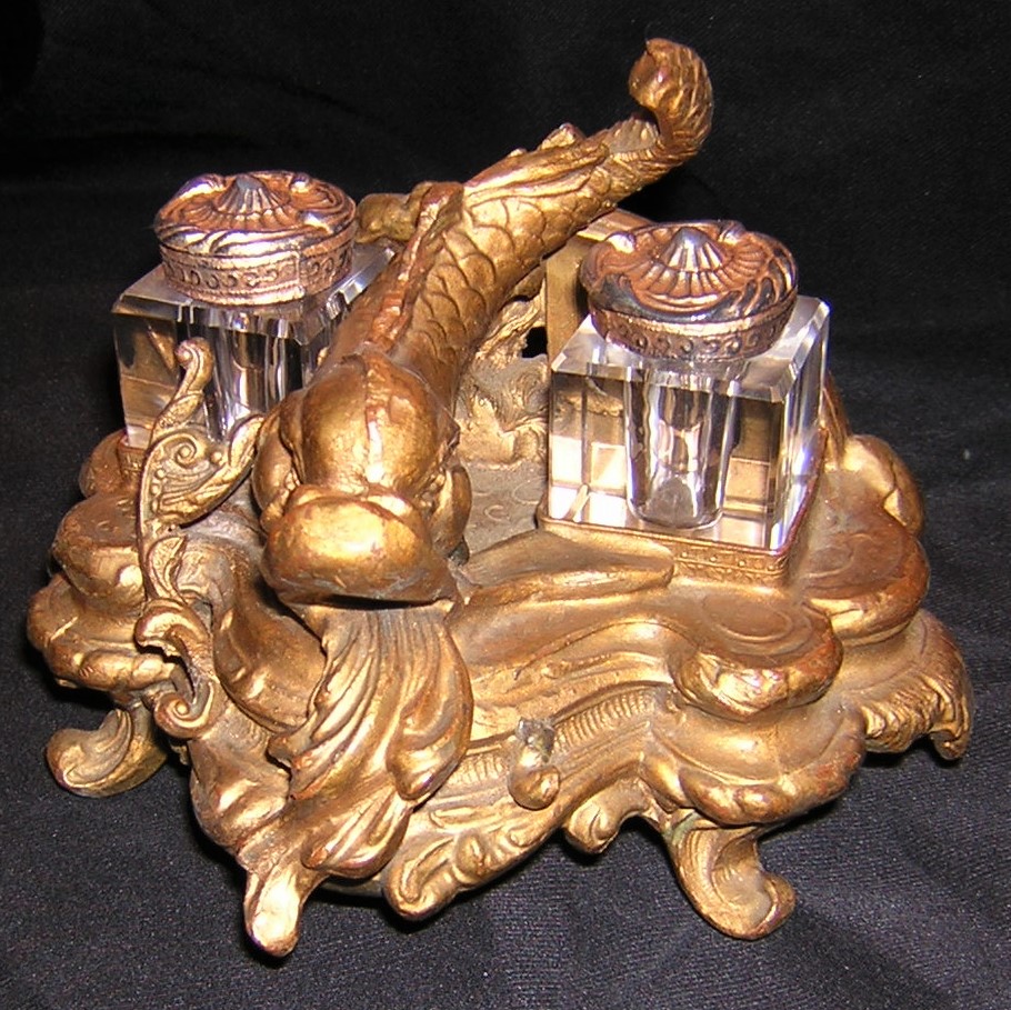 Dolphin double inkstand – throughout mythology, the dolphin has been a special ally to humans, hence its presence in art / antiques.