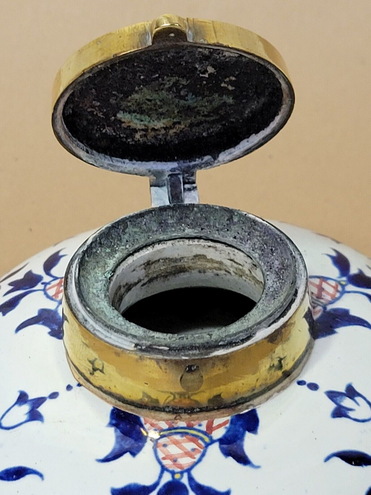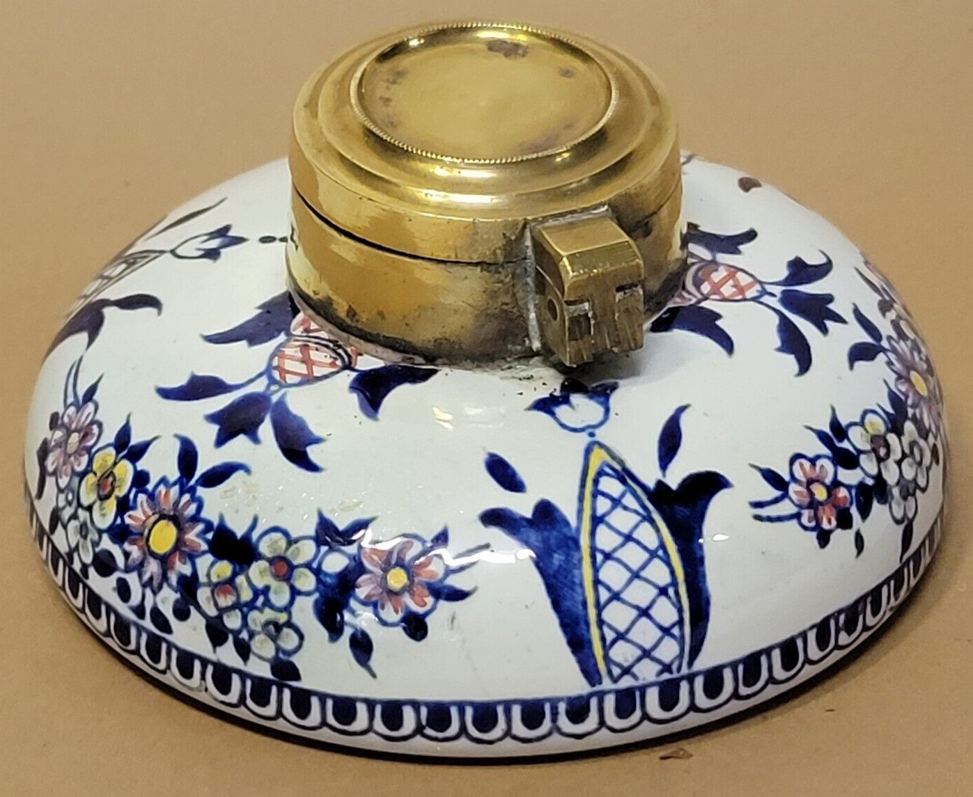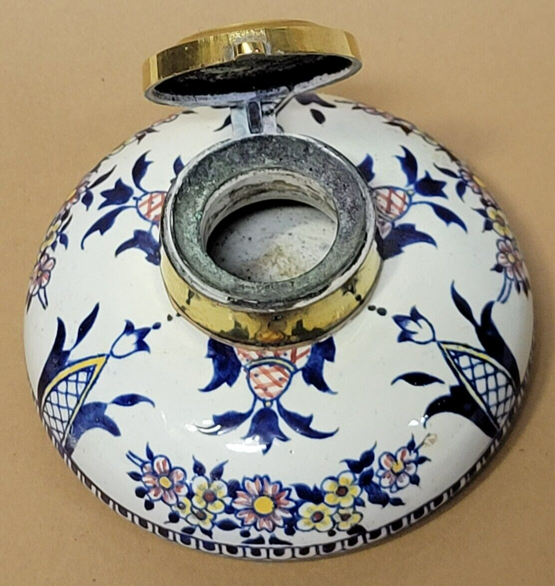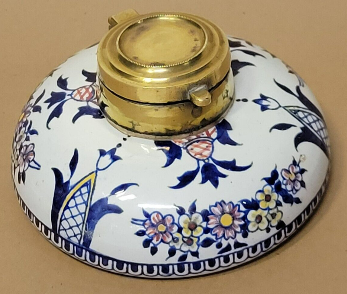 The circular contour of this inkwell is decorated with bright floral and leaf patterns. The hinged lid (with a tab) and collar are made of brass.