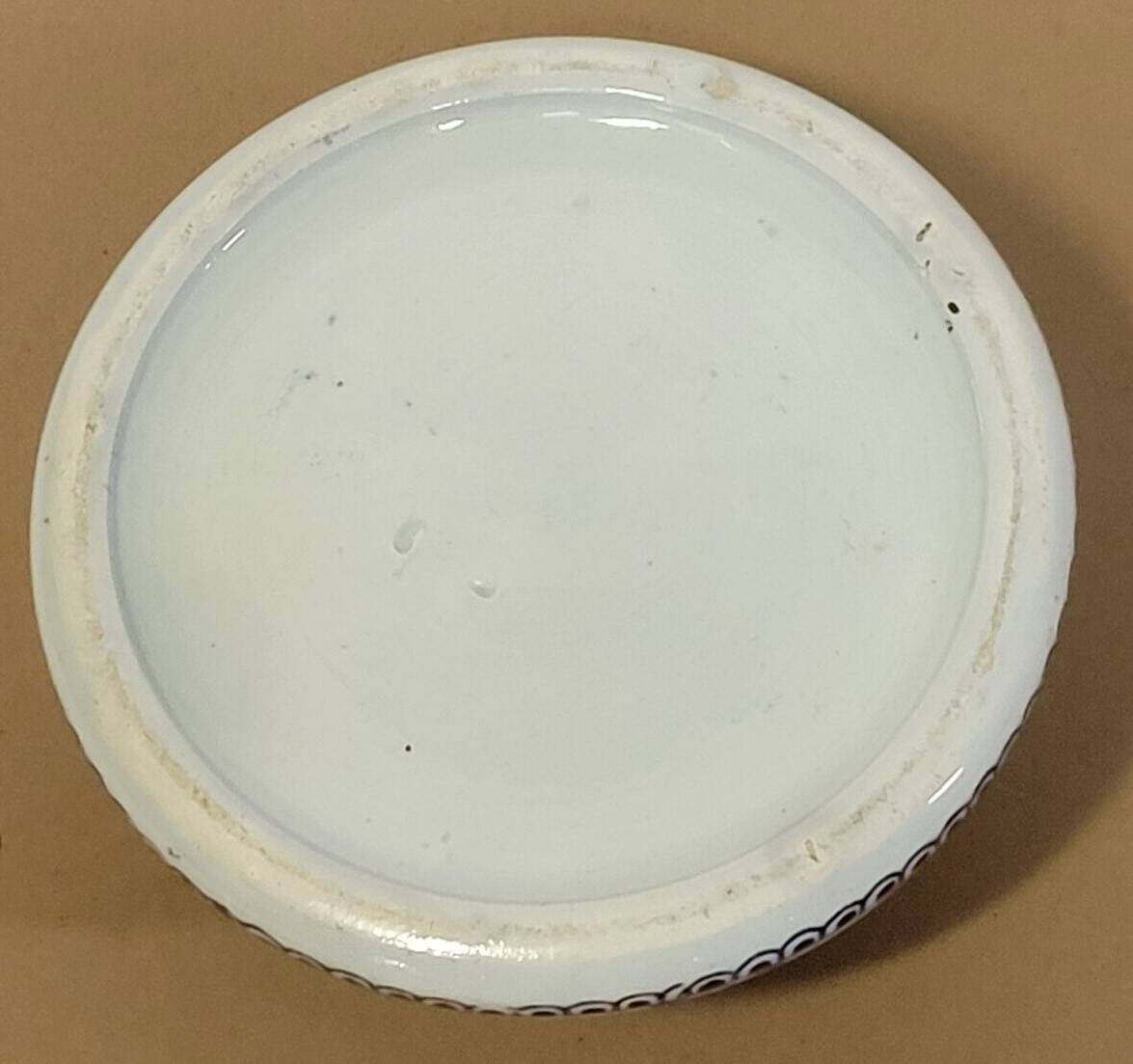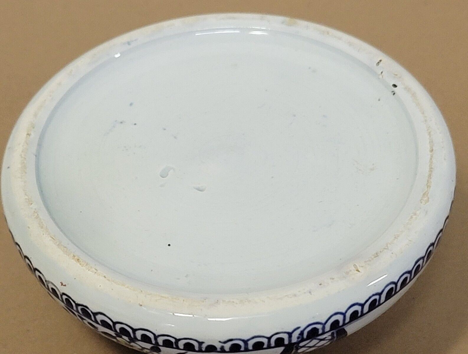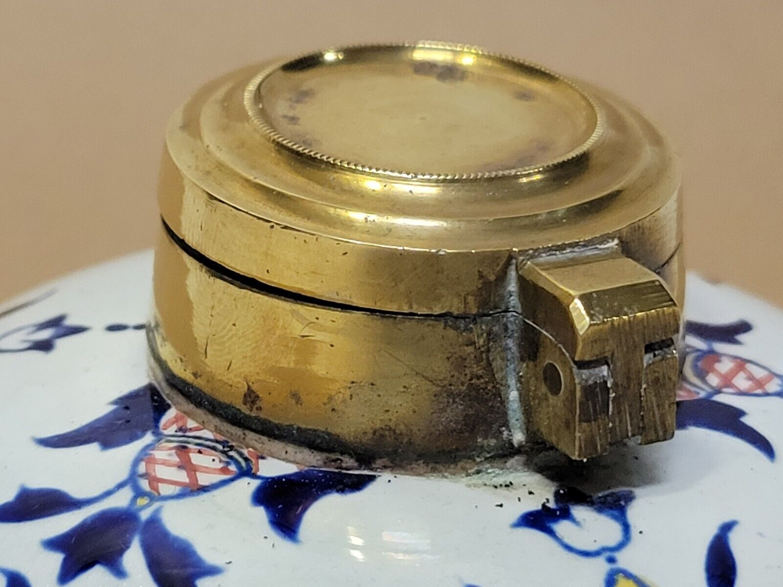 The circular contour of this inkwell is decorated with bright floral and leaf patterns. The hinged lid (with a tab) and collar are made of brass.