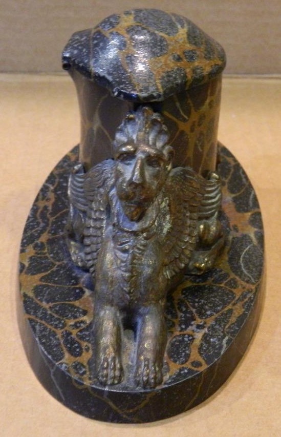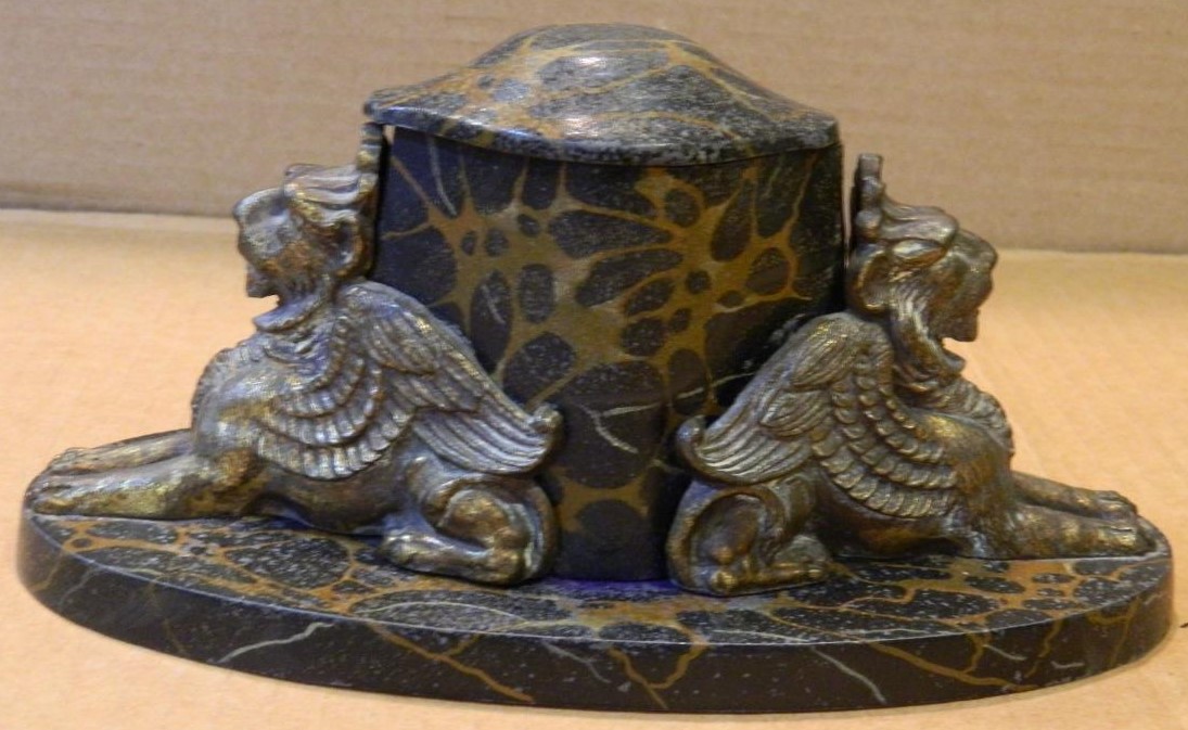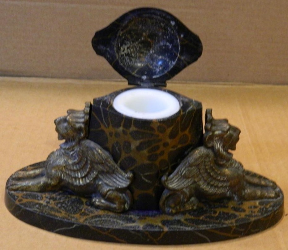Bradley & Hubbard brass inkstand with two gold tone griffins on either side of an inkwell with a marbleized finish.