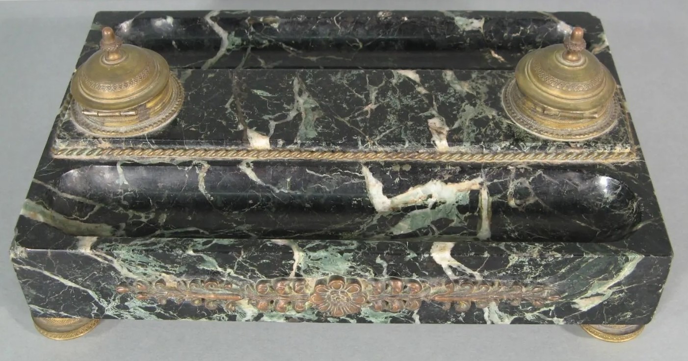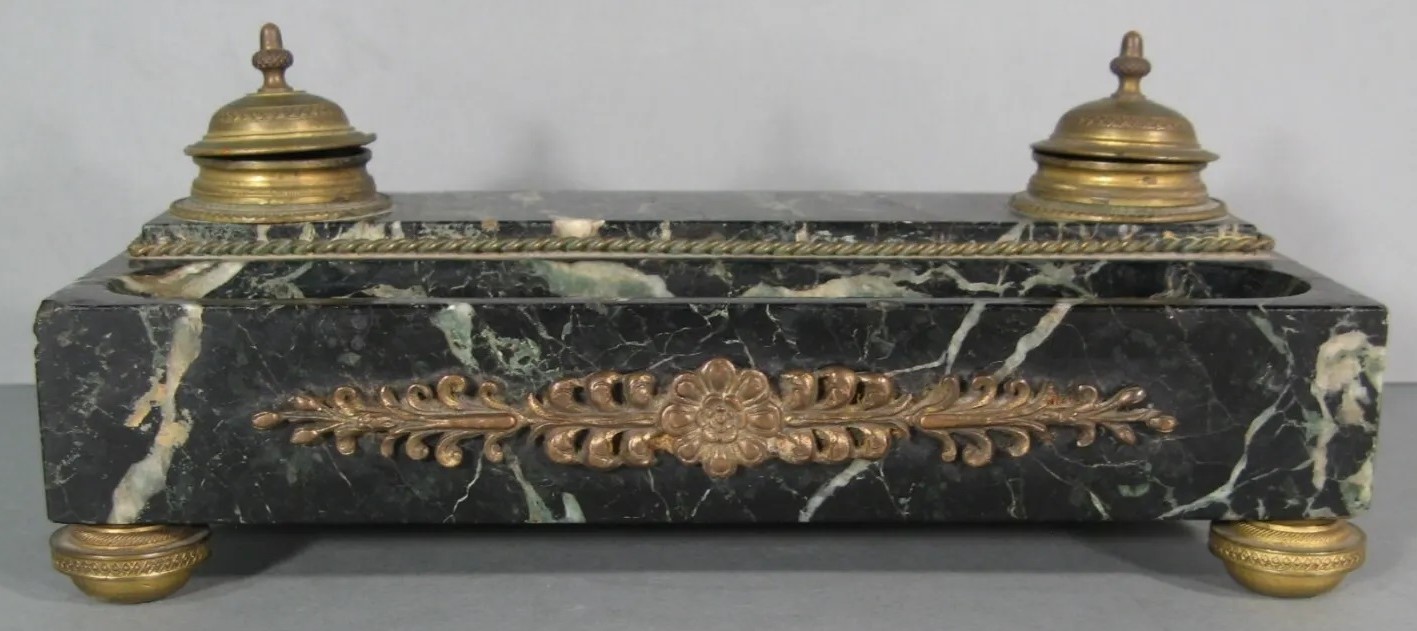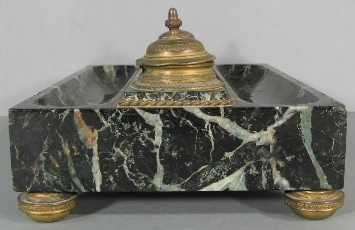Set on four gilded bronze ball feet, this double inkstand has a Verde Antico marble base with two pen channels and hold two gilded bronze inkwells (inserts missing) with hinged lids.
