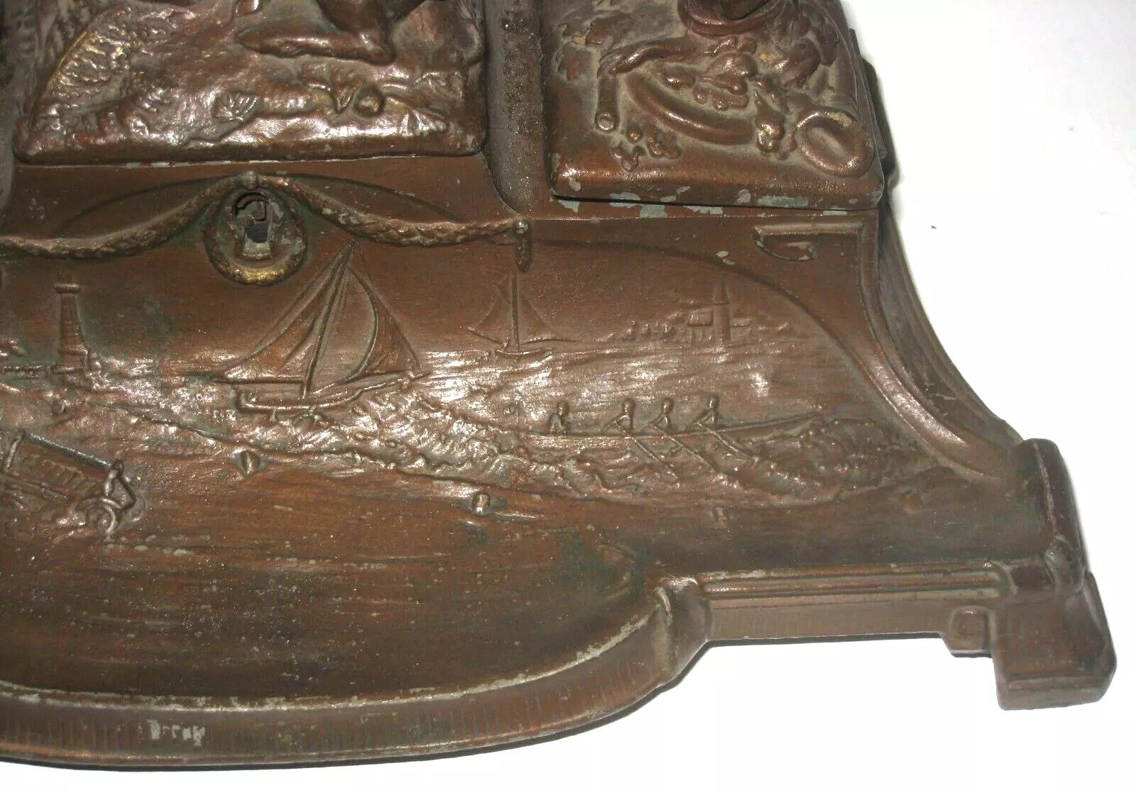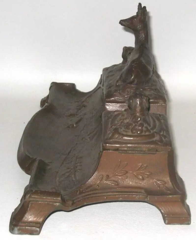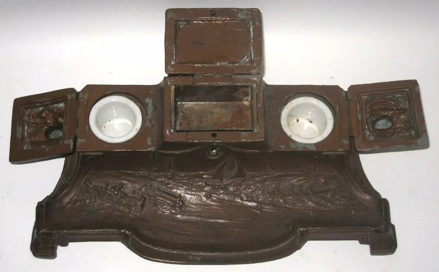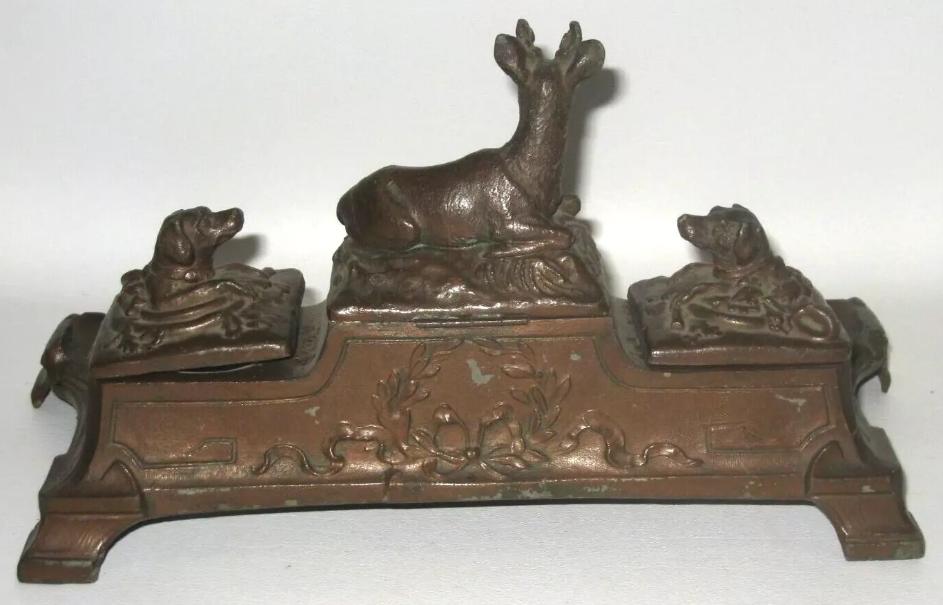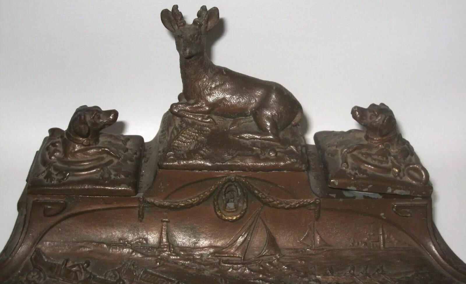 This double inkstand combines a variety of elements. In the center is a prone deer lying on the lid to a storage compartment with a lock and key. Flanking the deer are two inkwells, each with a hinged lid topped with a dog’s head finial. The front pen tray is embossed with a lighthouse, sailboats, a sculling crew, and racing cars, possibly racing on the shore.