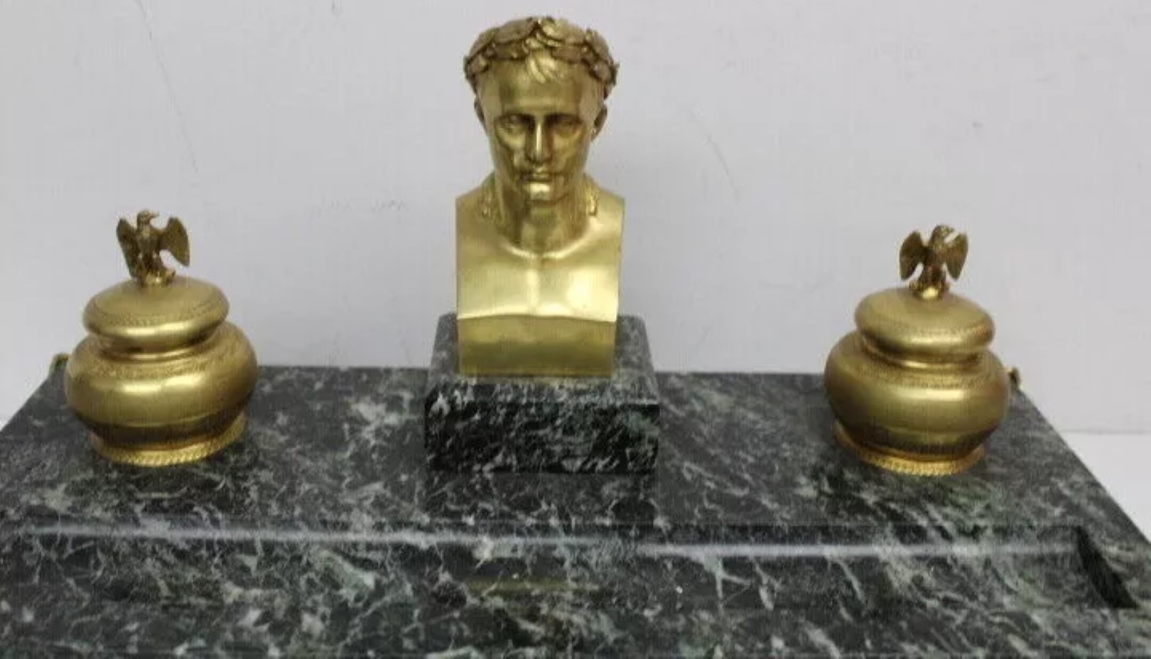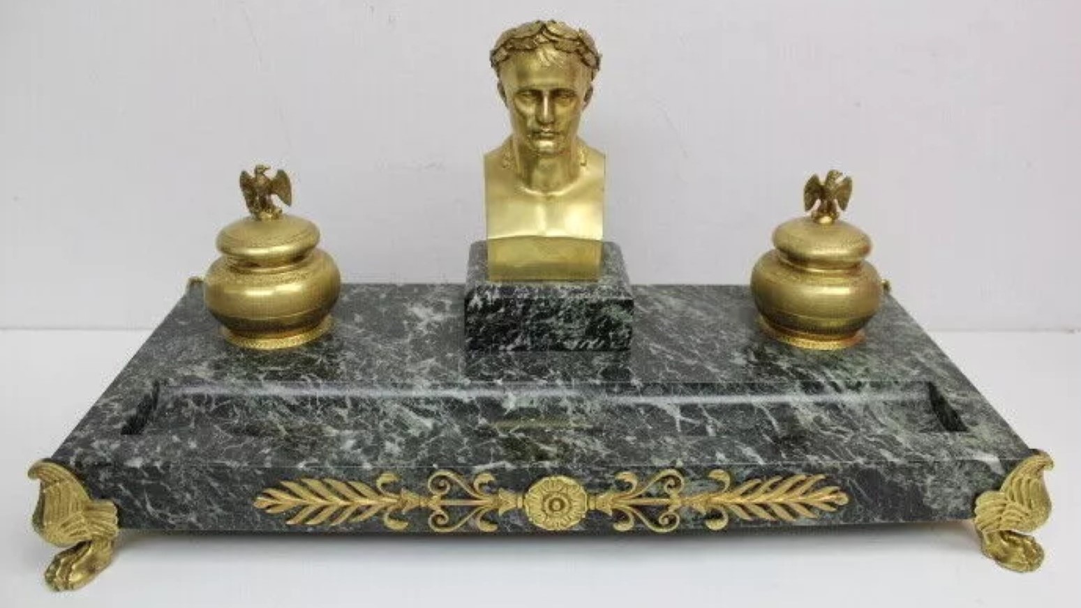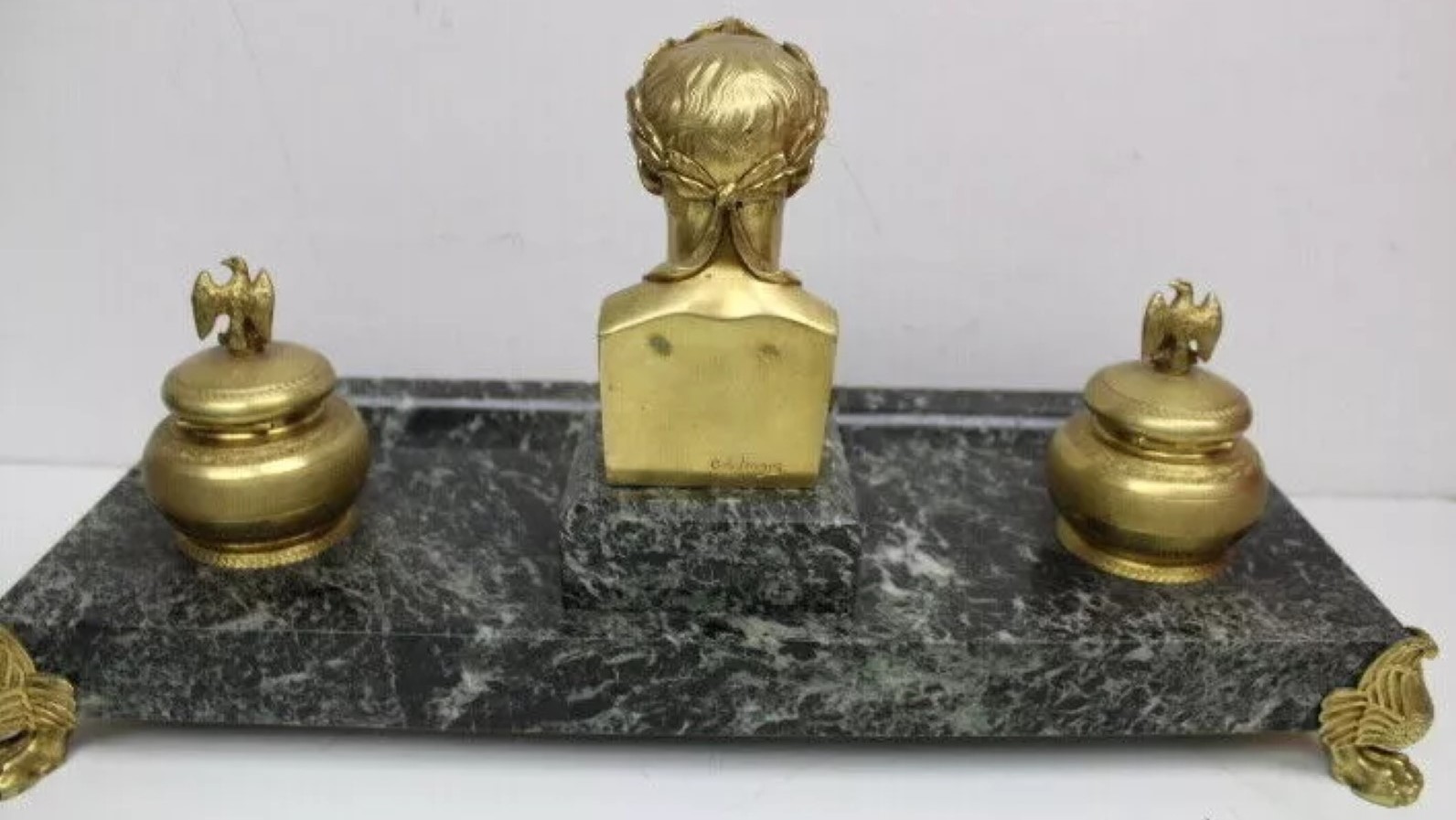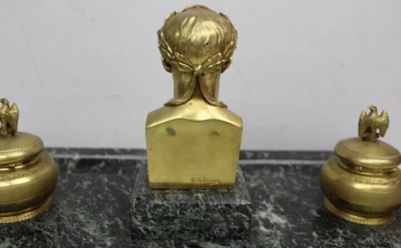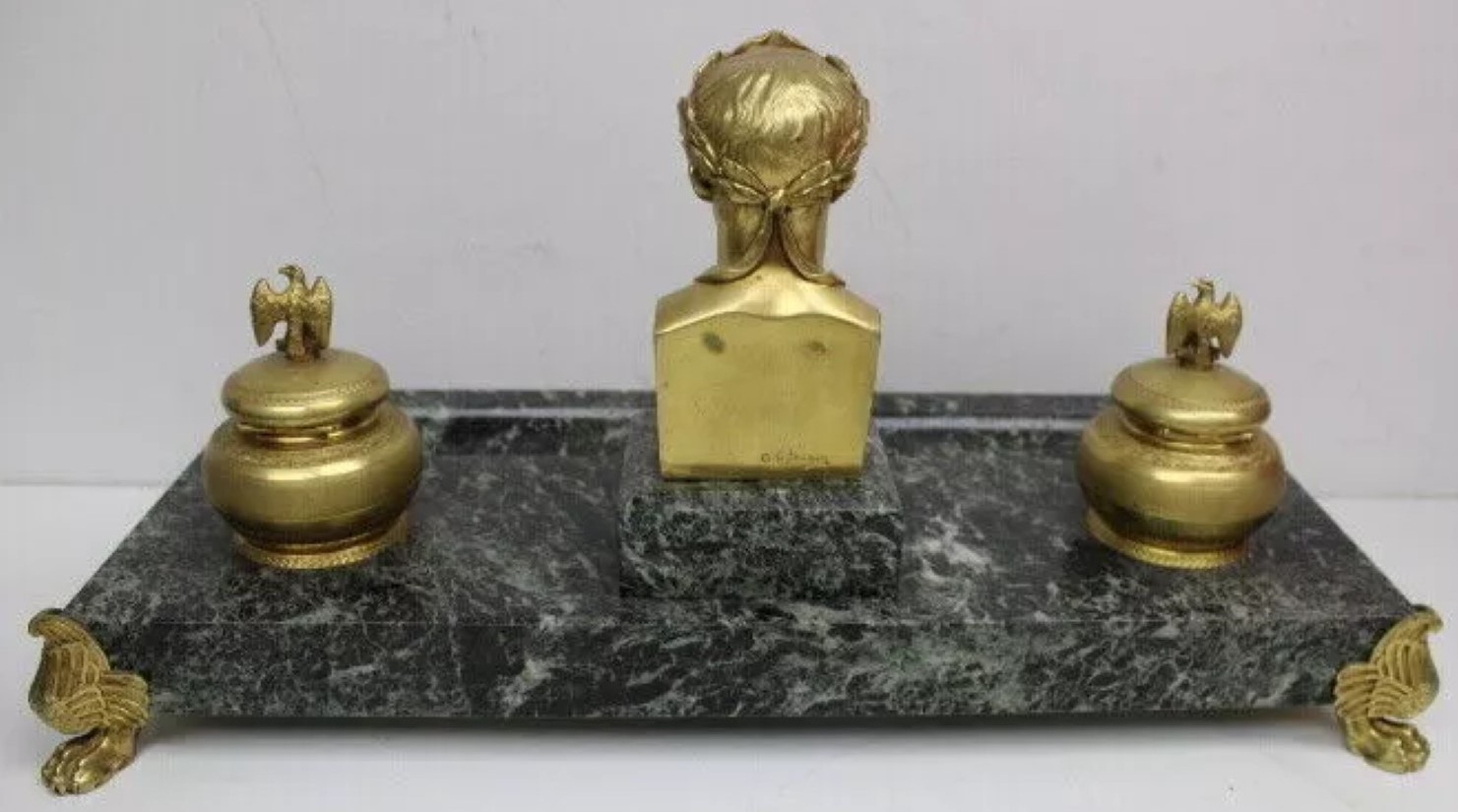 This double inkstand features a green marble base adorned with gilt brass details. At the center stands a bust of Emperor Napoleon, placed on a raised marble pedestal. The marble base is supported by four claw feet. The front façade is embellished with an applied palmettes motif. Flanking the bust are two inkwells, each topped with a small eagle figure. The back of the bust bears a signature: “C. de Franoz”. François-Charles de Franoz was a French artist born in 1850 and died in 1908.