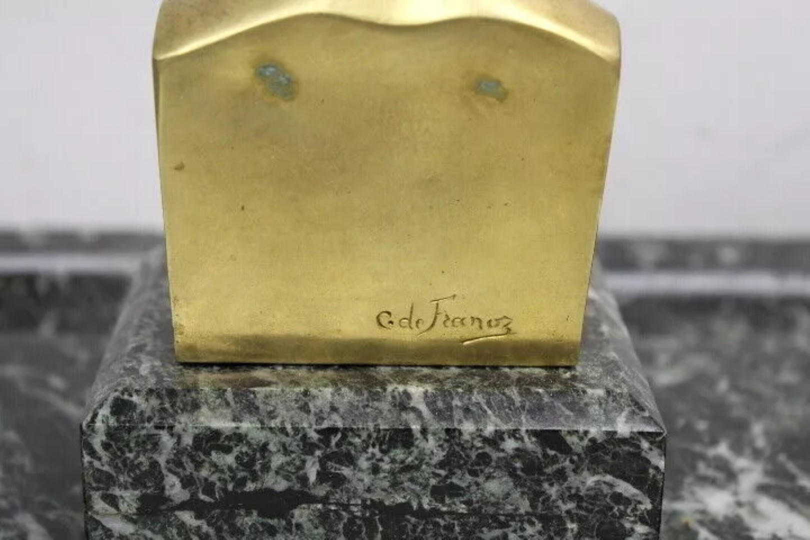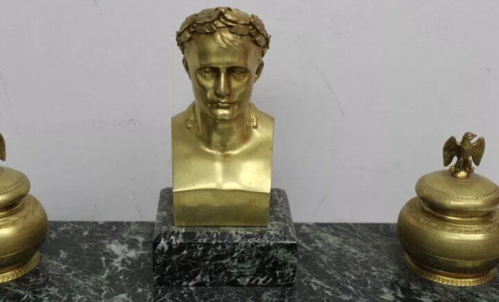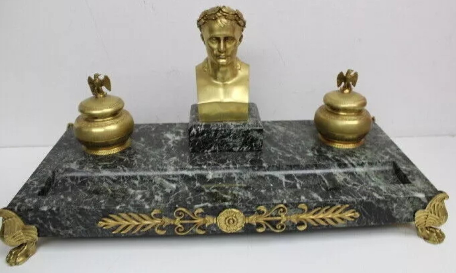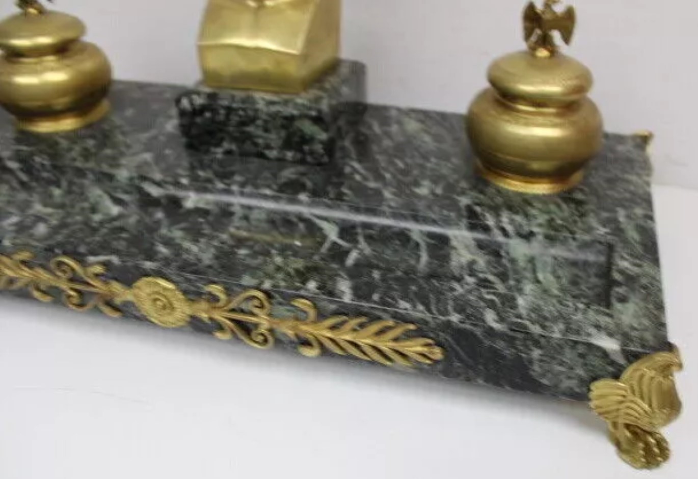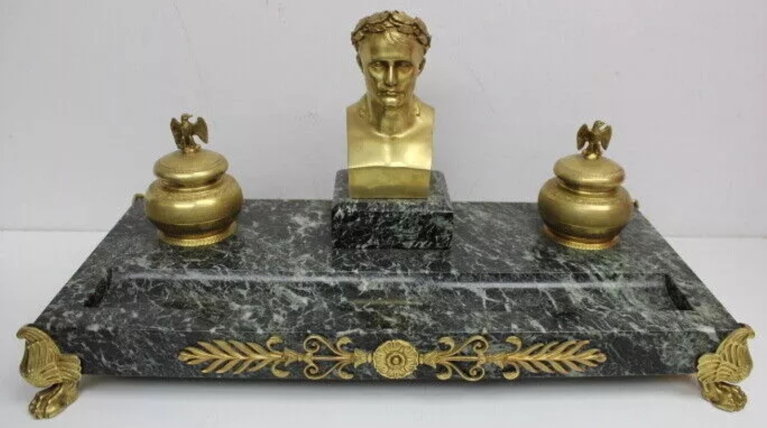 This double inkstand features a green marble base adorned with gilt brass details. At the center stands a bust of Emperor Napoleon, placed on a raised marble pedestal. The marble base is supported by four claw feet. The front façade is embellished with an applied palmettes motif. Flanking the bust are two inkwells, each topped with a small eagle figure. The back of the bust bears a signature: “C. de Franoz”. François-Charles de Franoz was a French artist born in 1850 and died in 1908.