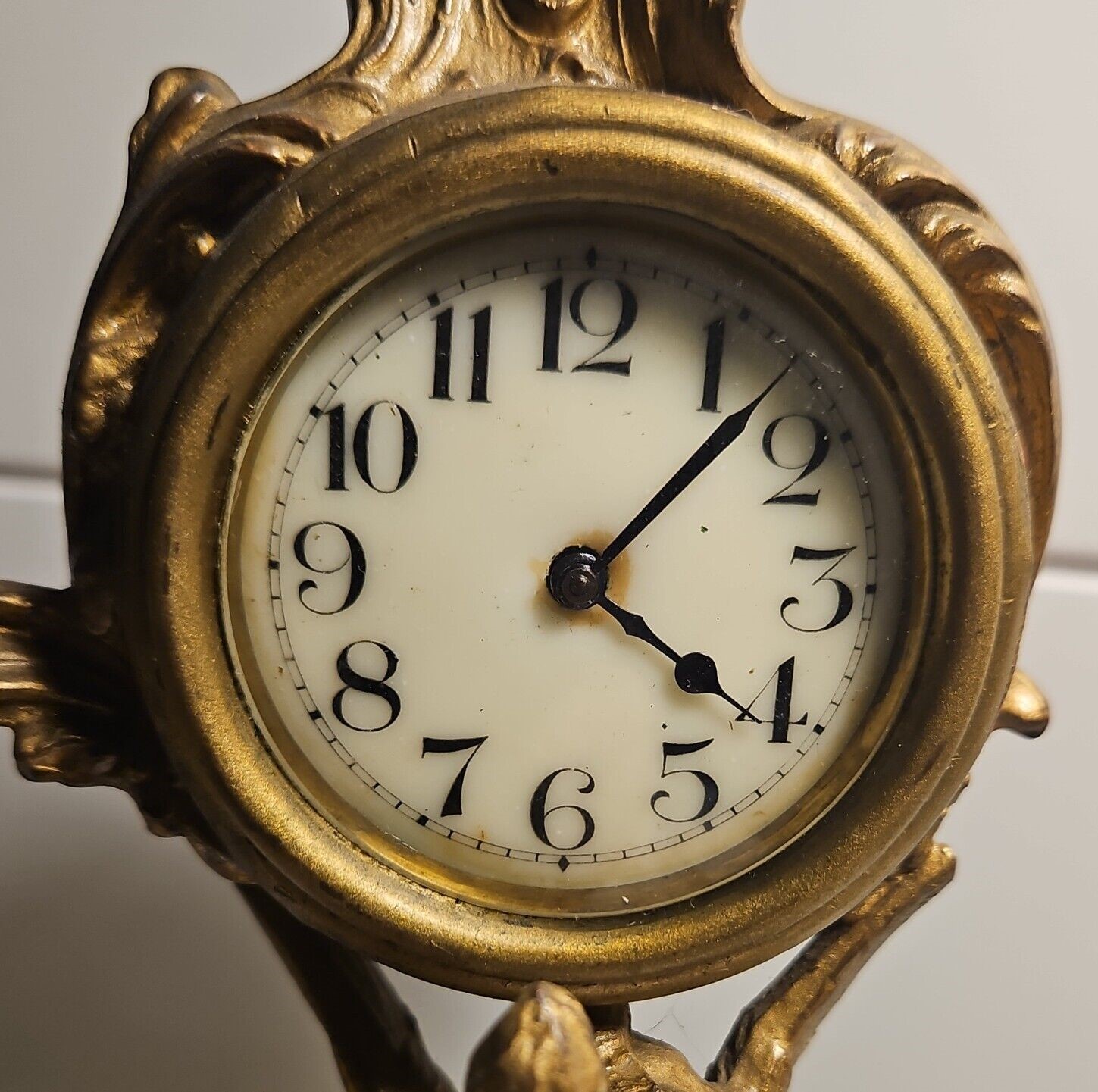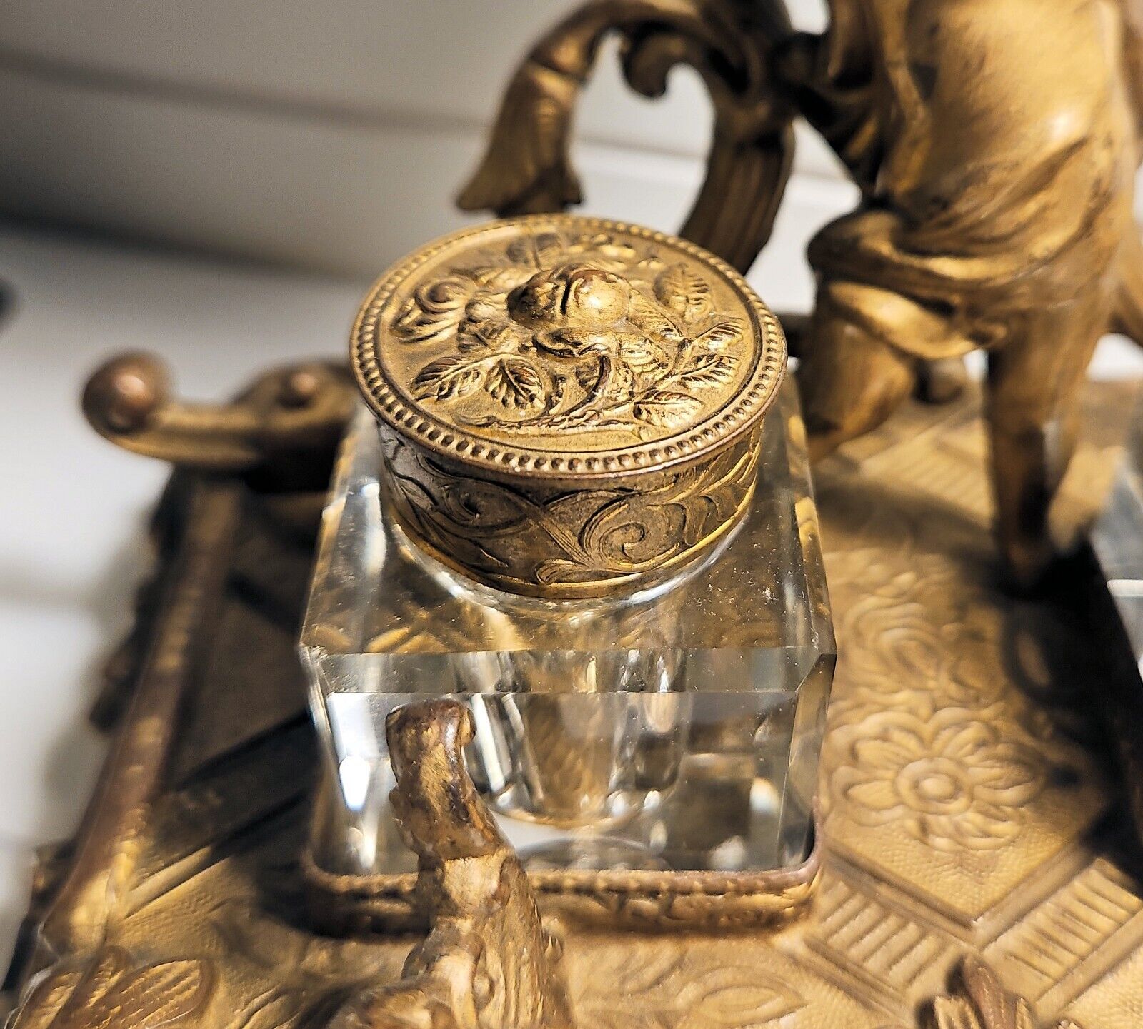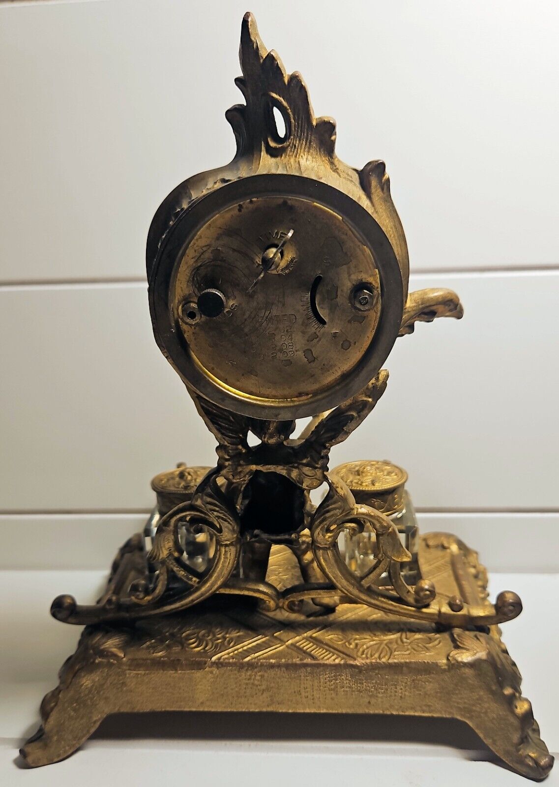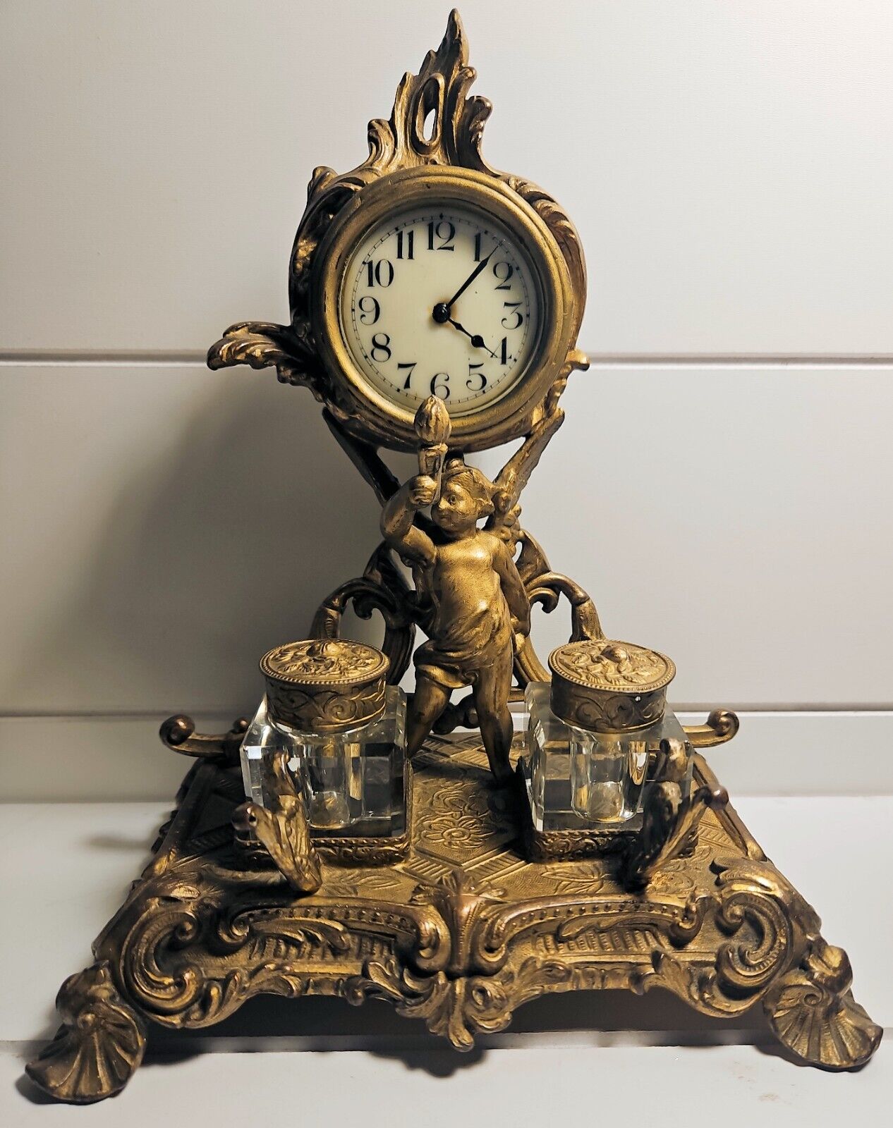 A cherub, holding a torch, stands between two glass inkwells and in front of a clock. The Waterbury clock is not working, but all parts are there. The patent dates on the clock movement are from 1902 to 1909.