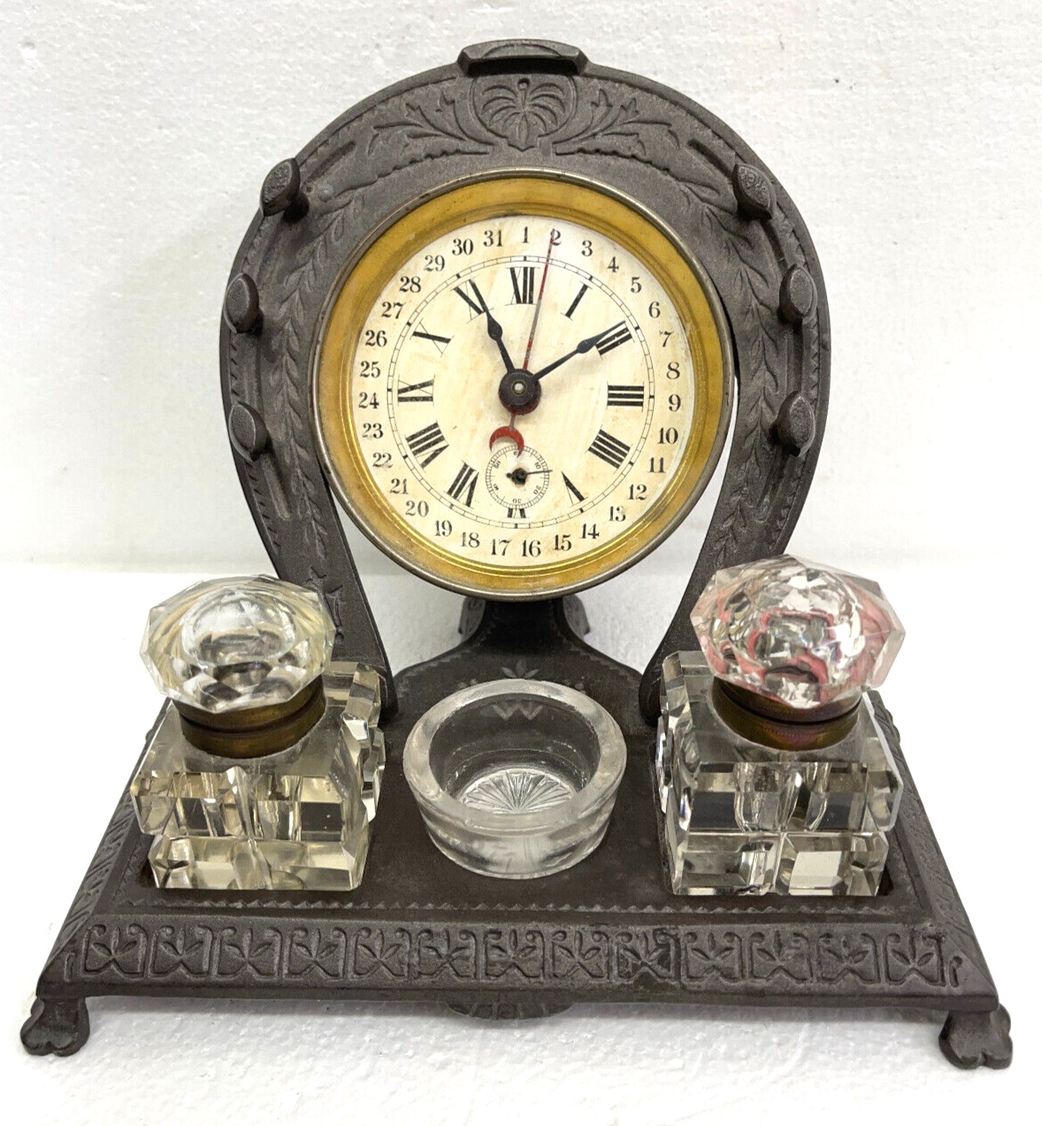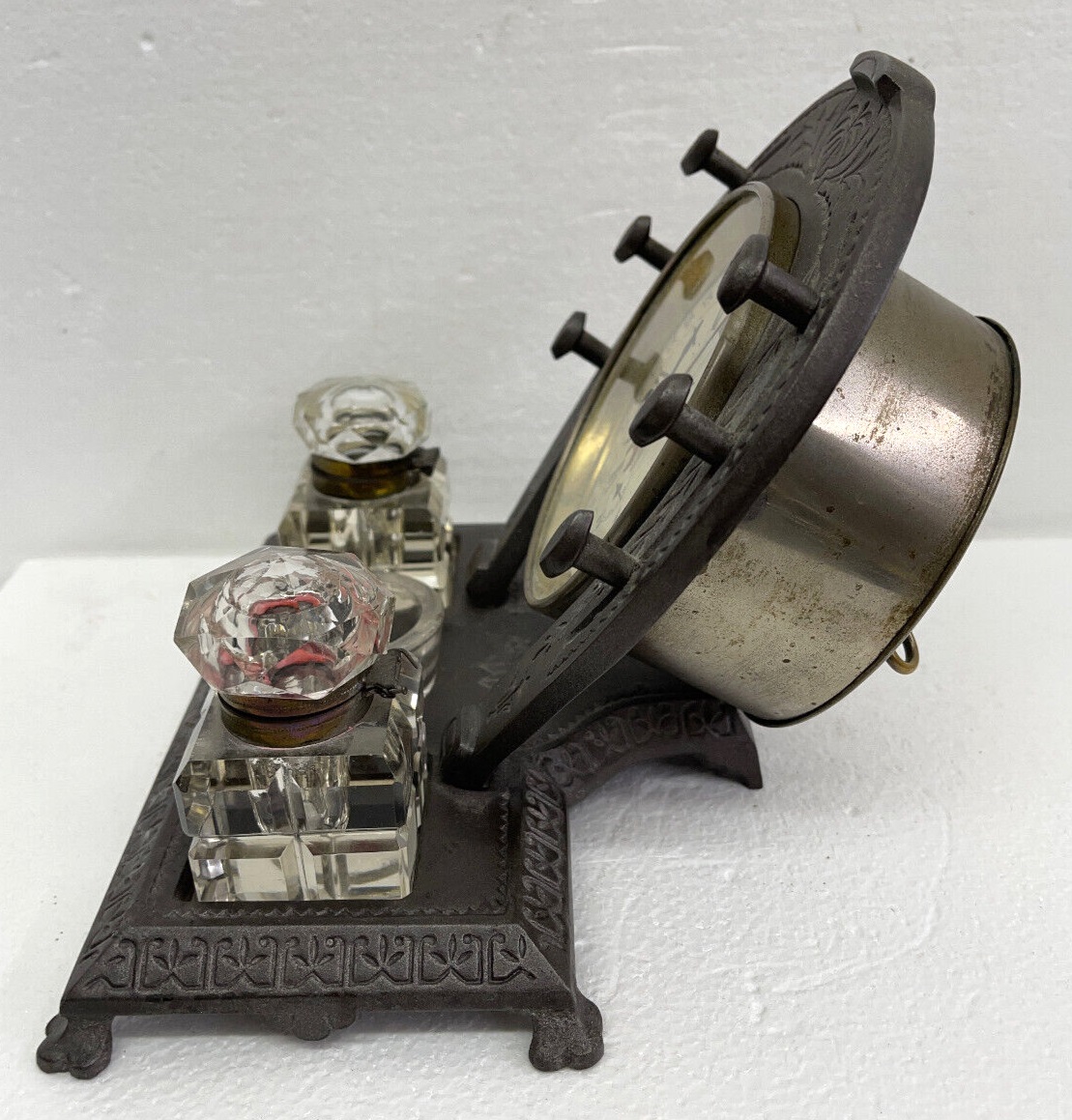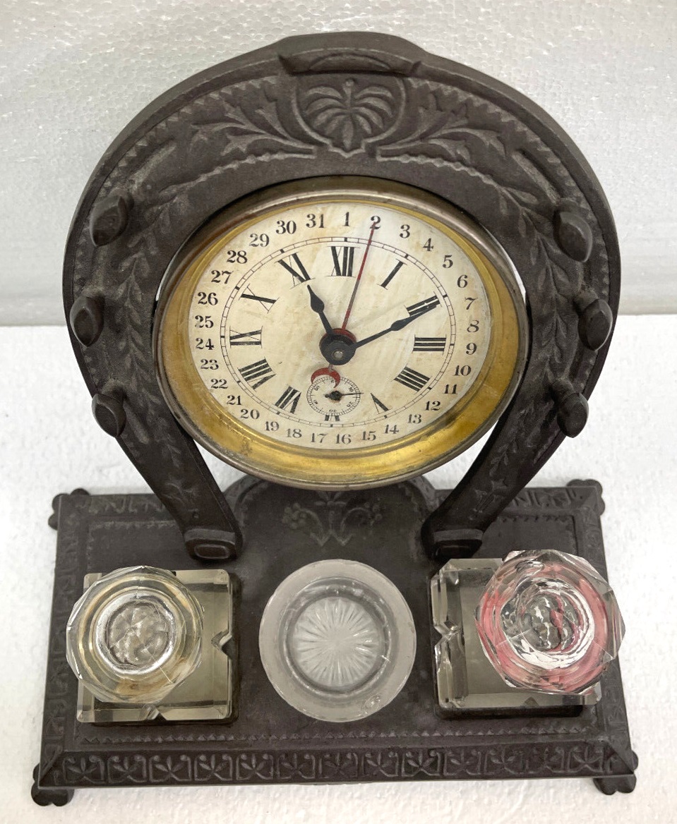 A cast iron inkstand holds two inkwells and a utility cup. Attached to the base is a large horseshoe-shaped pen rack which frames a combination clock / calendar. The base is marked “N.M.S. NY, No. 202 A & B”.