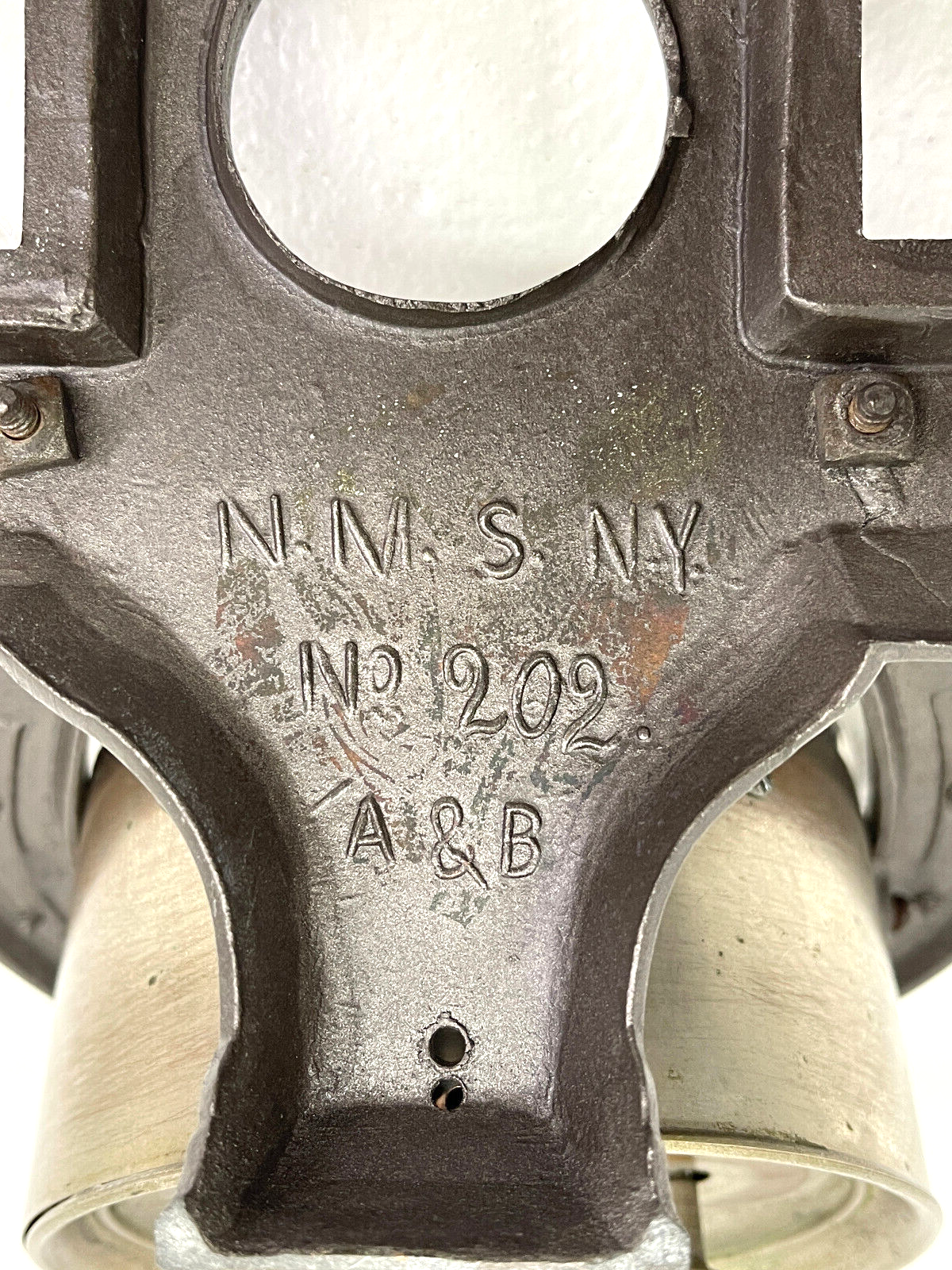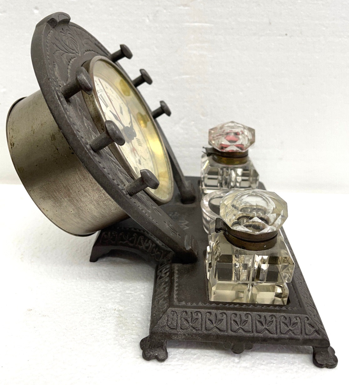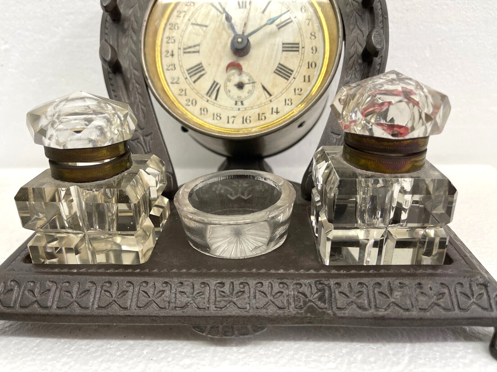 A cast iron inkstand holds two inkwells and a utility cup. Attached to the base is a large horseshoe-shaped pen rack which frames a combination clock / calendar. The base is marked “N.M.S. NY, No. 202 A & B”.