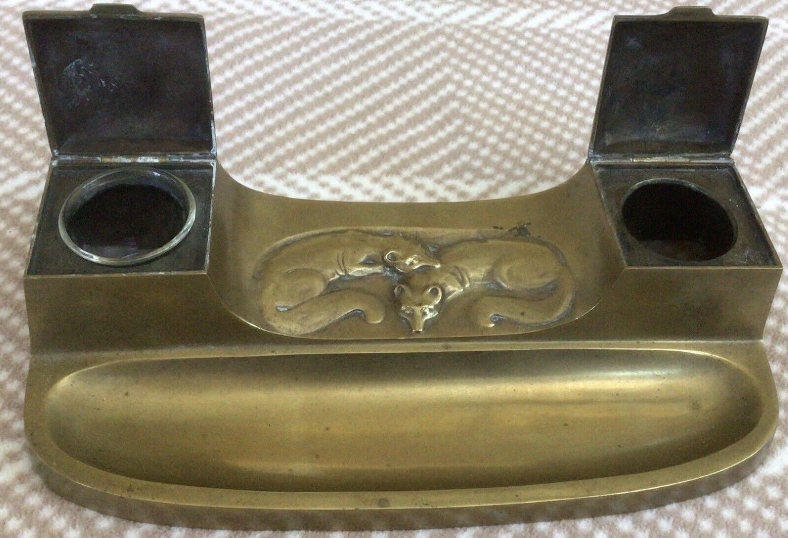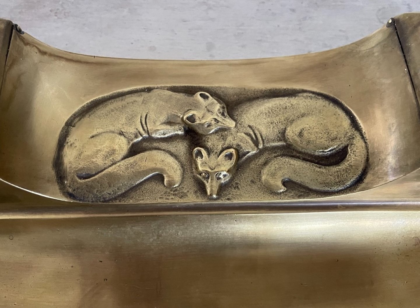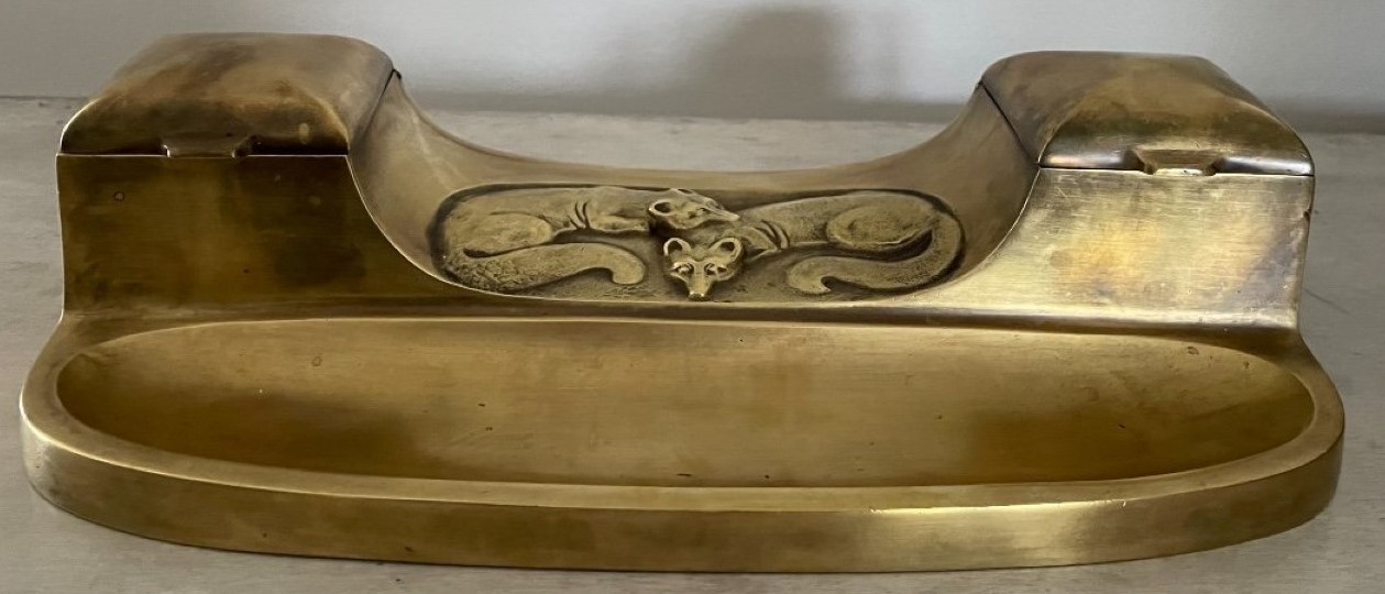 Between the two hinged inkwells of this gilt bronze inkstand are two foxes intertwined, shown in relief. In the front is a large pen tray.