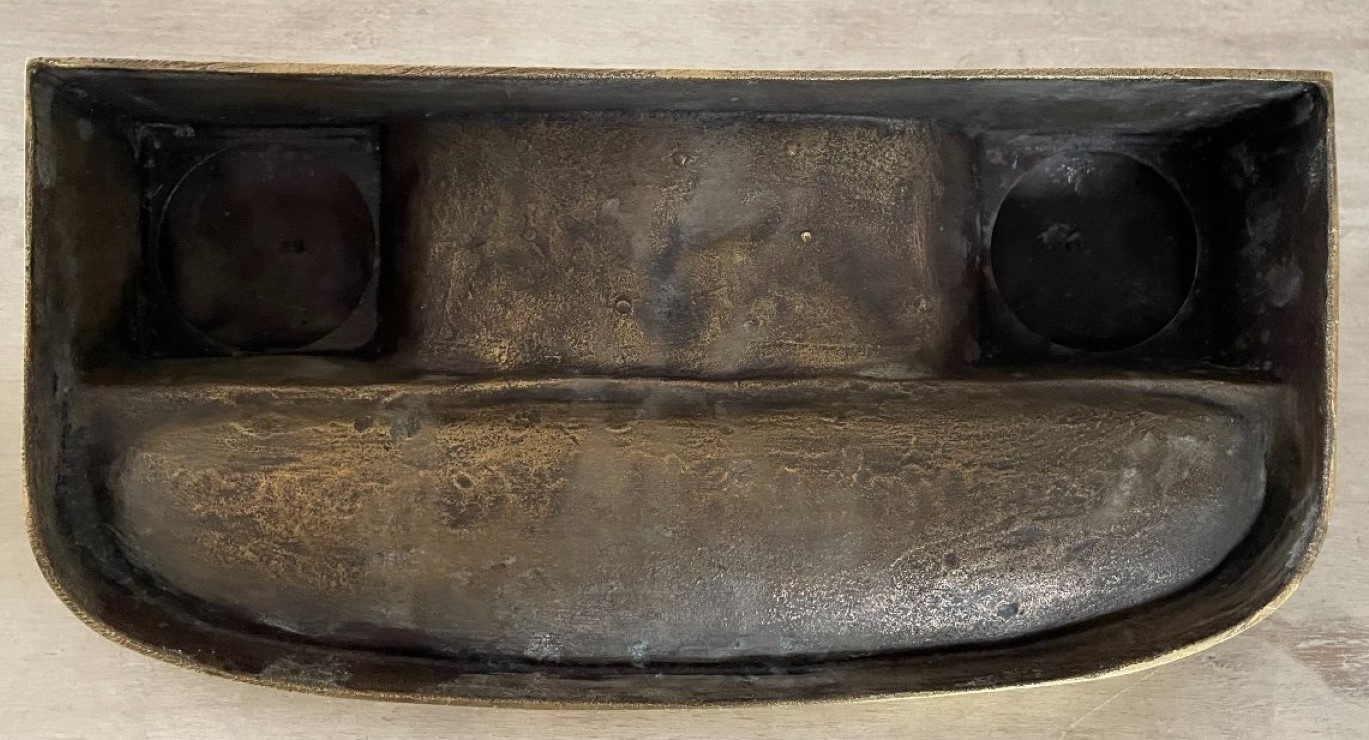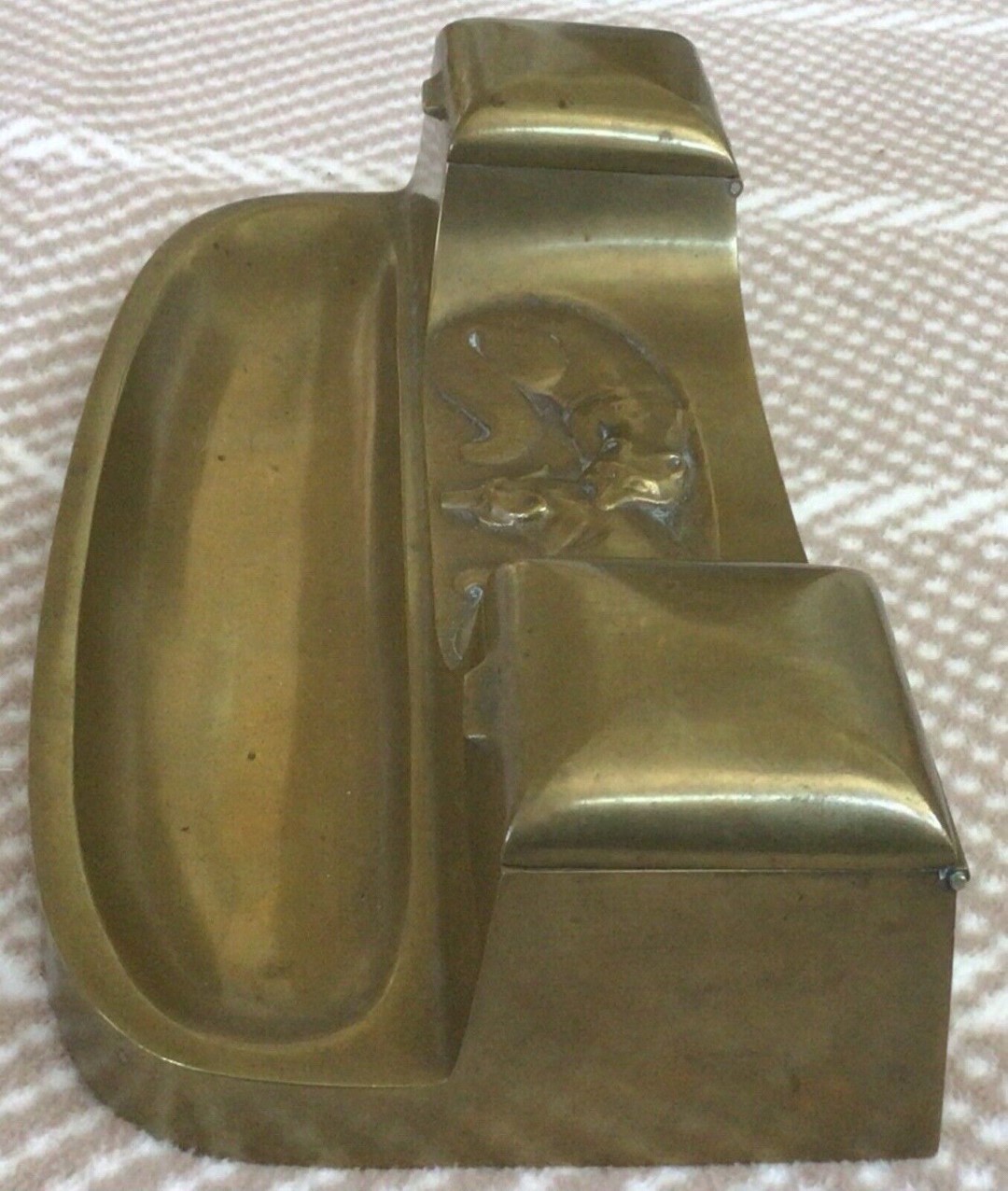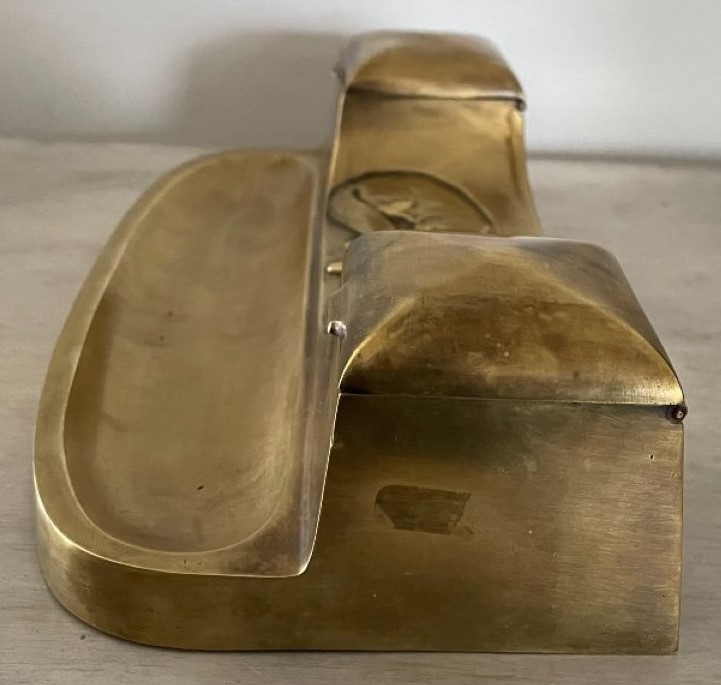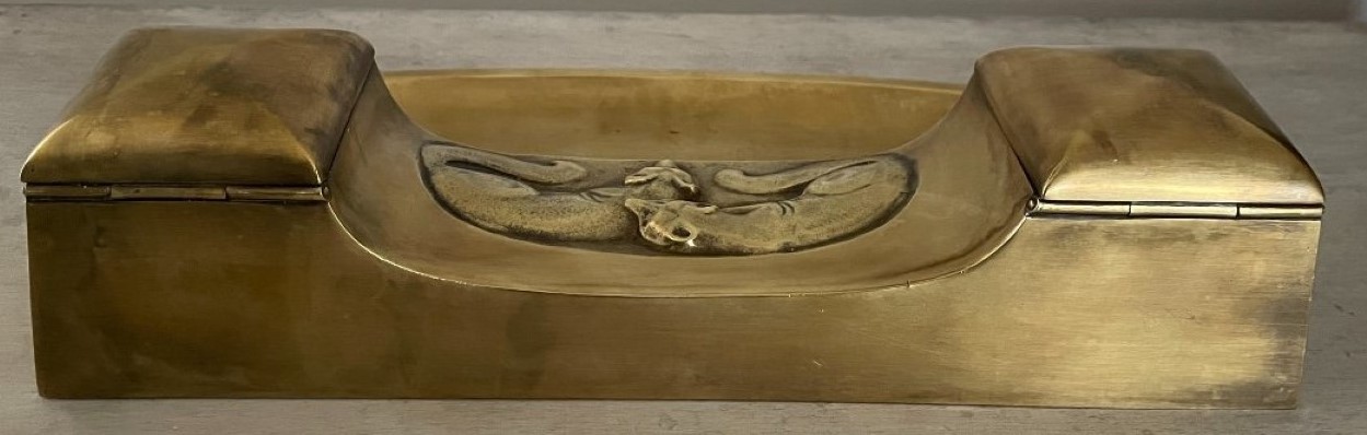 Between the two hinged inkwells of this gilt bronze inkstand are two foxes intertwined, shown in relief. In the front is a large pen tray.