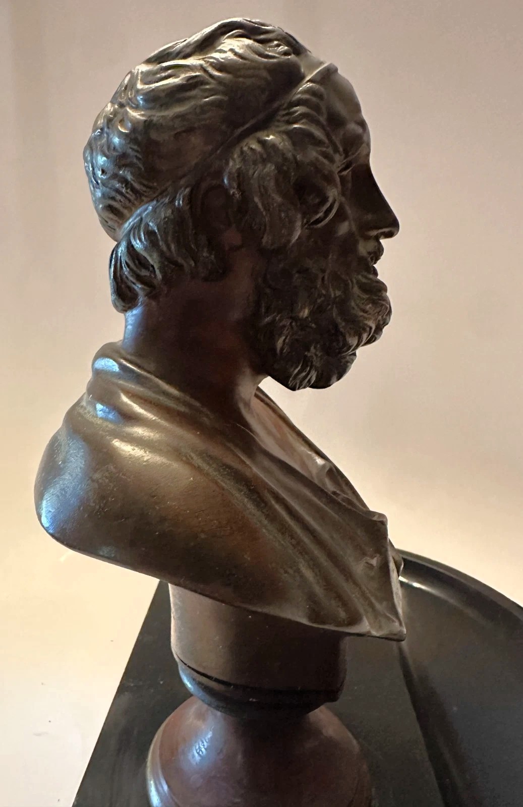 - Central Feature (Bust): A detailed bust of the Greek poet Homer is mounted prominently in the center of the base.