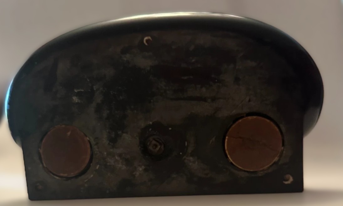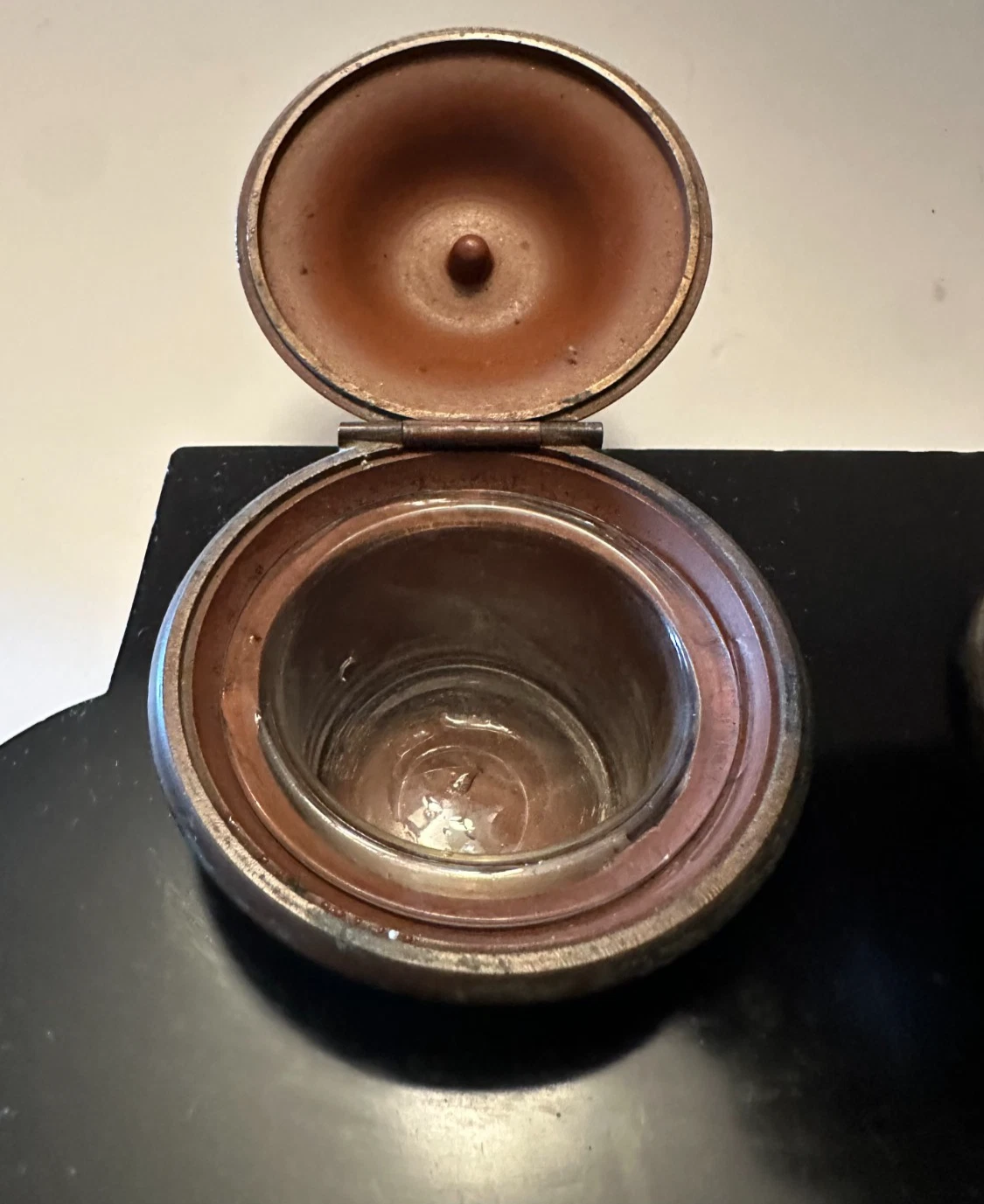 - Inkwells: The base holds two circular inkwells with glass inserts recessed into the marble. The wells are topped with bronze hinged lids.
