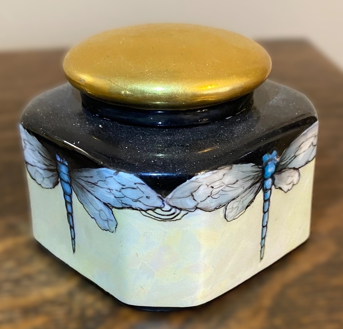 This ceramic inkwell features a striking Art Nouveau (Jugendstil) design, identified by its hand-painted dragonfly motifs and iridescent luster finish.