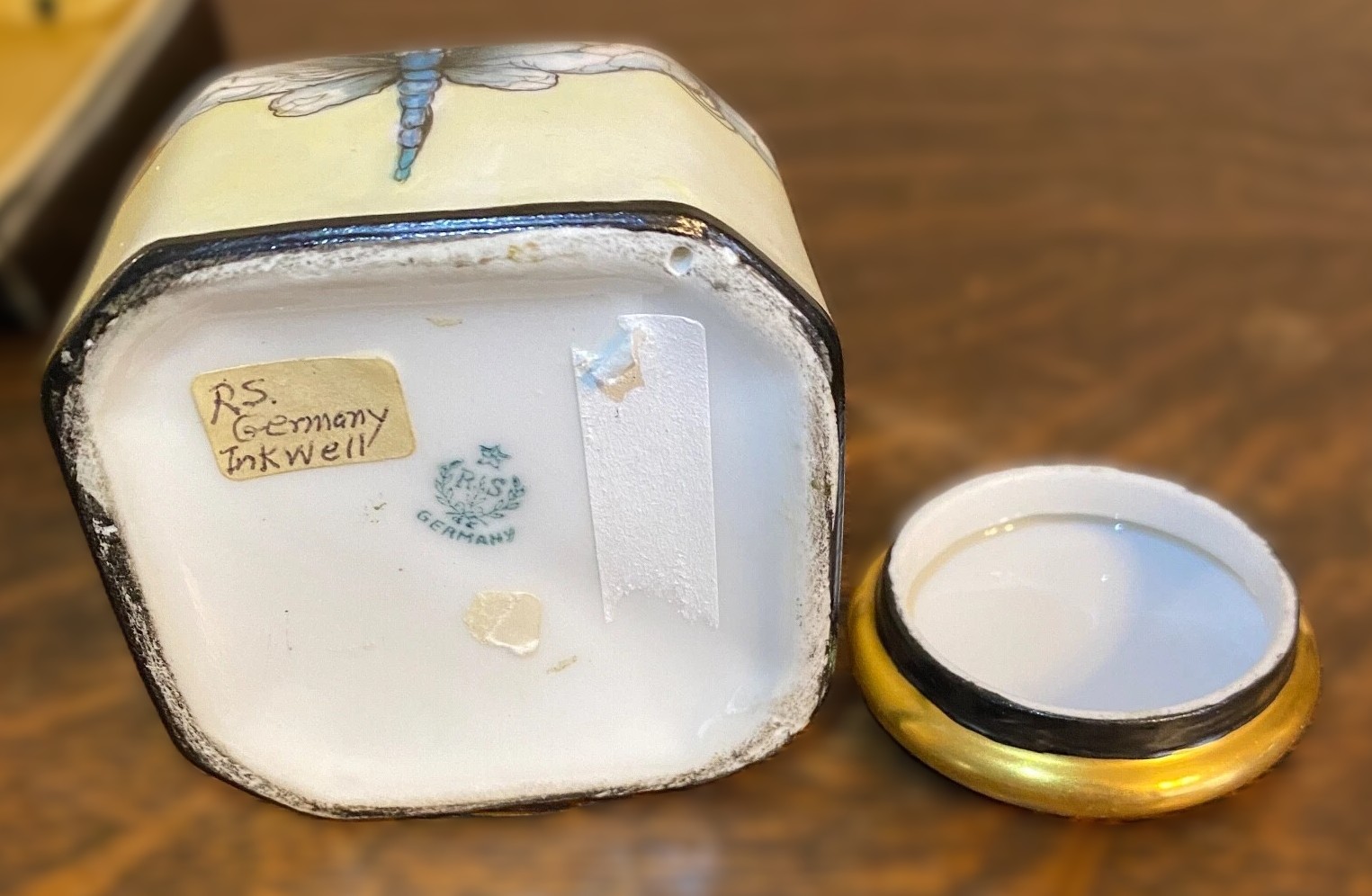 The presence of the Reinhold Schlegelmilch mark on this dragonfly inkwell signifies that it was part of their premium line. The firm was famous for its technical mastery of iridescent luster glazes and delicate hand-painted nature scenes, which were highly successful in the American market during the early 20th century.