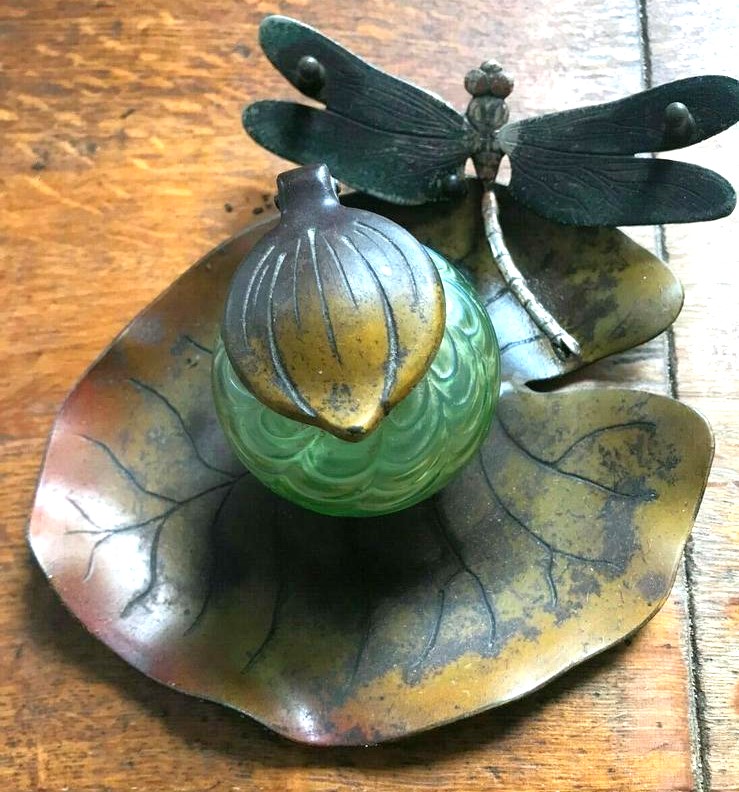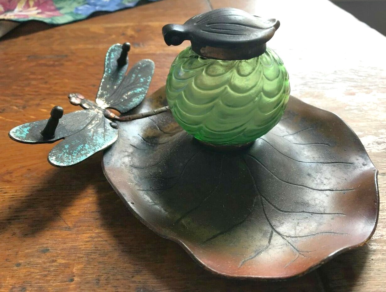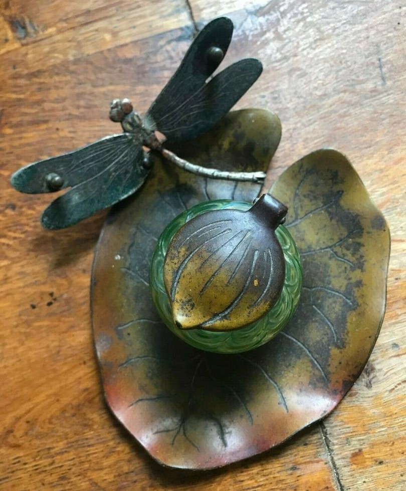 A dragonfly is perched at the edge of a lily pad. In the center is a Favrile-style glass inkwell, with a predominant green color with iridescent blues and pinks. The dragonfly still has some of its iridescence remaining in its wings and serves as a pen rest. The lily pad has retained most of its original brown / ochre coloring. Attributed to French artist B. Soulier.