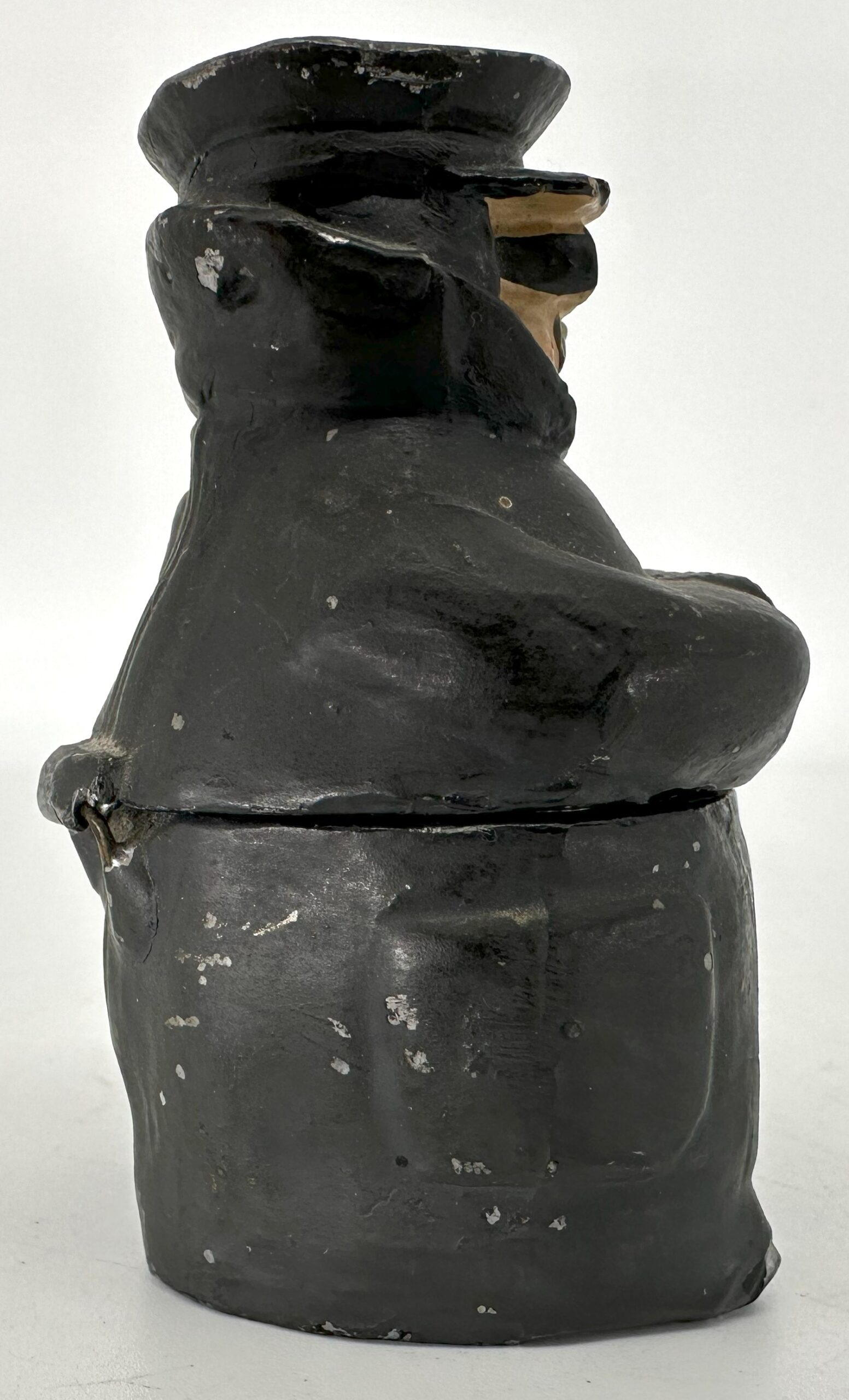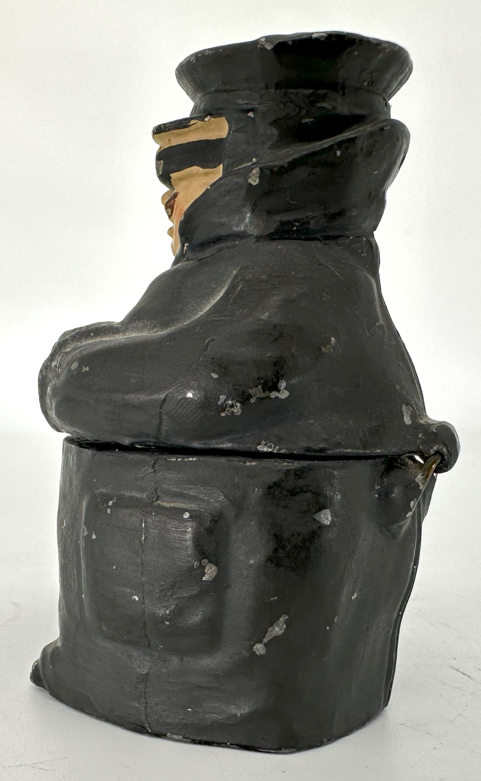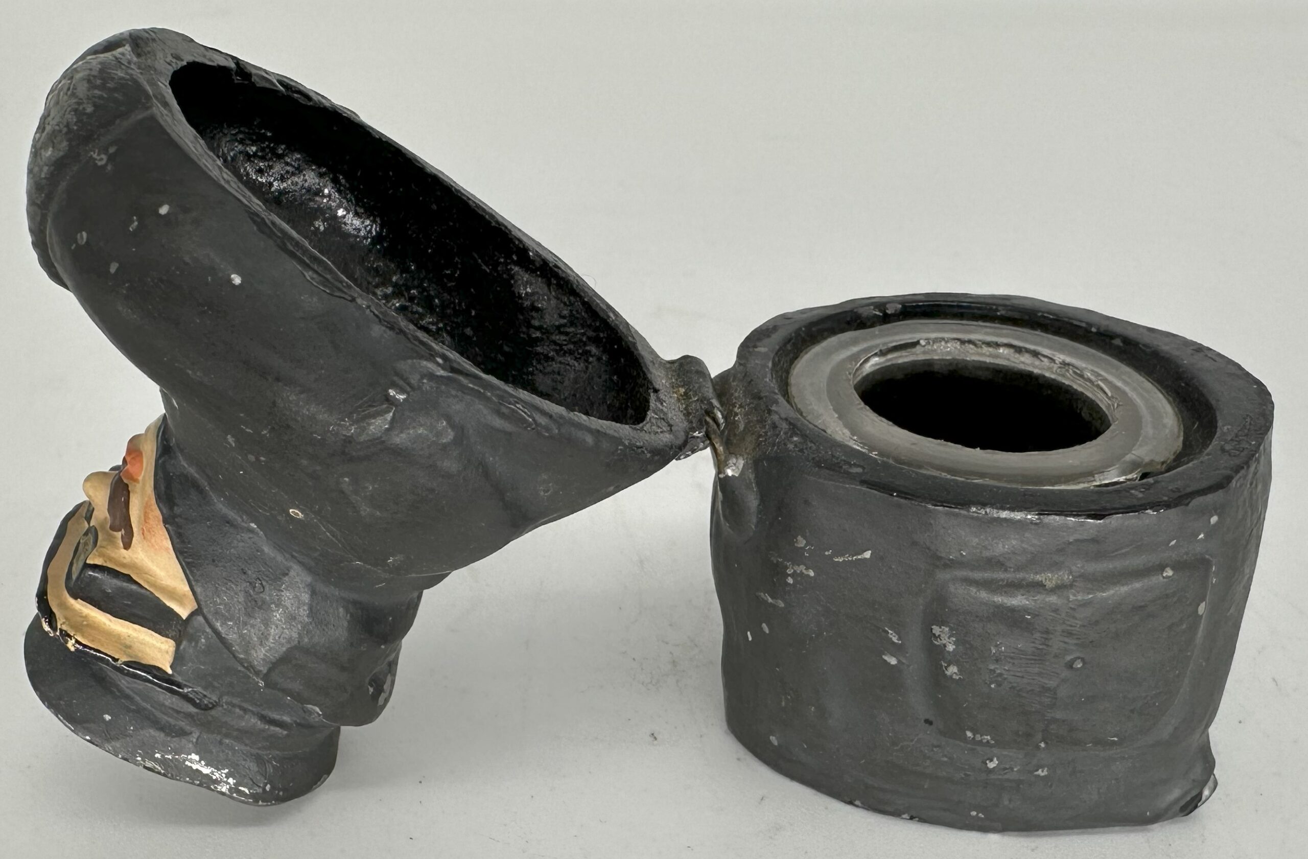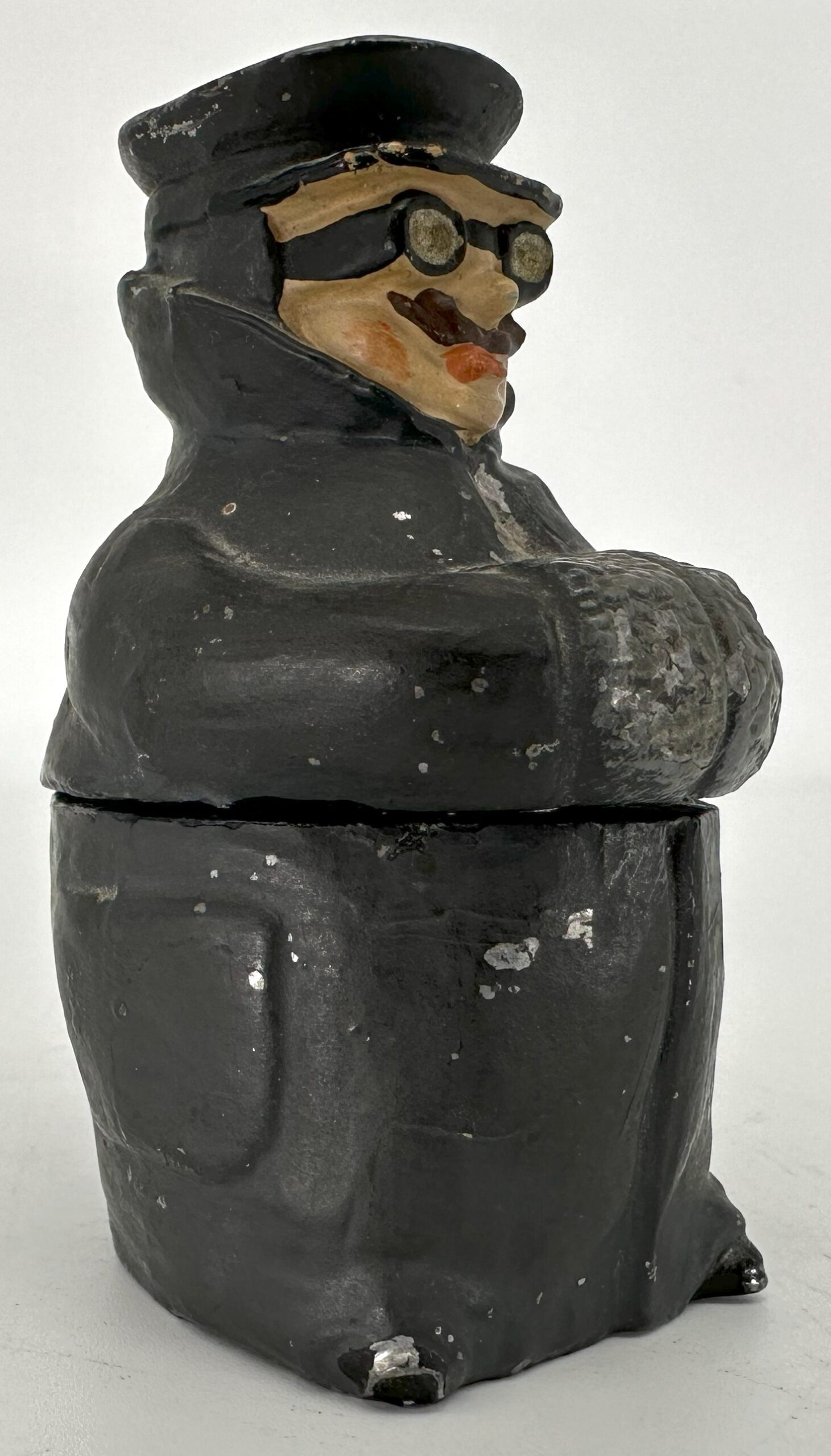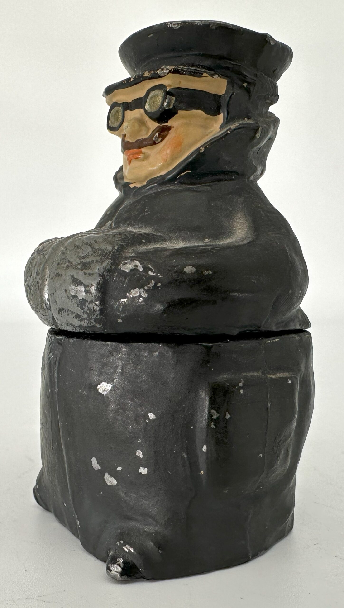 Novelty inkwell in the form of an early 1900’s open car driver / chauffeur. He is decked out in his duster jacket, cap, and goggles.