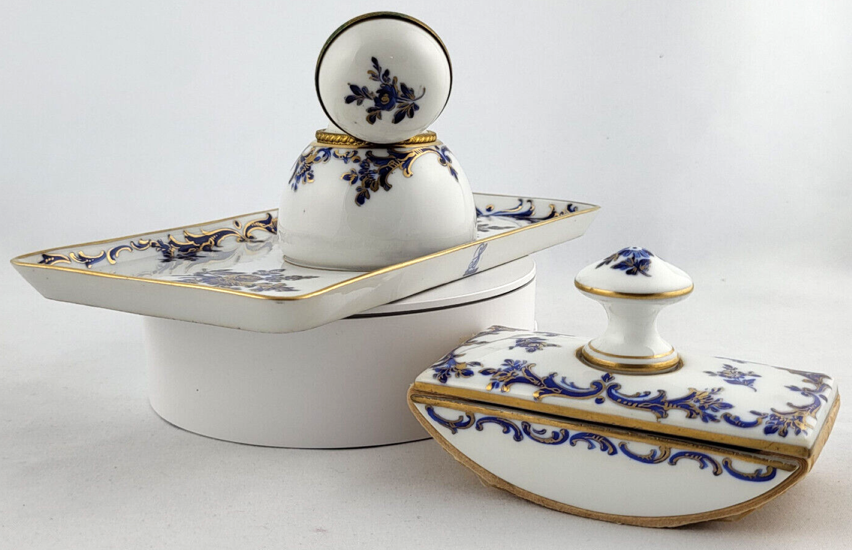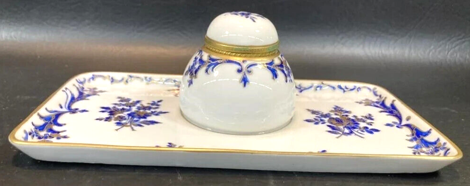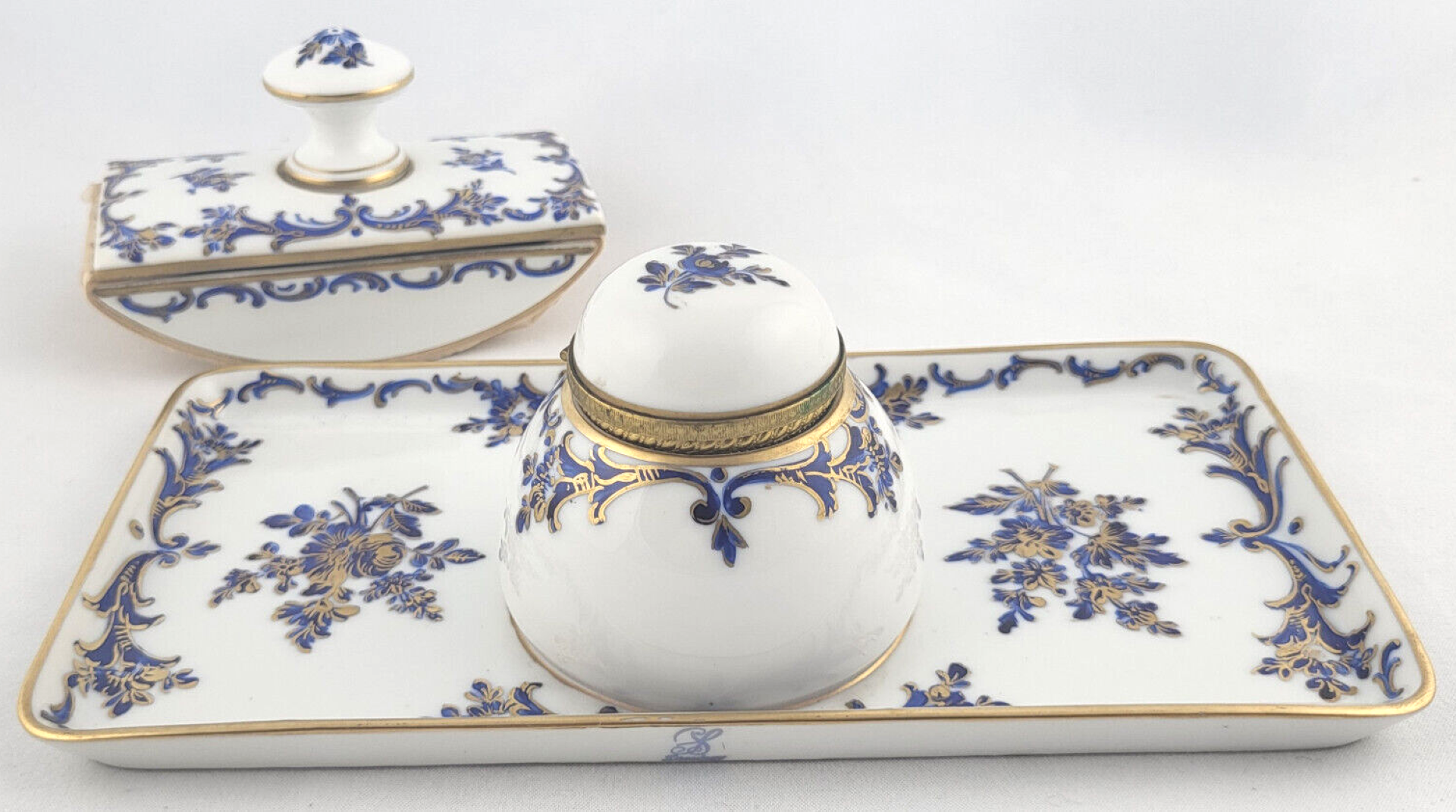 This desk set consists of an inkstand and rocker blotter, both hand-painted with a cobalt blue floral design etched in gold. These were made by Carl Thieme, and have the mark of the Saxonian Porcelain Factory in Dresden (region of Saxony, Germany).