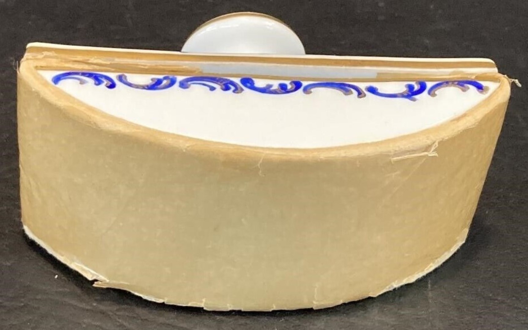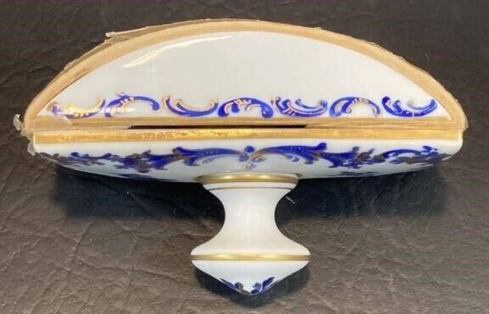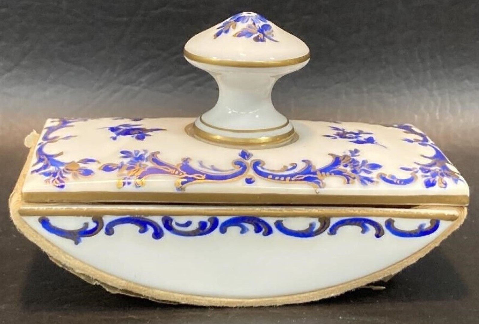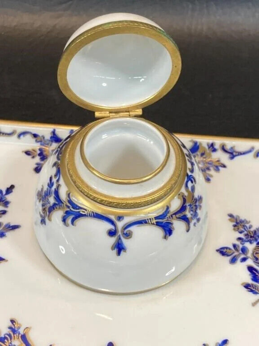 This desk set consists of an inkstand and rocker blotter, both hand-painted with a cobalt blue floral design etched in gold. These were made by Carl Thieme, and have the mark of the Saxonian Porcelain Factory in Dresden (region of Saxony, Germany).