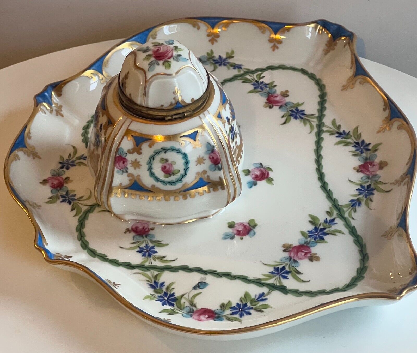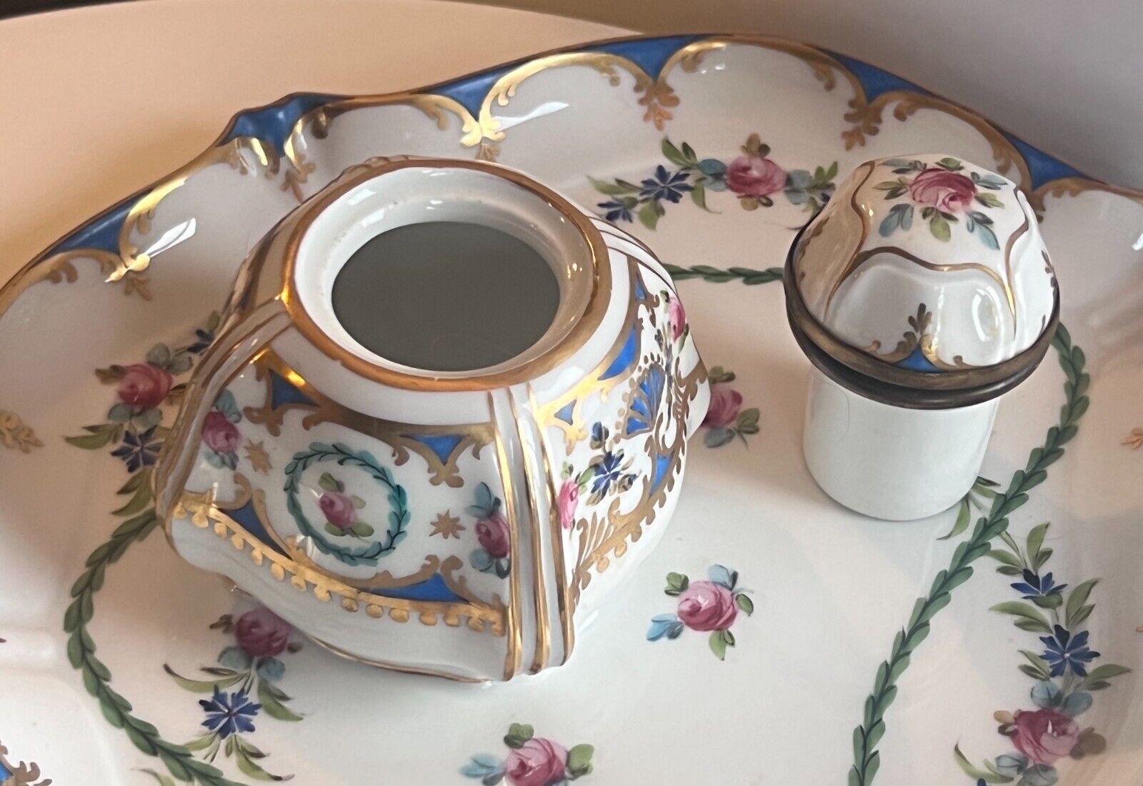 A white porcelain inkstand adorned with hand-painted flowers in delicate pink and blue hues, connected by graceful green vines. Gold detailing outlines the edges.
