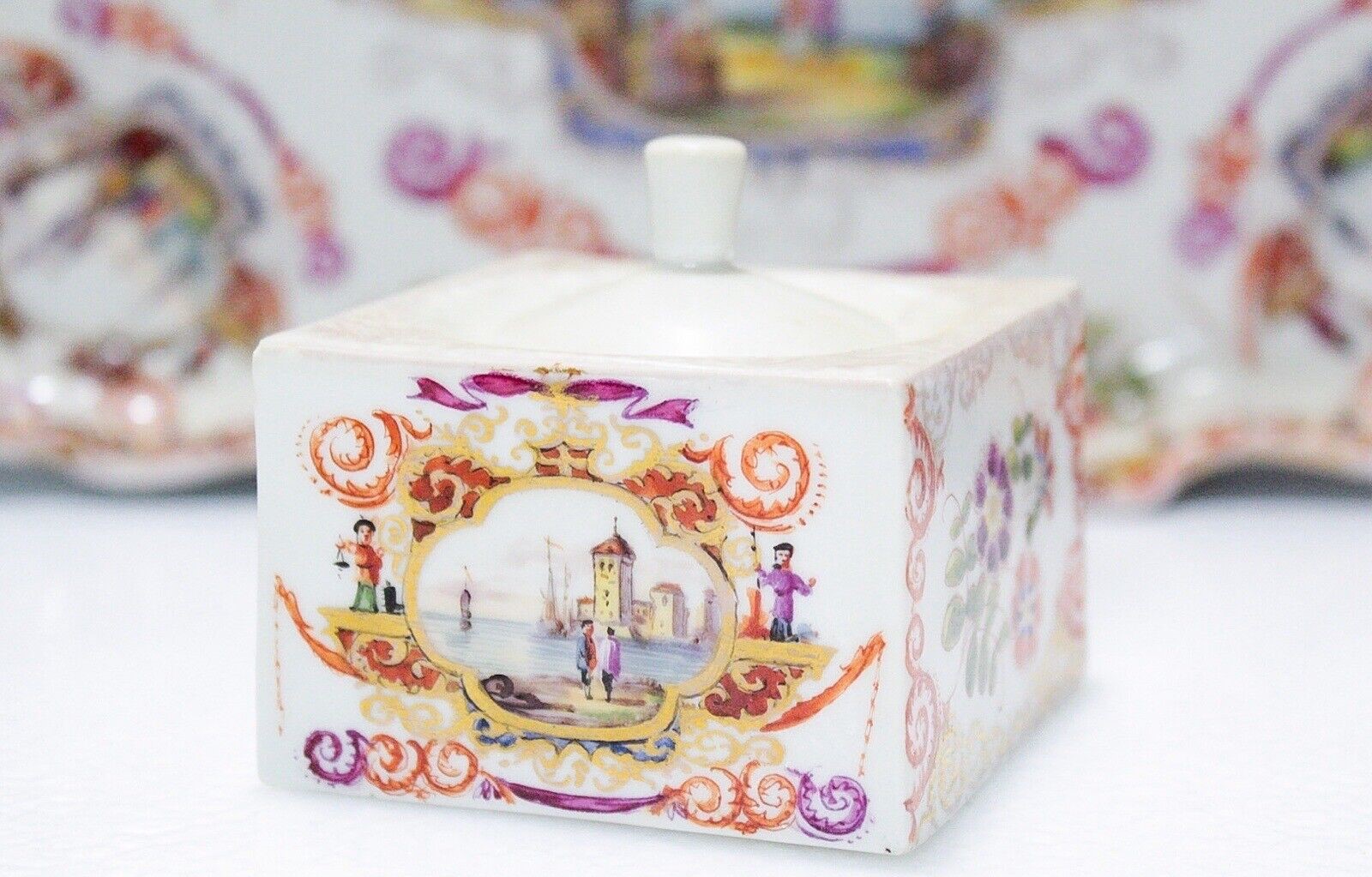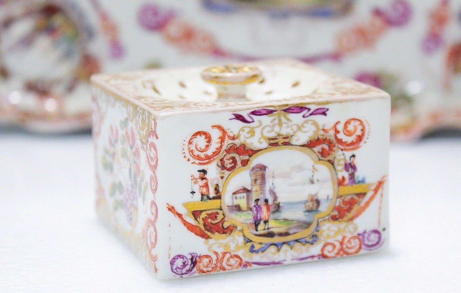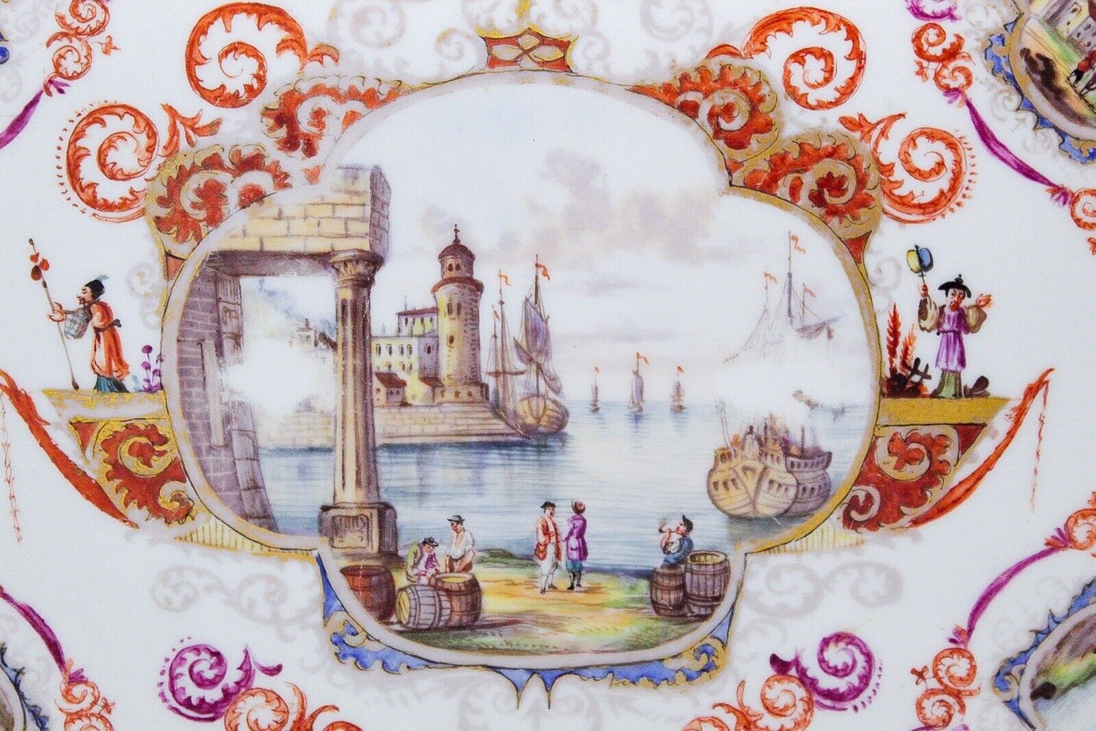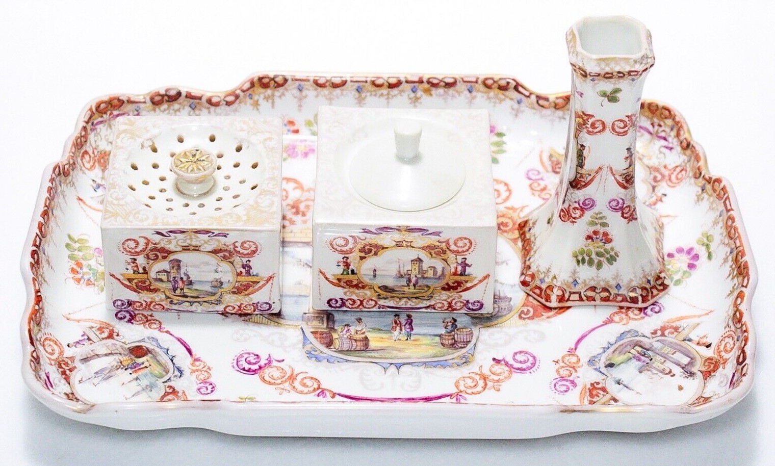 This porcelain set consists of a tray with an inkwell, sander, and vase, which feature harbor scenes with ships and merchants along the banks – tiny paintings with deep perspective.