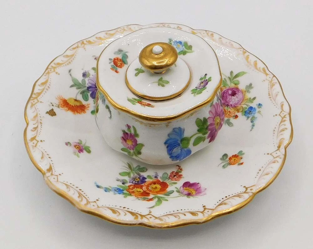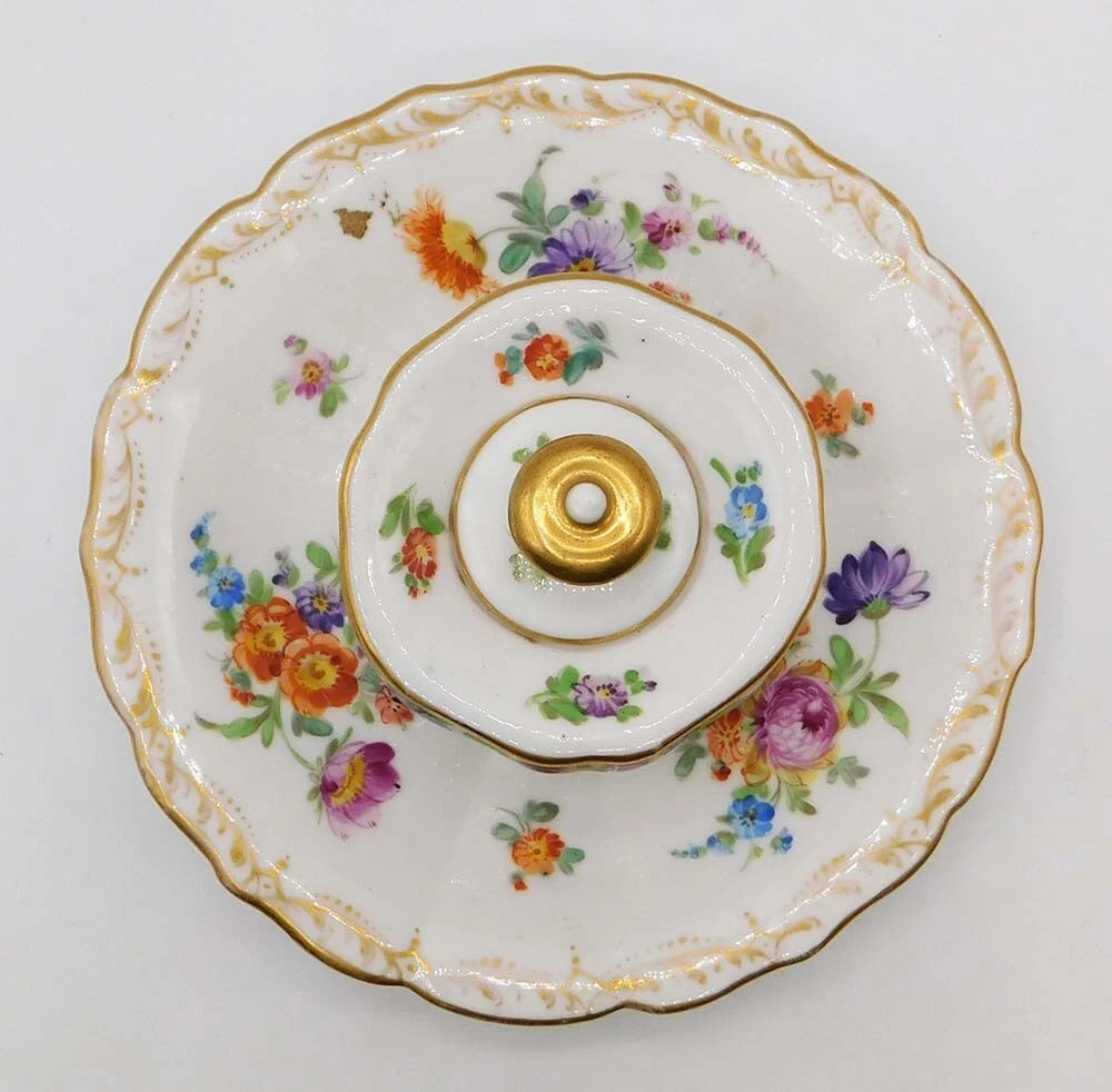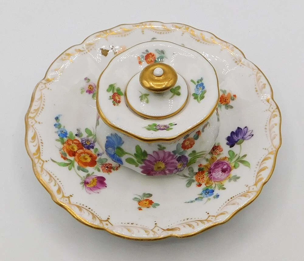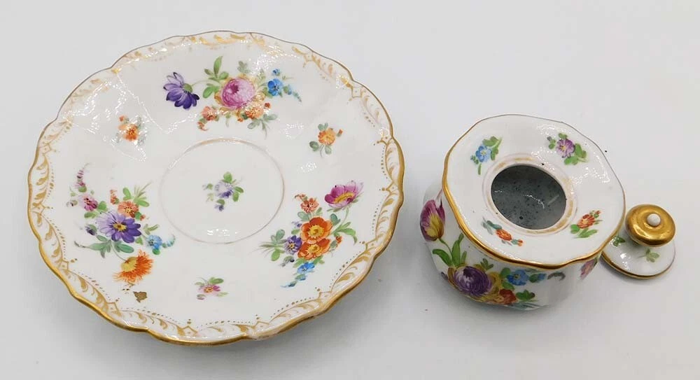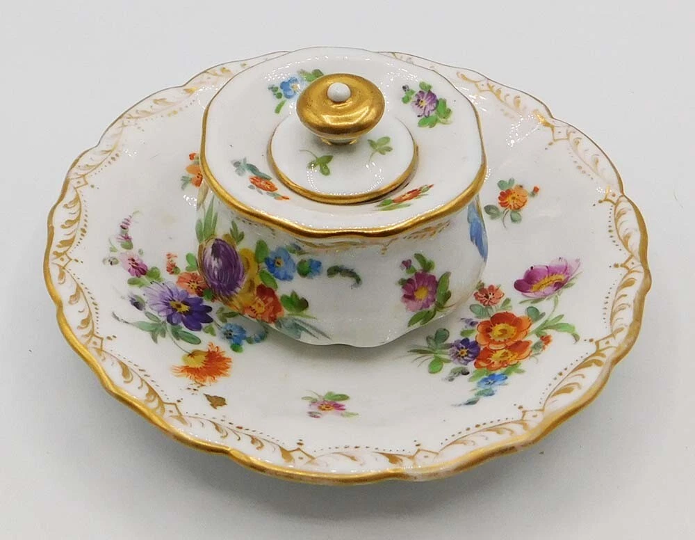 The inkwell is crafted from fine white porcelain and features a central ink pot, accompanied by an integrated tray. It is decorated in the classic “Dresden floral” style, characterized by: