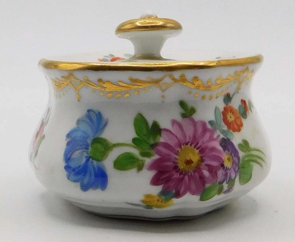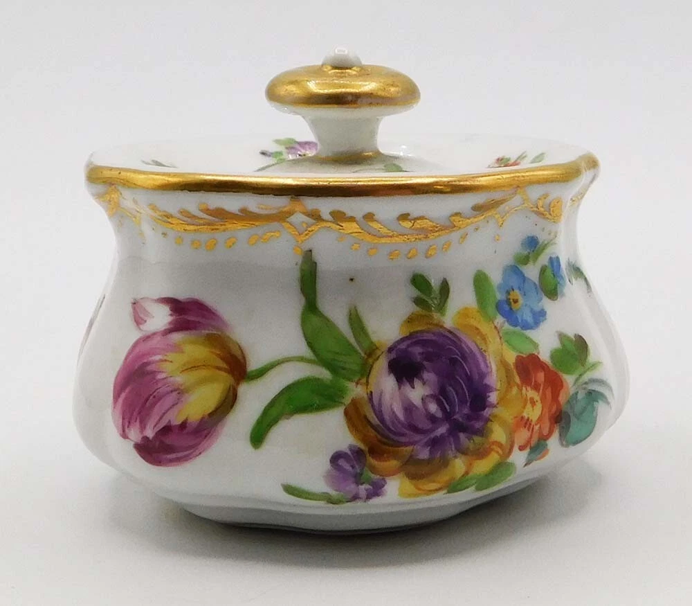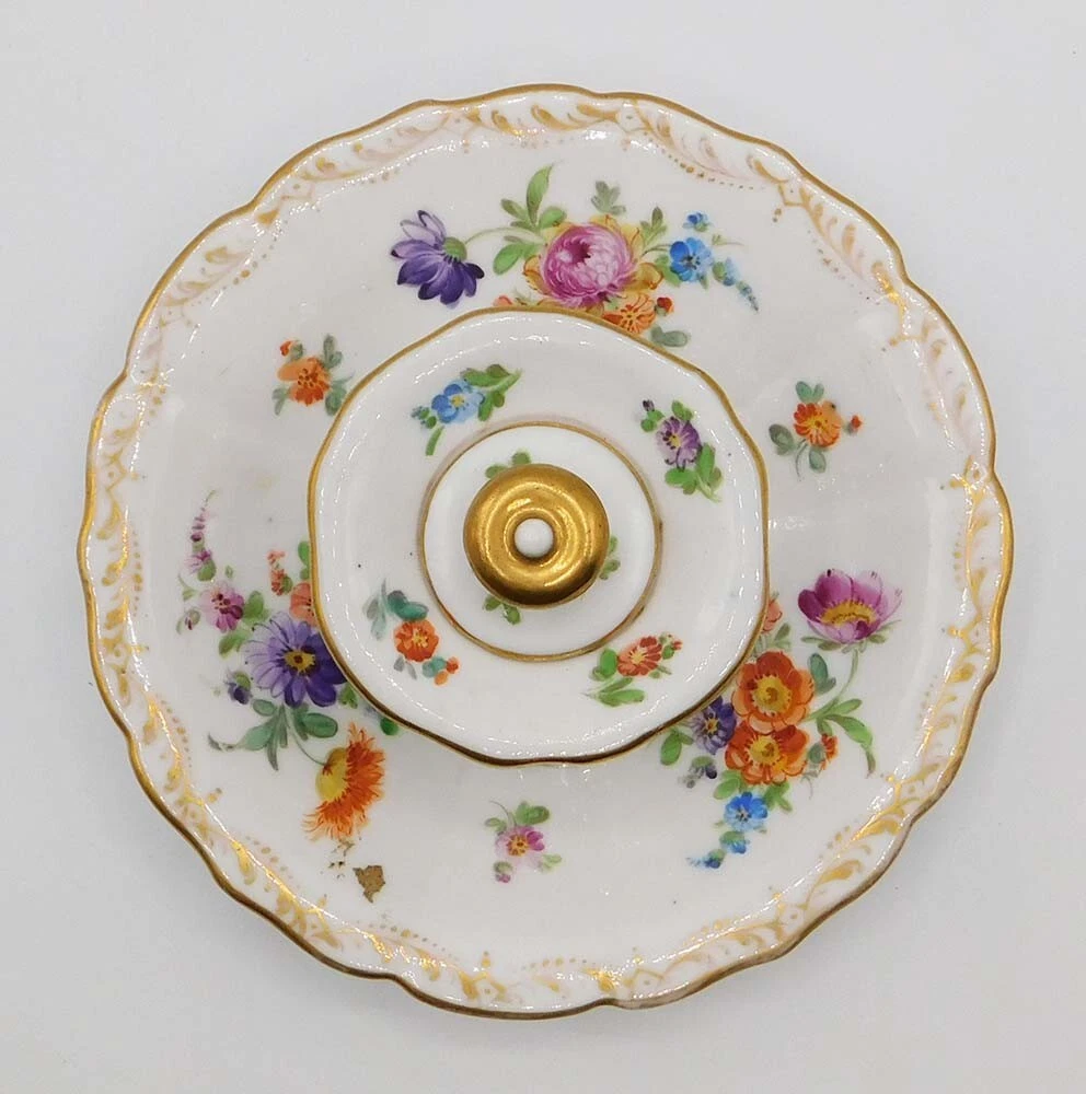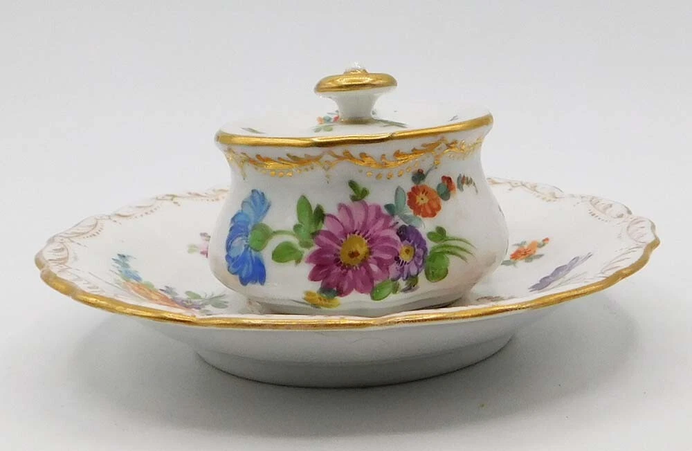 The inkwell is crafted from fine white porcelain and features a central ink pot, accompanied by an integrated tray. It is decorated in the classic “Dresden floral” style, characterized by: