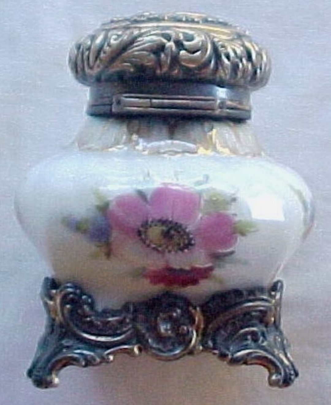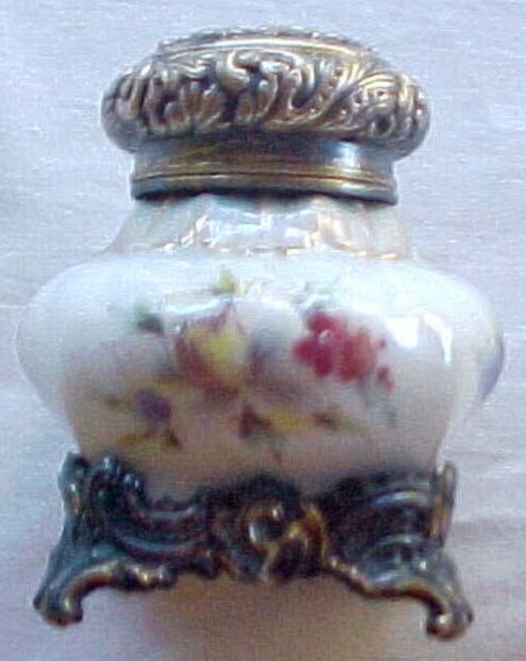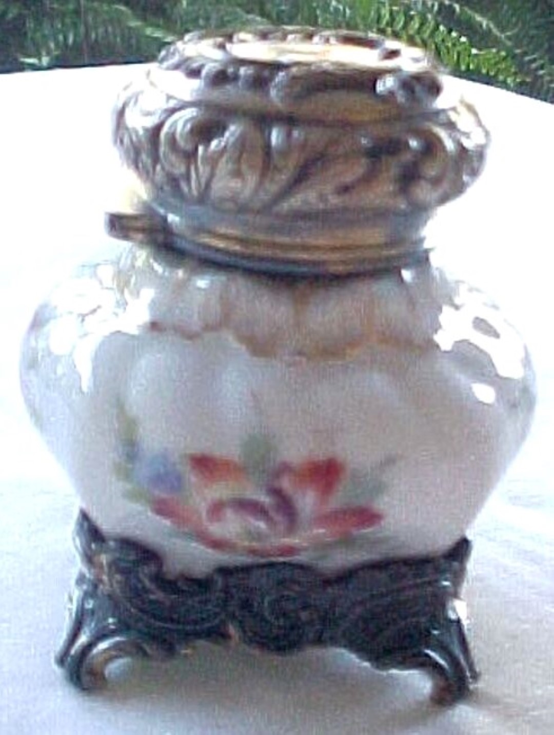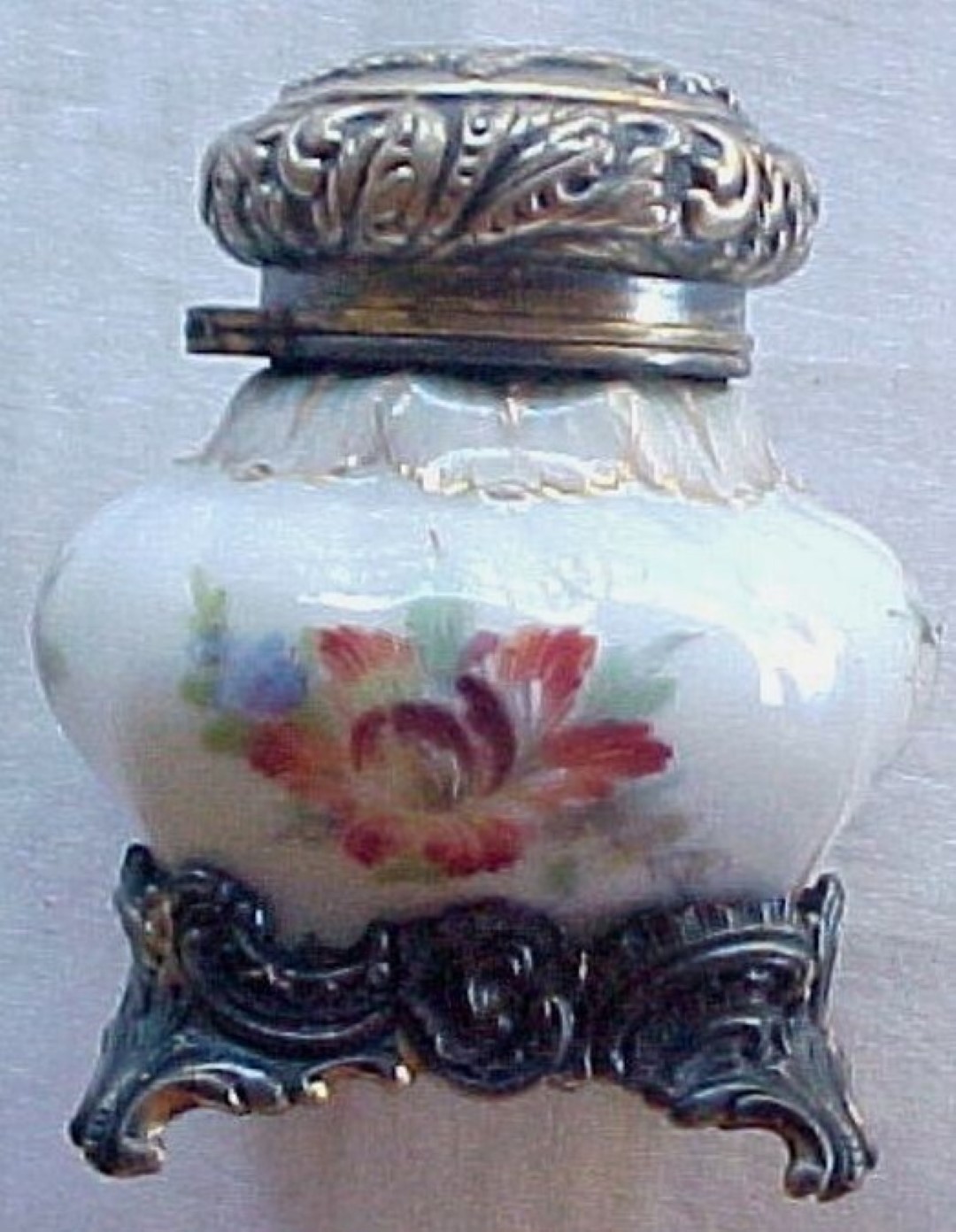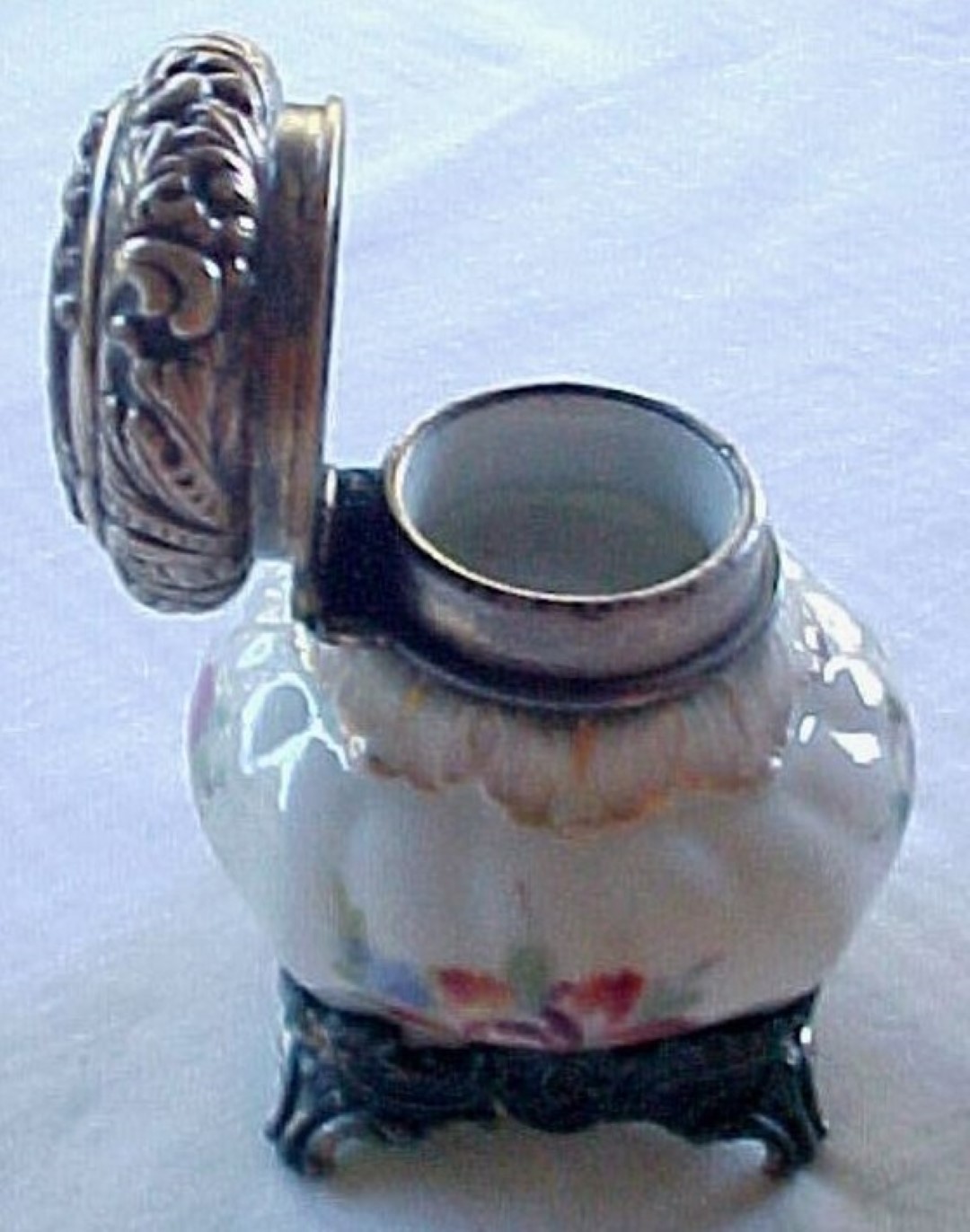 A porcelain inkwell with a bulbous, rounded shape is adorned with hand painted flowers. It has a Dresden mark. The sterling silver repoussé lid has a monogram. The inkwell sits on a four-legged silver base (marked “sterling”).