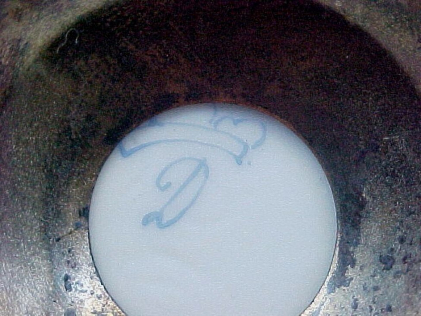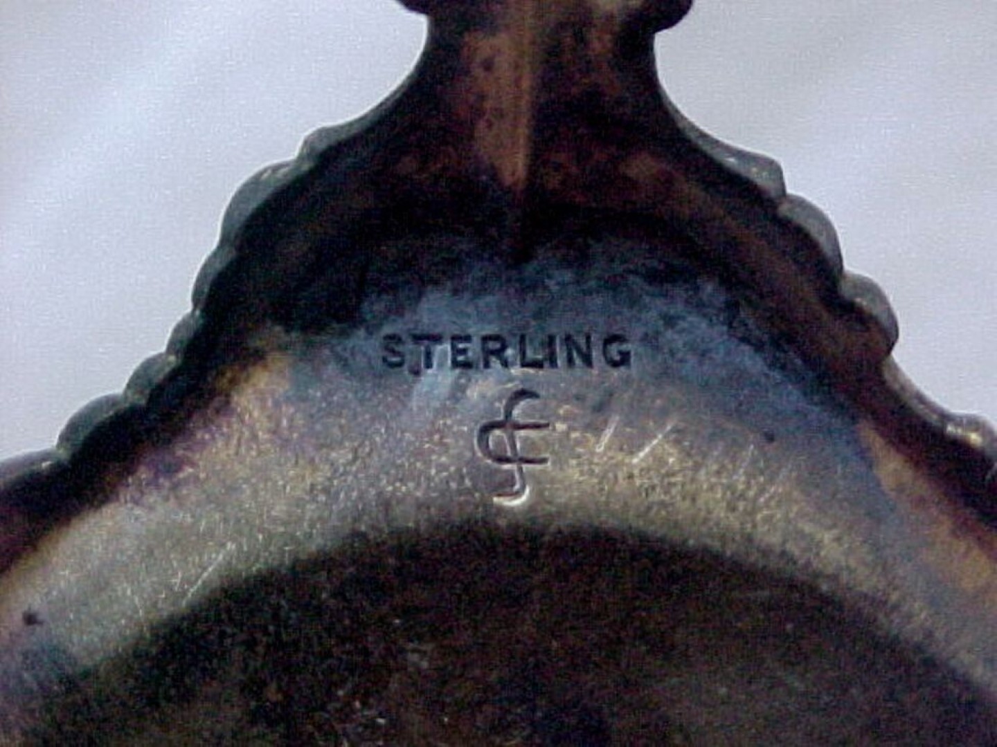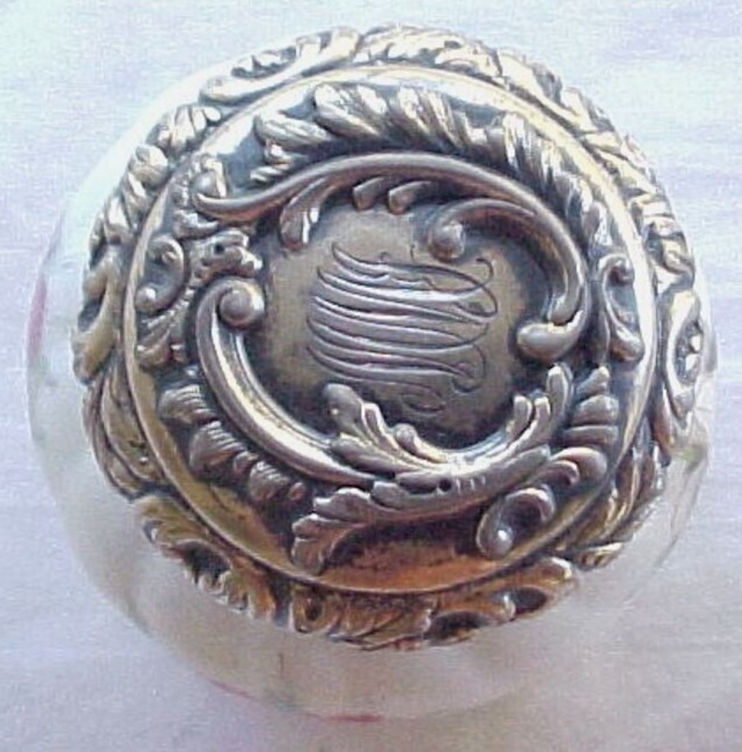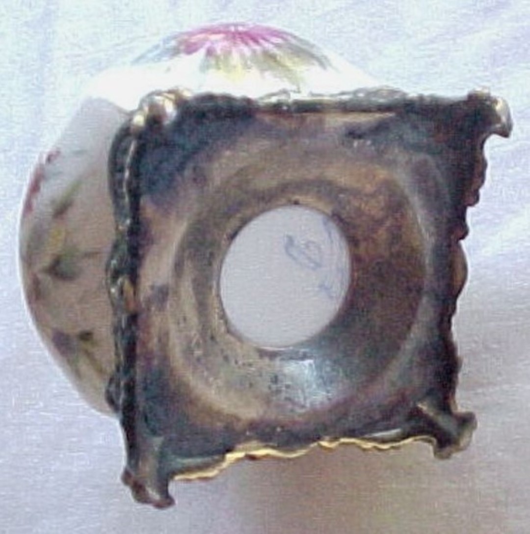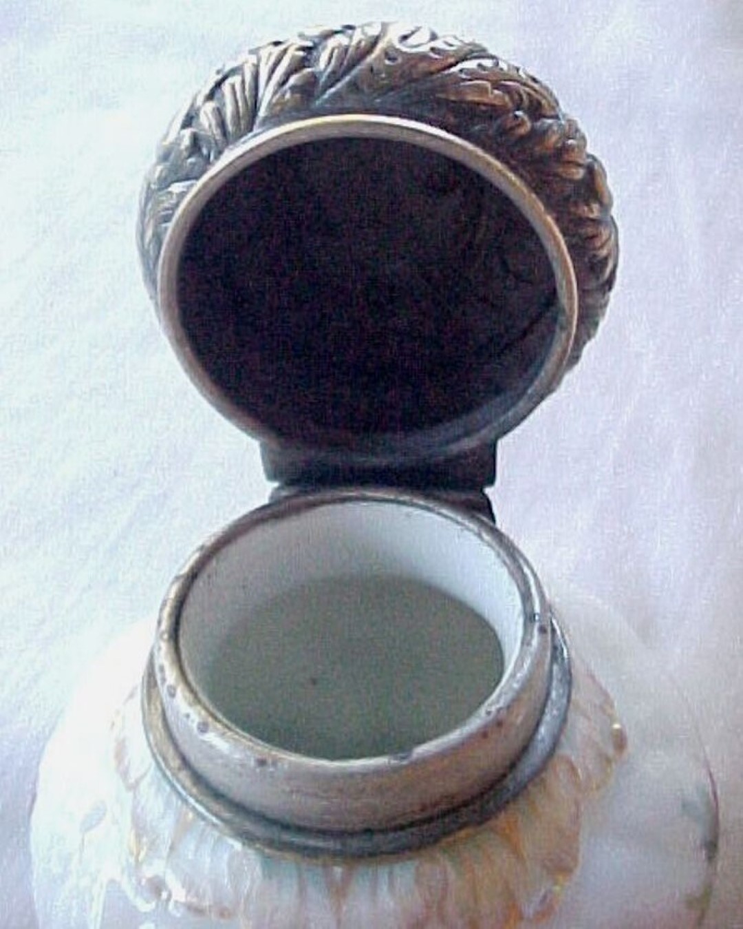 A porcelain inkwell with a bulbous, rounded shape is adorned with hand painted flowers. It has a Dresden mark. The sterling silver repoussé lid has a monogram. The inkwell sits on a four-legged silver base (marked “sterling”).