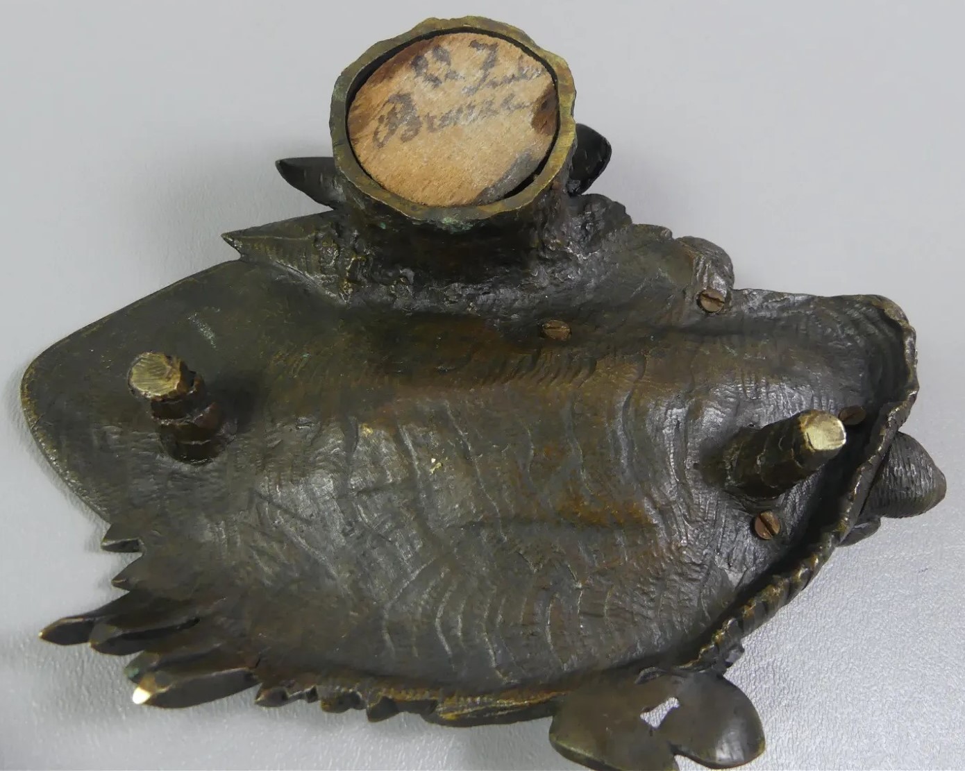 A bronze inkstand in the form of a pond inhabited by two ducks and a frog flanking a cut glass inkwell with an unattached lid with a beetle finial.