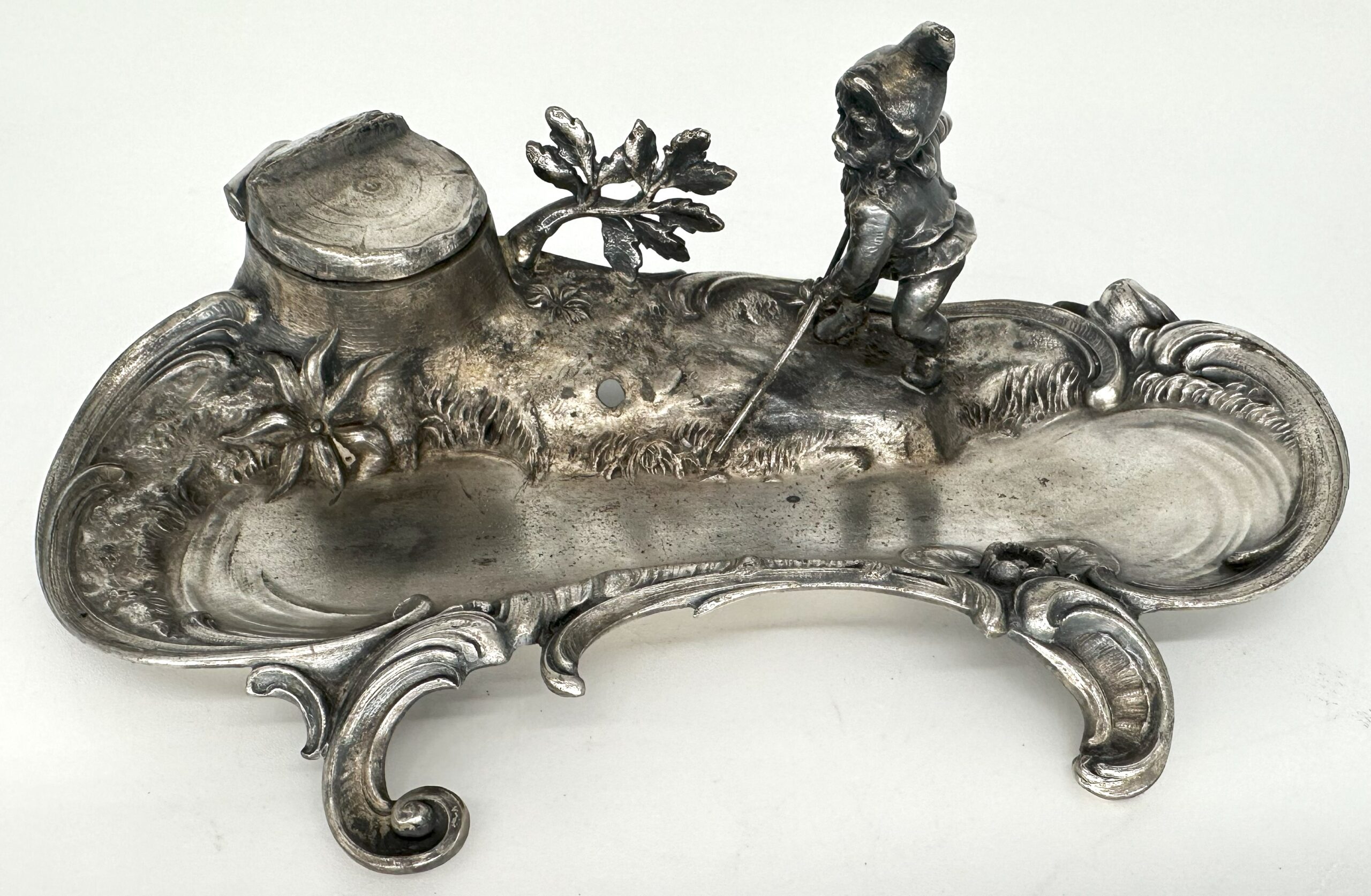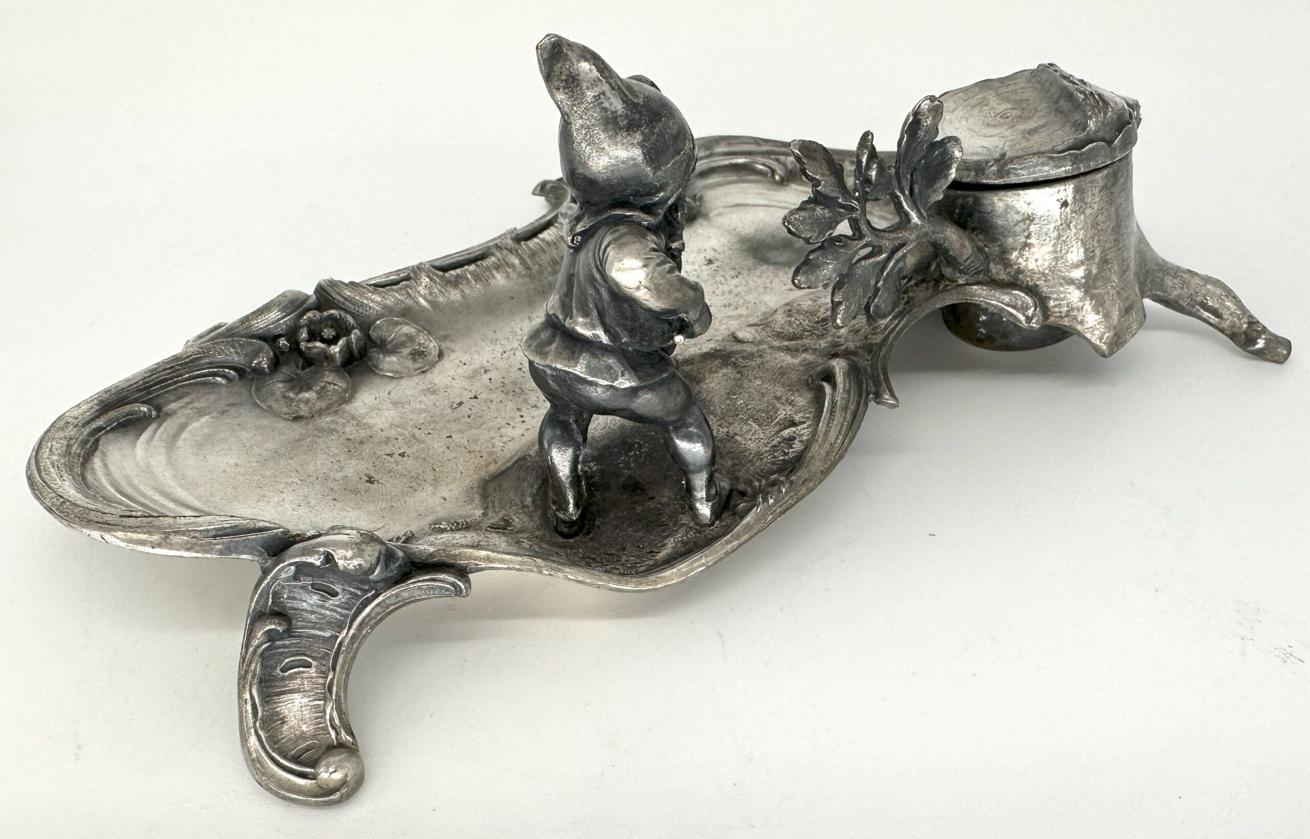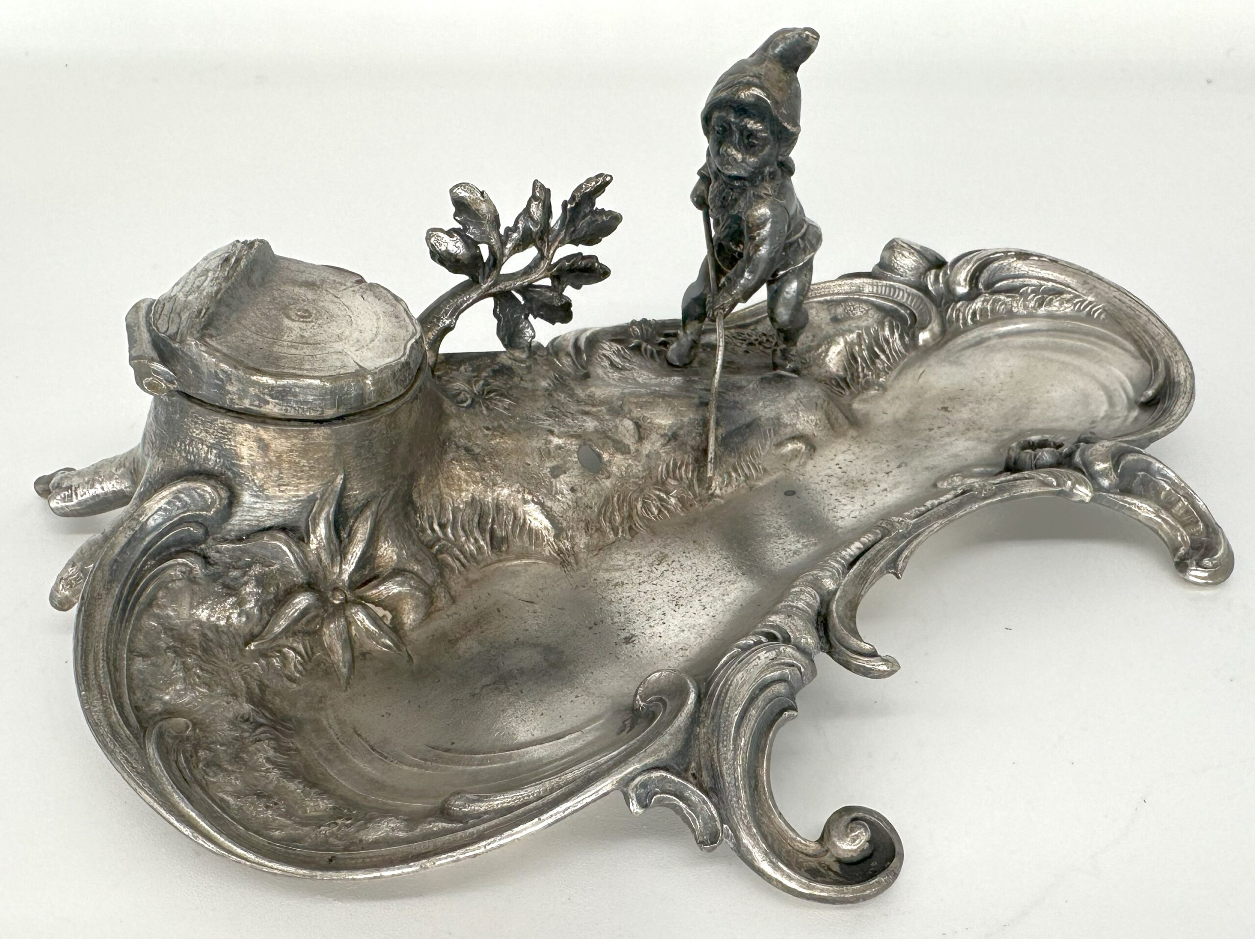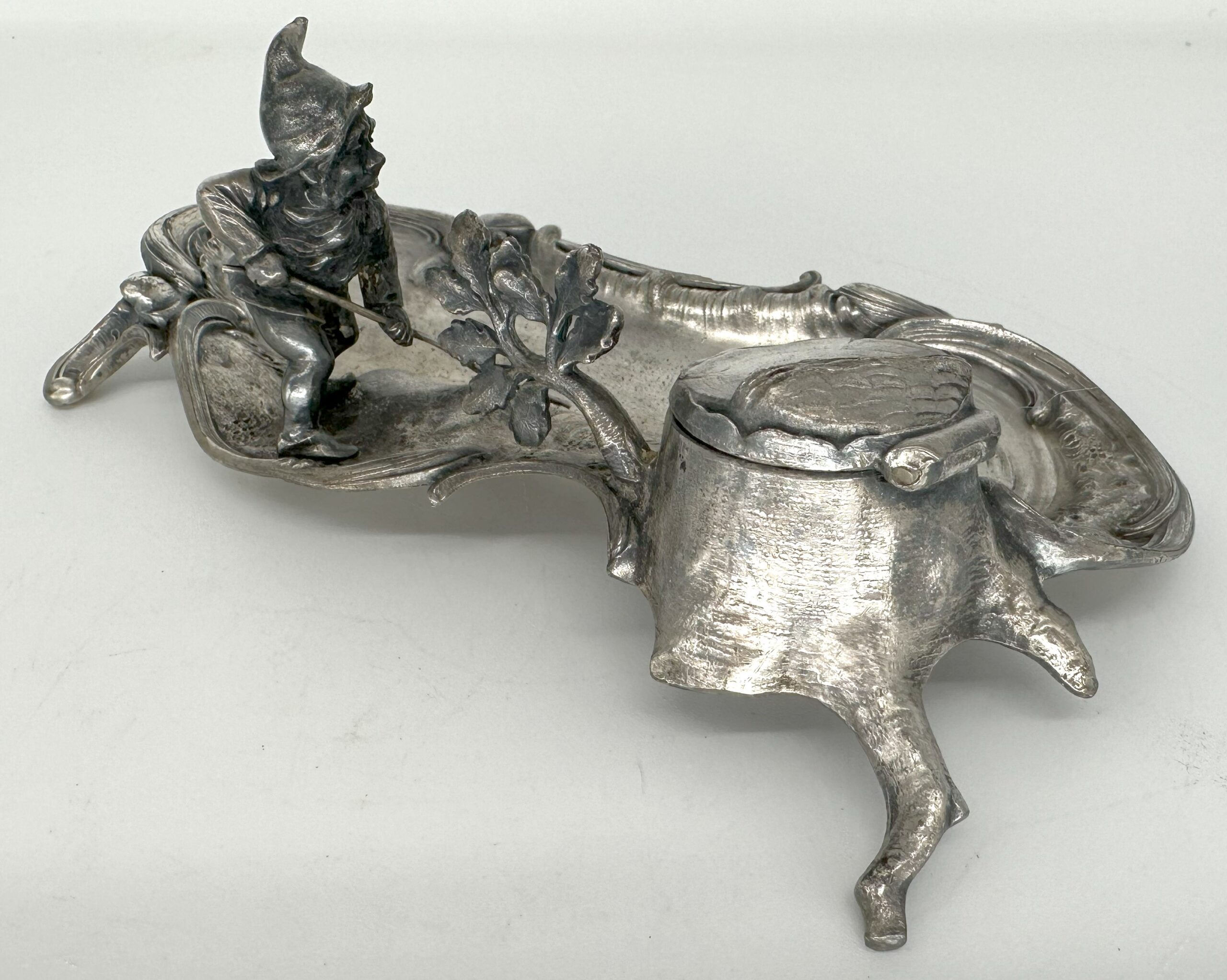 A dwarf (or gnome) stands by a pond, holding a stick to the water. The dwarf’s outfit is detailed, from the hat to his top completed with the scarf he is wearing around his neck. Next to the dwarf is a tree stump (the top is a lid) that houses the inkwell. The pond is decorated with flowers, grass, and a leafy branch. The bottom of the inkwell is marked: WMFB OX.
