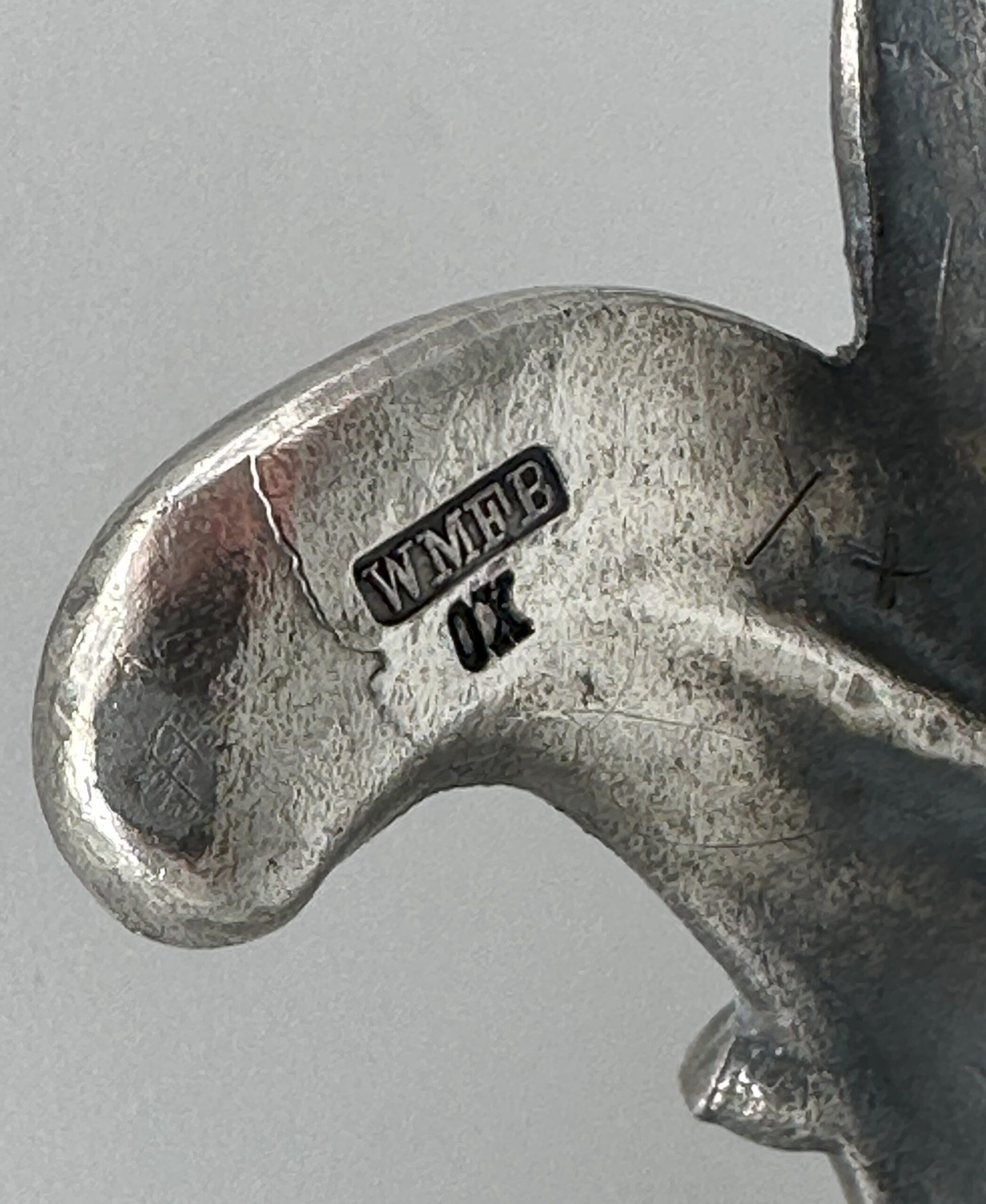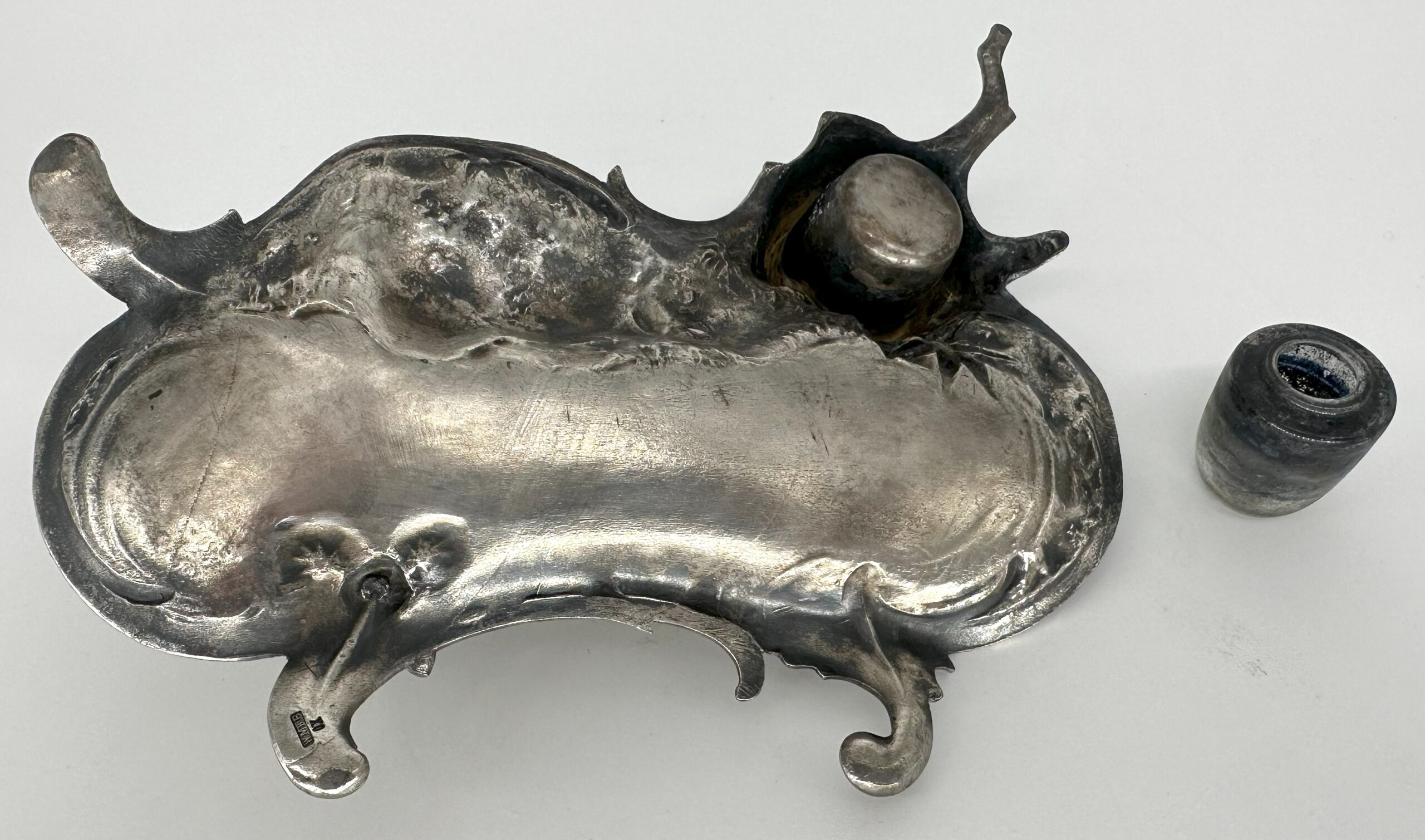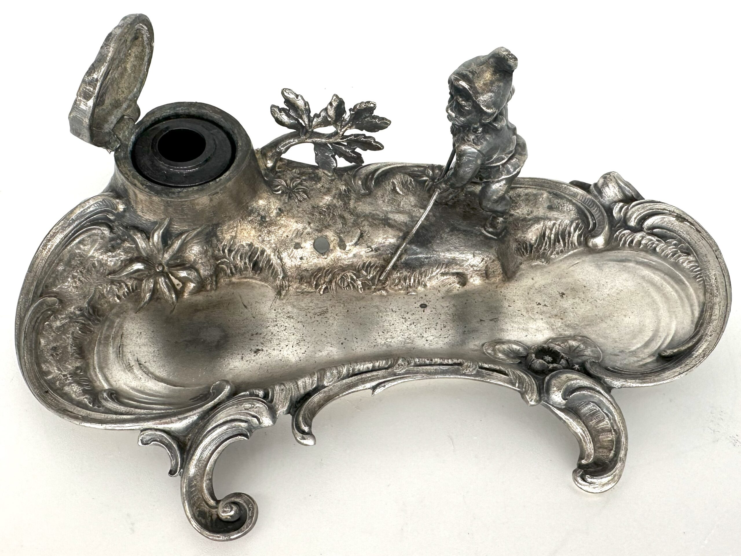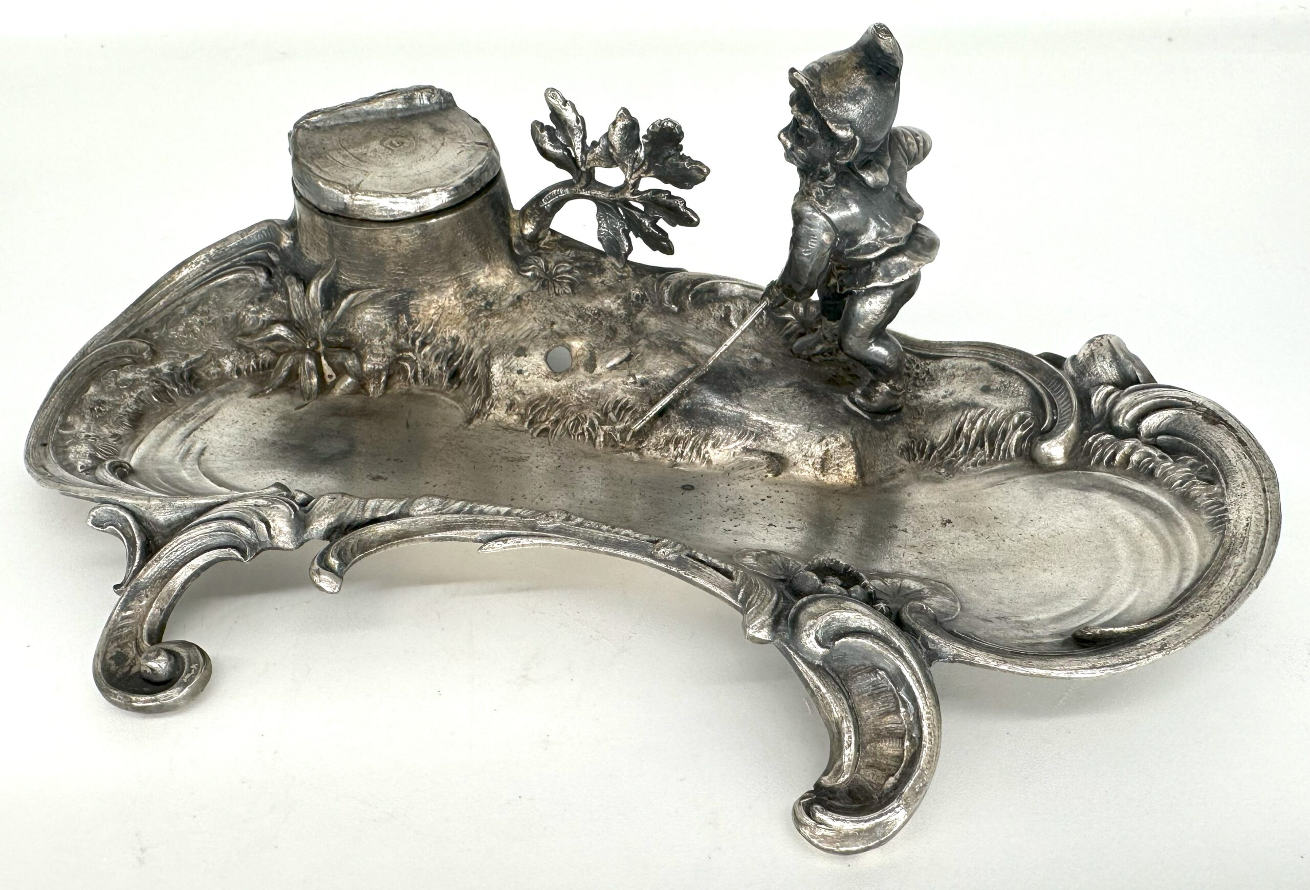 A dwarf (or gnome) stands by a pond, holding a stick to the water. The dwarf’s outfit is detailed, from the hat to his top completed with the scarf he is wearing around his neck. Next to the dwarf is a tree stump (the top is a lid) that houses the inkwell. The pond is decorated with flowers, grass, and a leafy branch. The bottom of the inkwell is marked: WMFB OX.