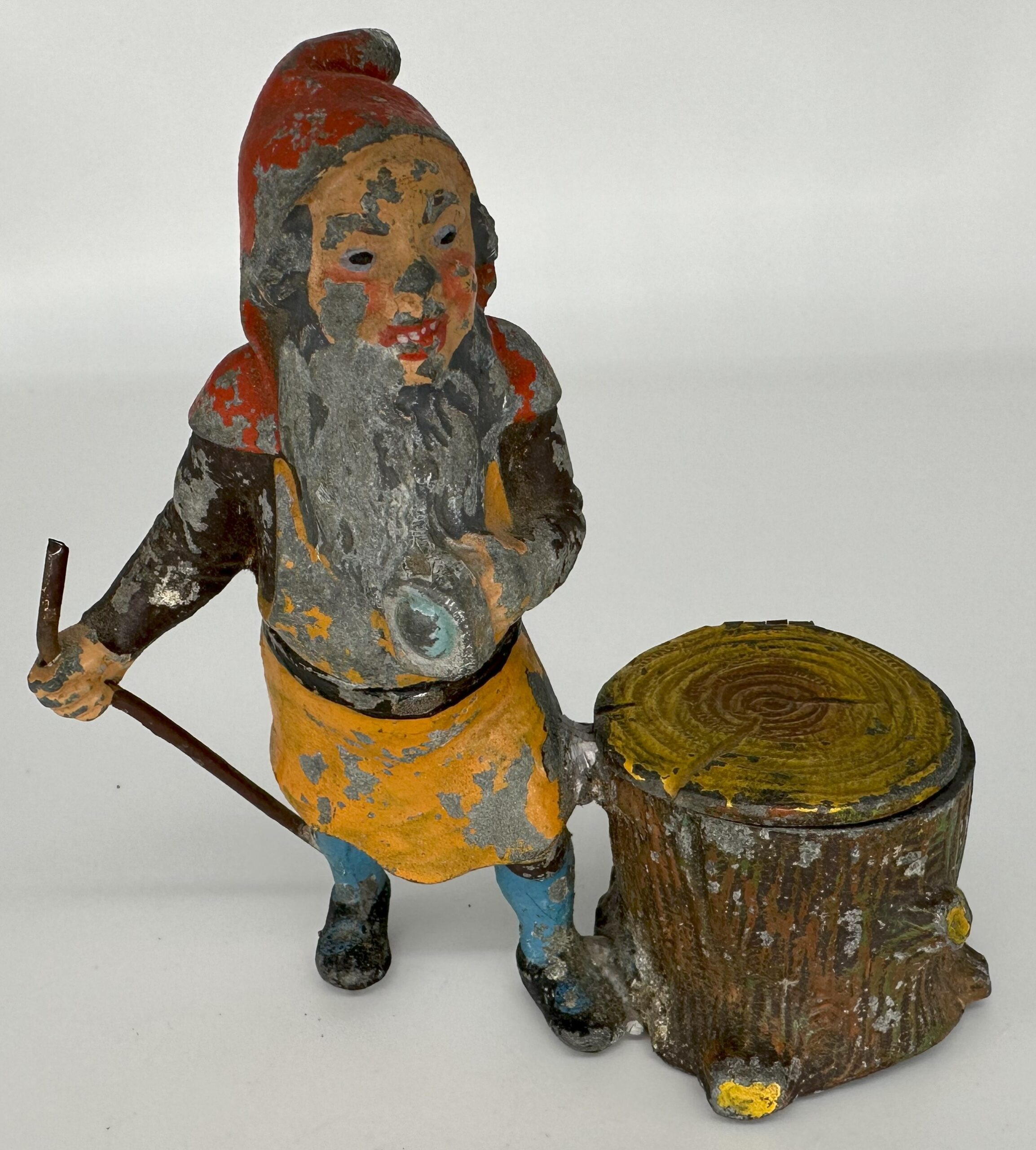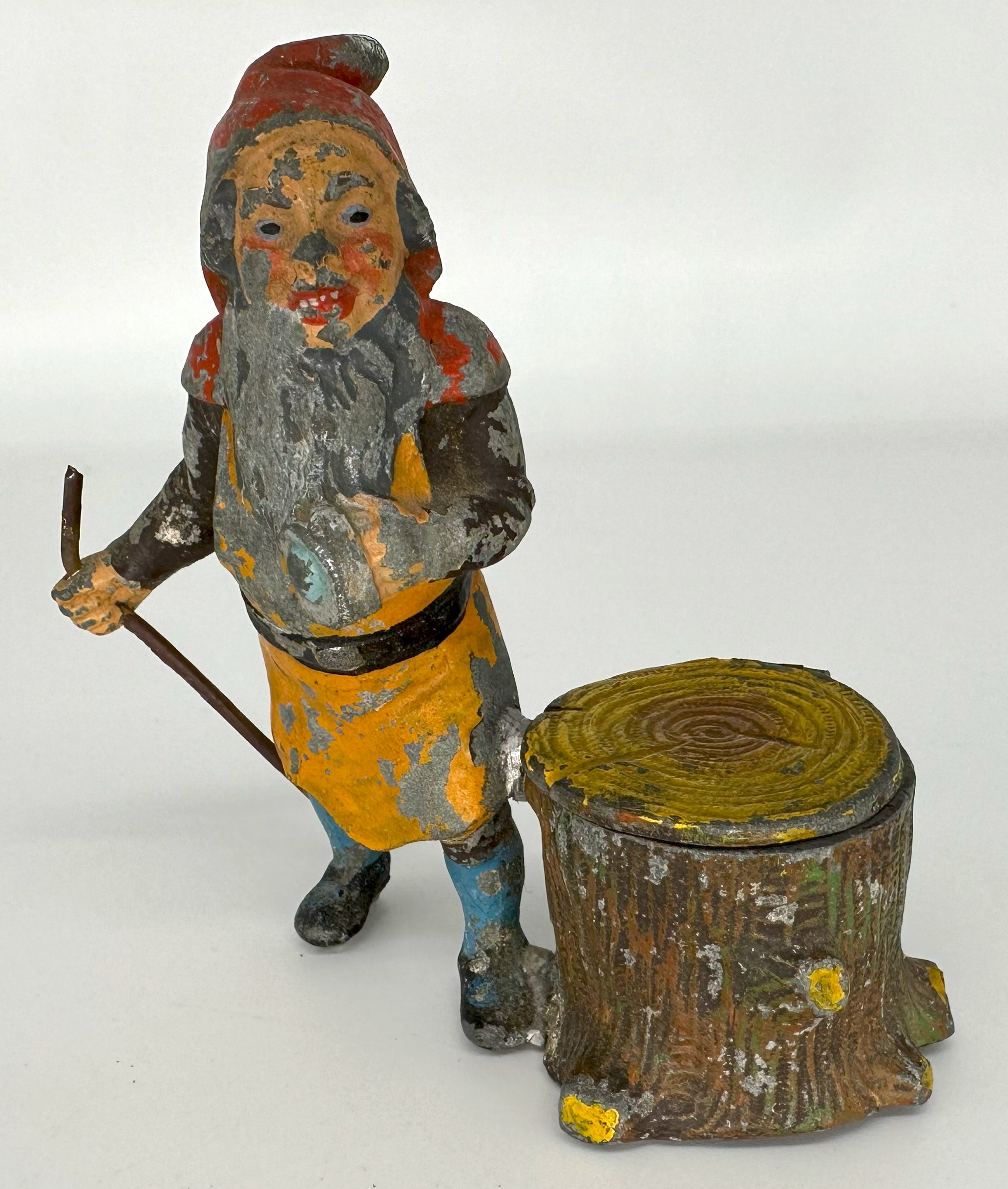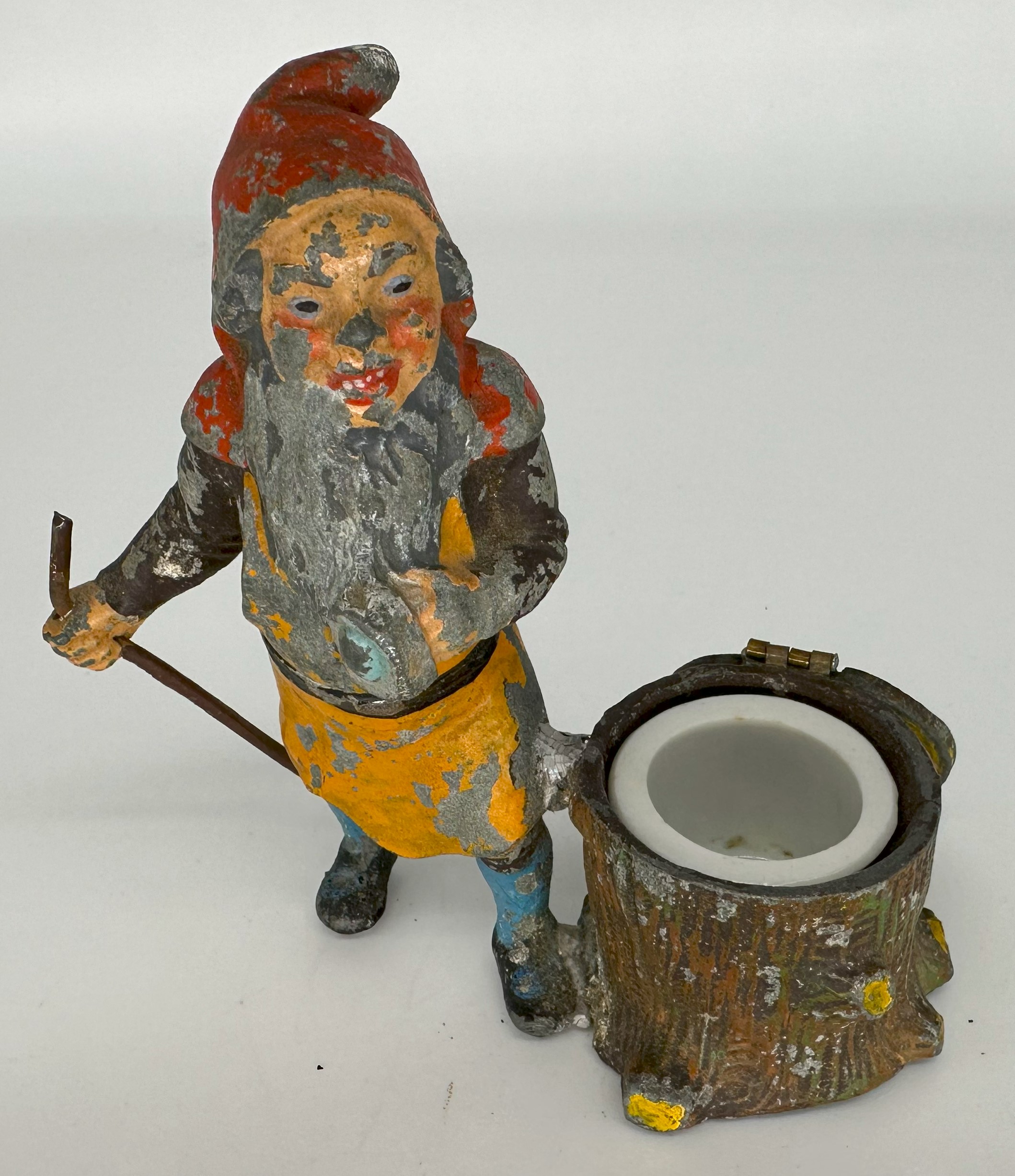 This cold-painted metal Dwarf (or Gnome) stands next to a stump with a hinged lid which opens to access the inkwell.