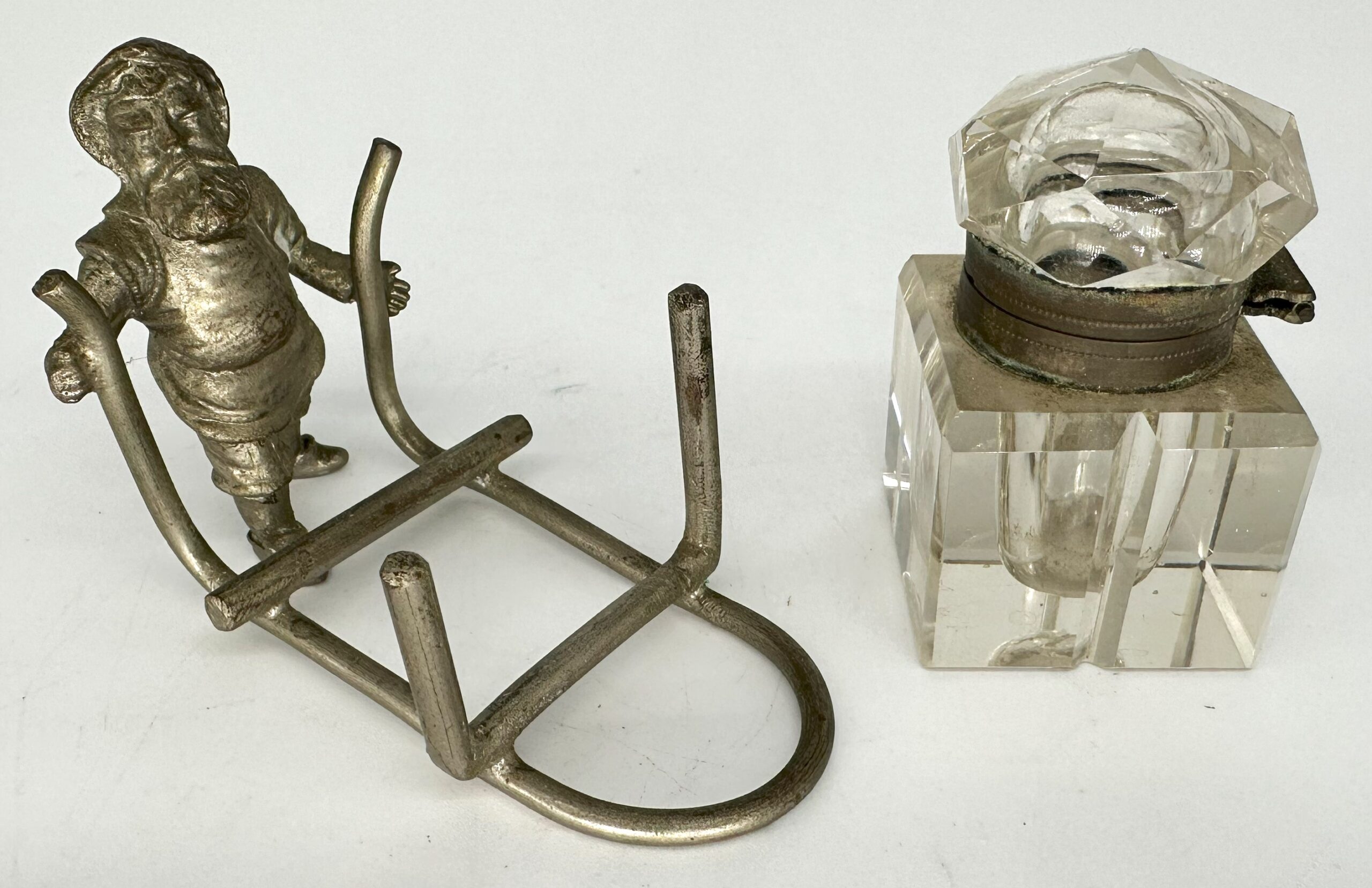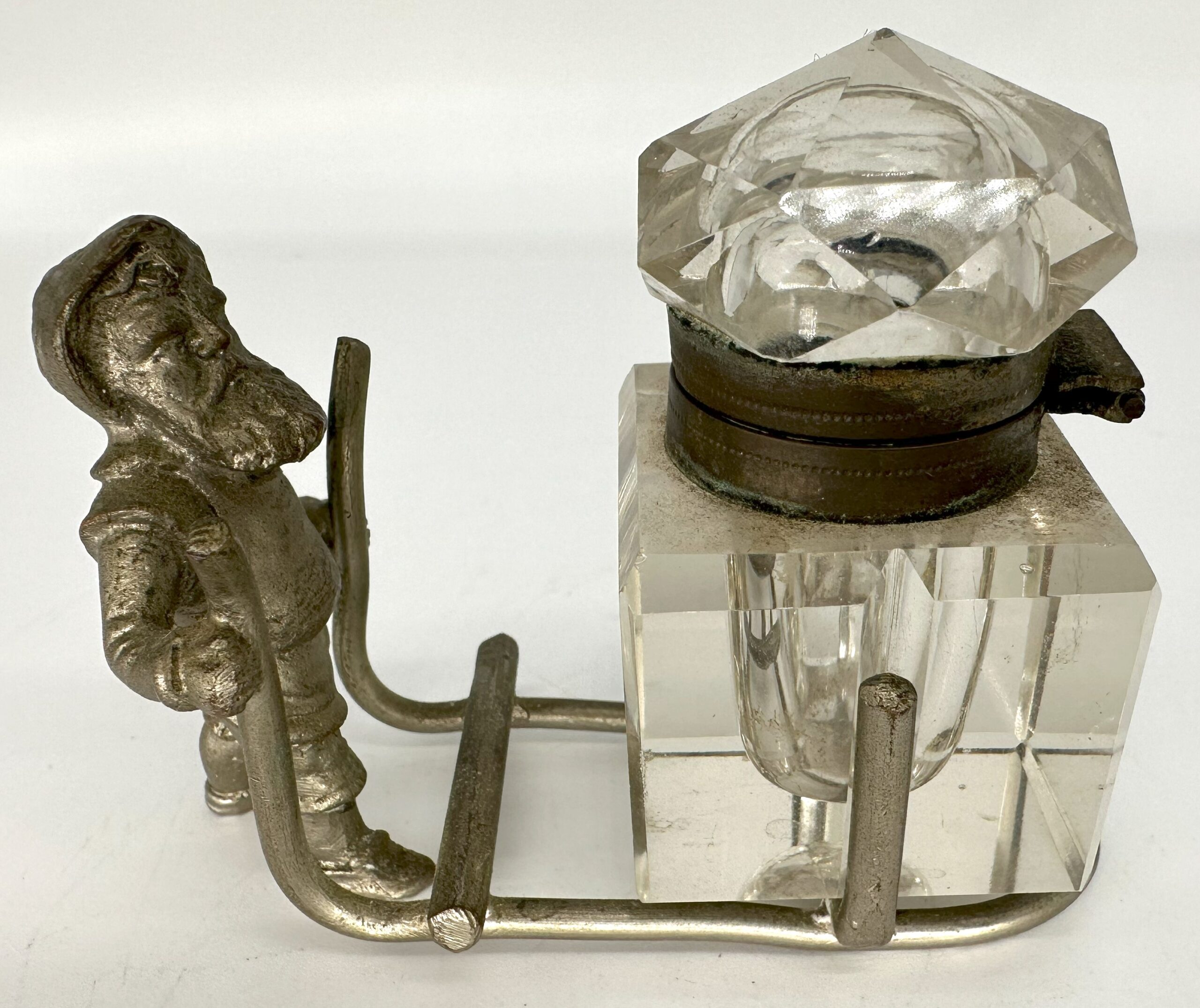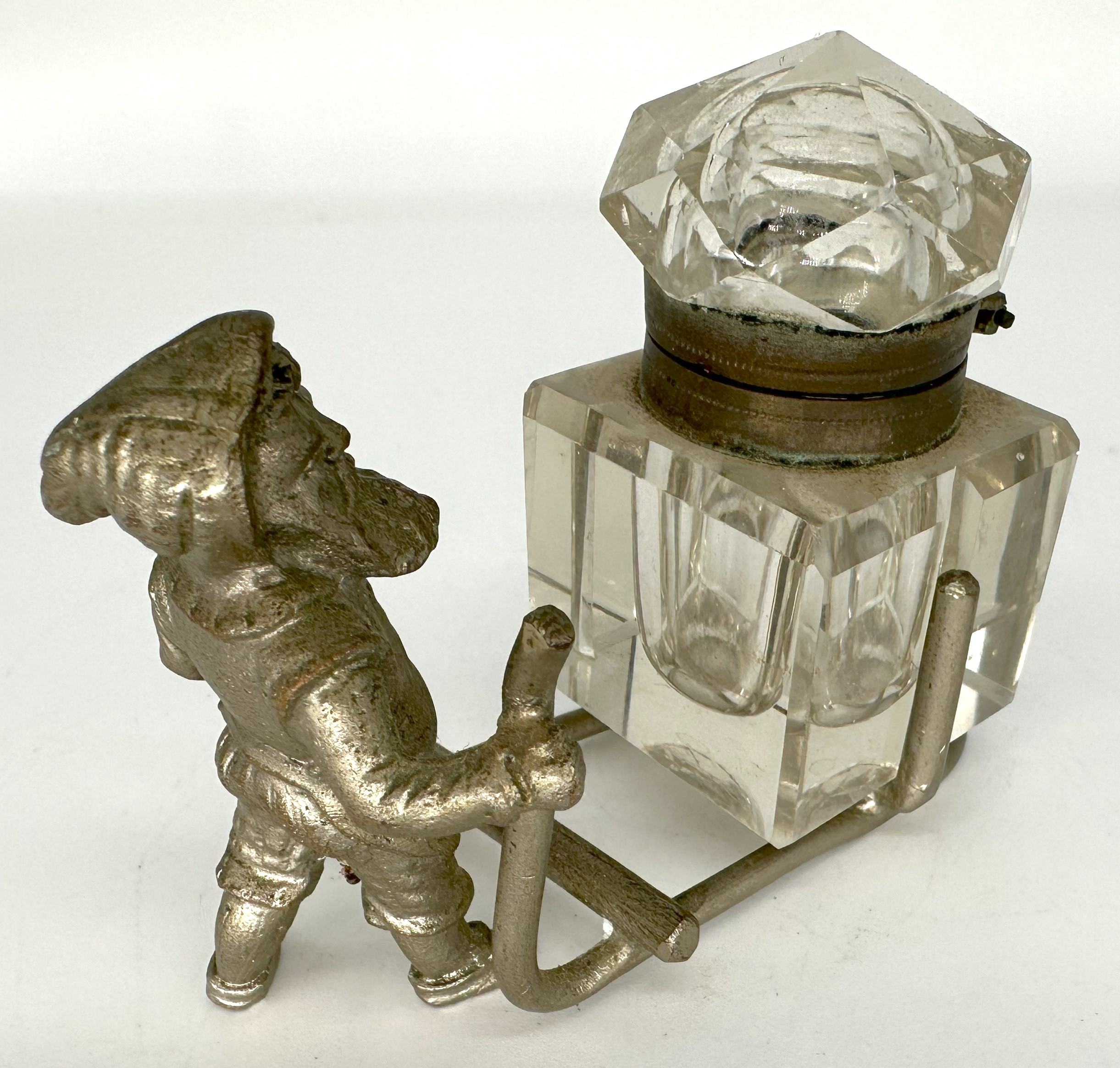 A dwarf pushes a brass cart (or sled) holding a cut glass inkwell with groves to fit into the cart.