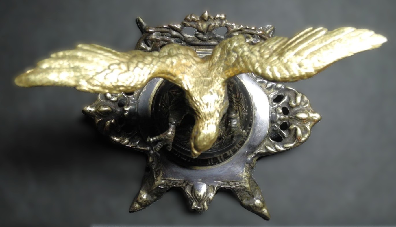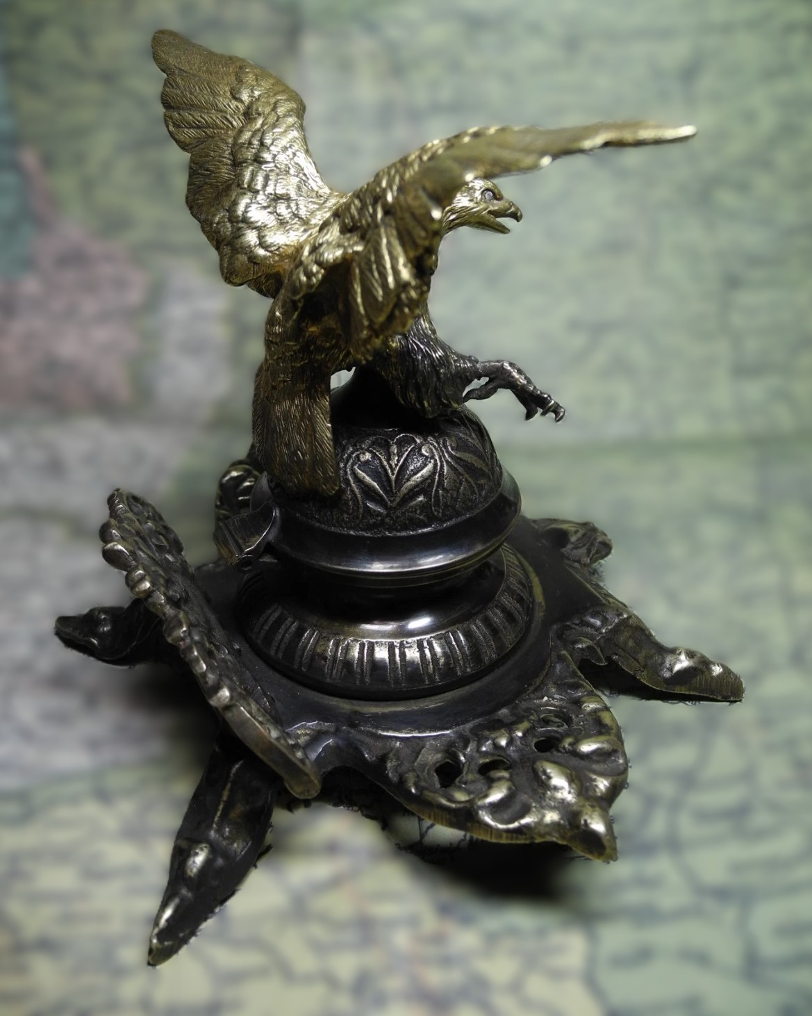 Here is how an eBay seller out of Ukraine described this inkwell: “A rare antique bronze inkwell WWI, which belonged to a regimental clerk in the Kaiser’s army. Bronze. In excellent condition. Patinated. The lid features a bronze sculpture of a soaring eagle (Very beautiful and detailed. The eagle’s eyes are made of crystal). Large and prestigious. Opens and closes easily. Would look great in a collection of WWI memorabilia or on an antique desk.”